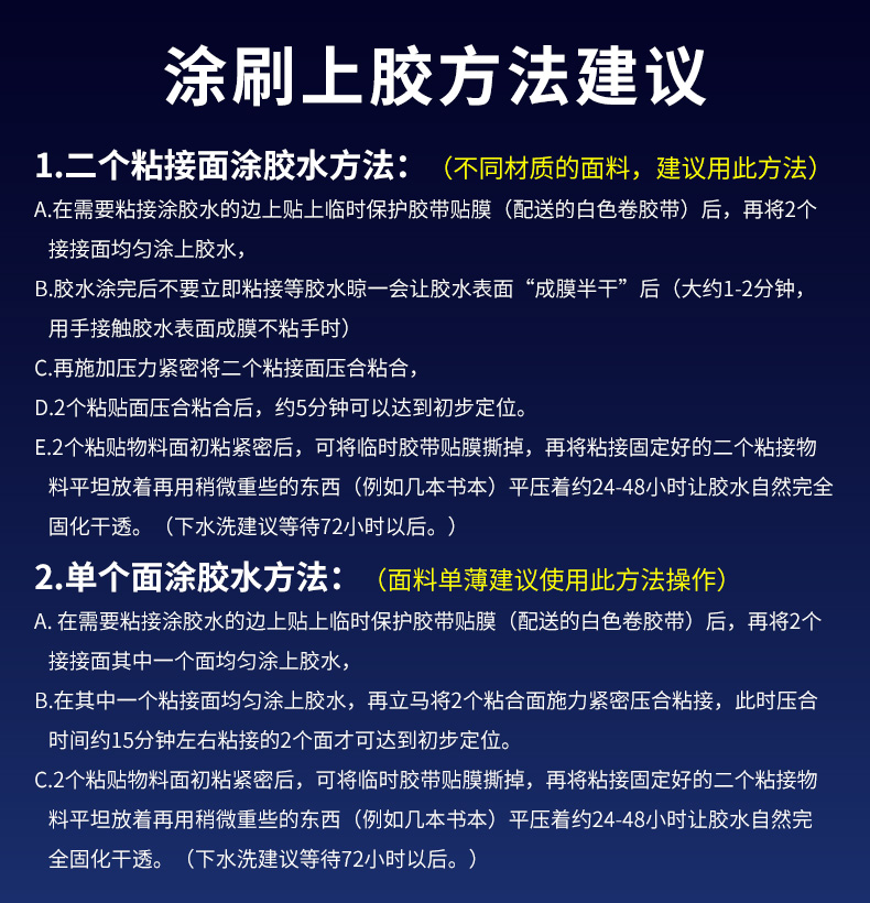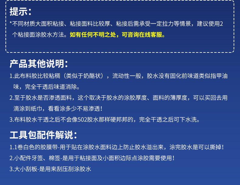 【赠送修补工具】布料专用胶水,主要用于布料,海绵,纺织品,布革等混合物料的粘接,高强度,高弹力性,耐水洗,高品质,值得信赖!【赠运费险】