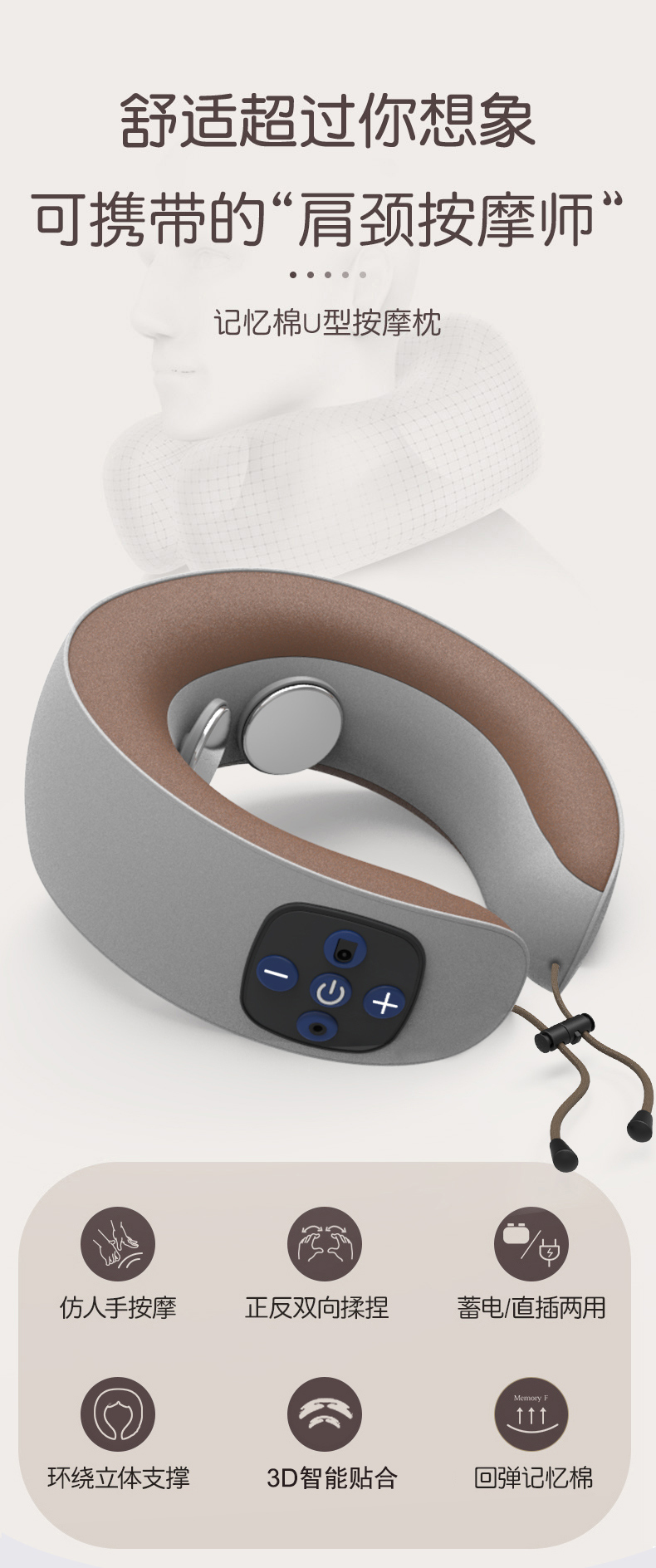 【店铺50元券】记忆棉U型按摩枕,正反方向按摩,环绕立体支撑,3D智能贴合,不落枕,孕妇可用,可感知的舒适感,充电管30天,礼盒装。