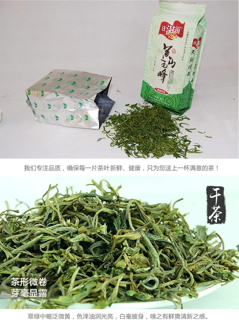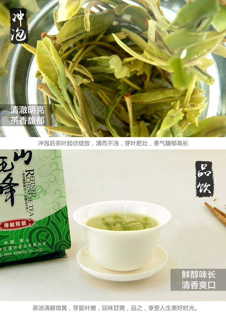 汪满田茶叶黄山毛峰新茶袋装100g绿茶安徽高山茶春茶散装野茶,冲泡后清澈明亮,茶香馥郁,回味甘爽。