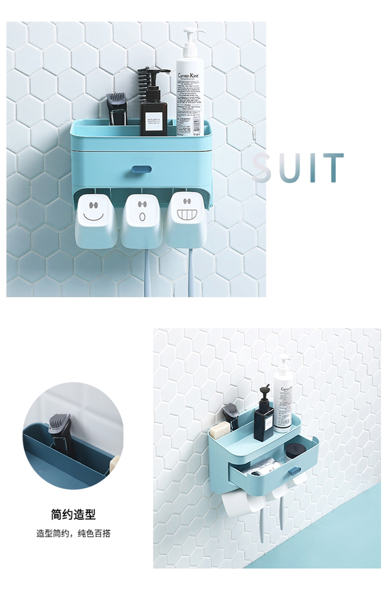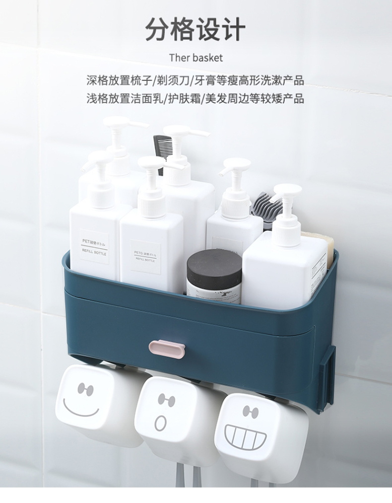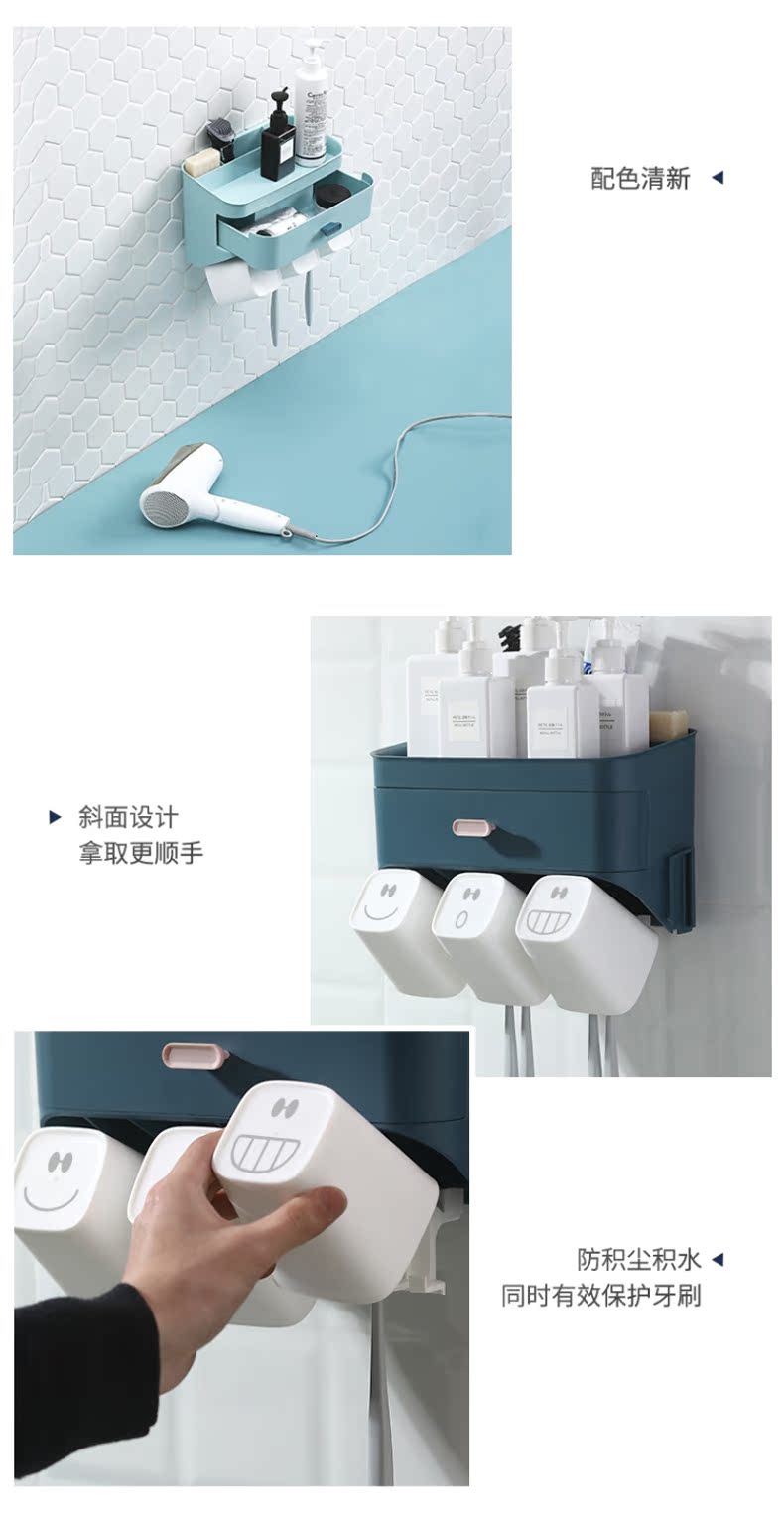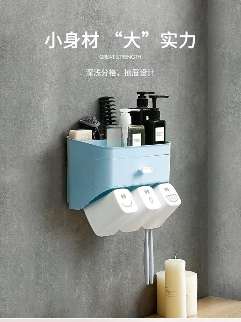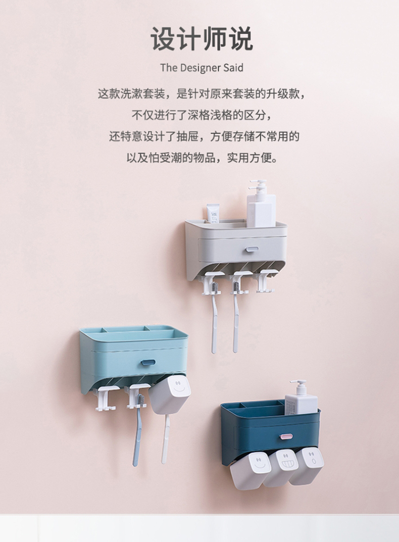 小身材,大实力,深浅分格设计,斜面拿取更顺手,沥水孔设计排水除湿便于清洗,独立牙刷架避免混放,免打孔设计安装简便,简约纯色,清新百搭
