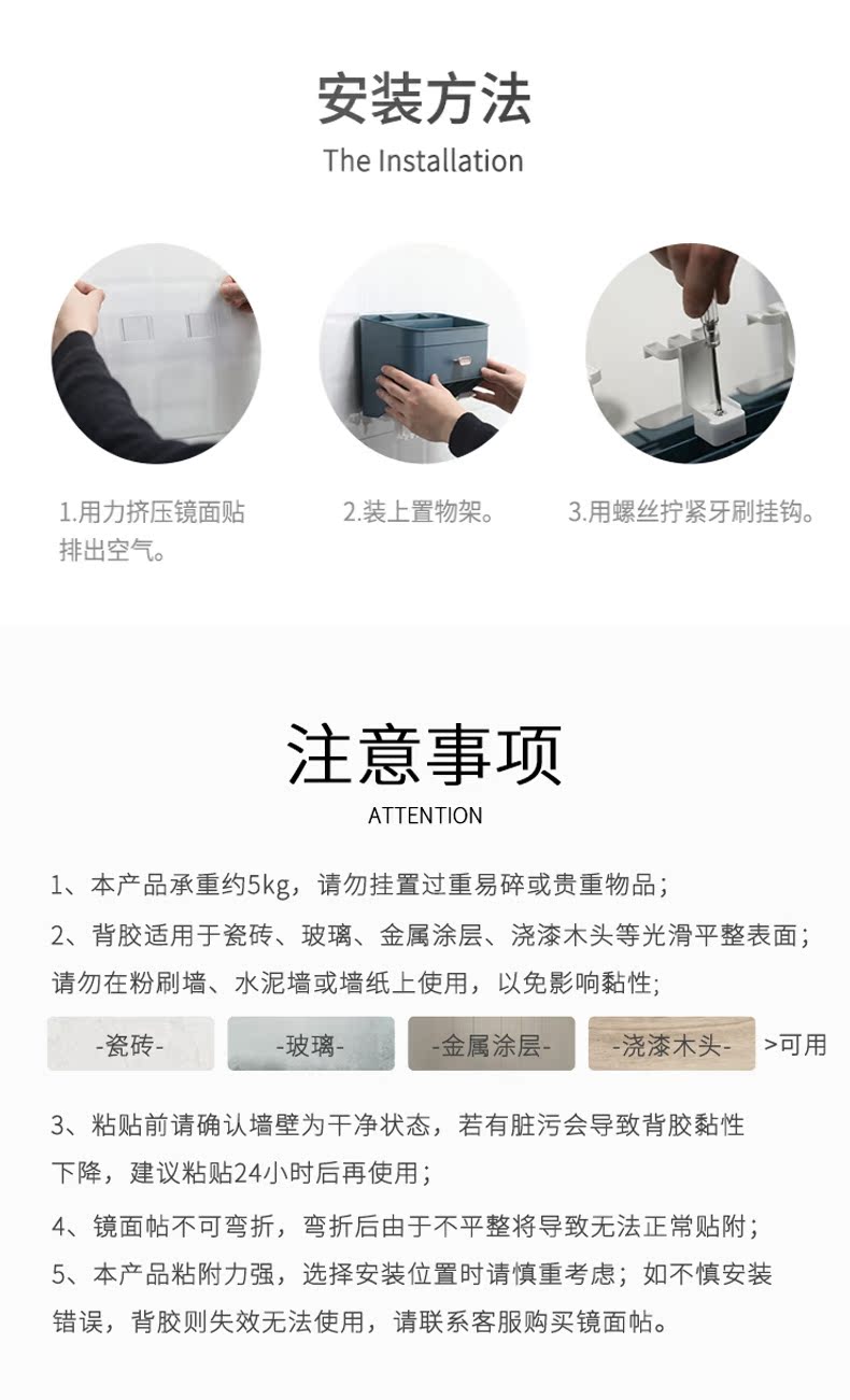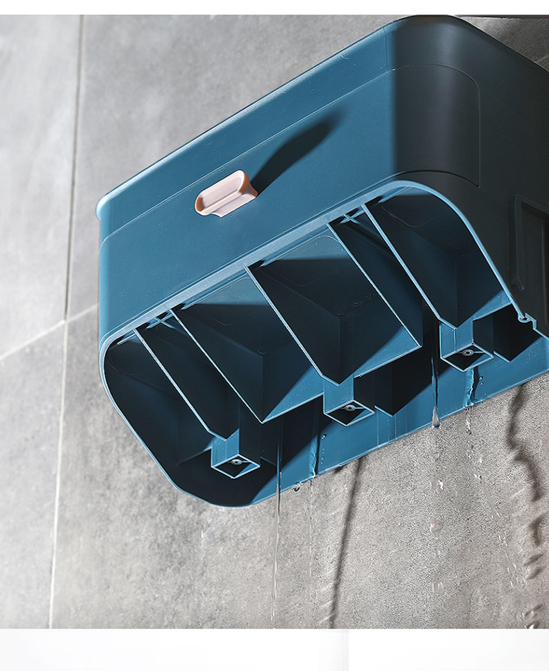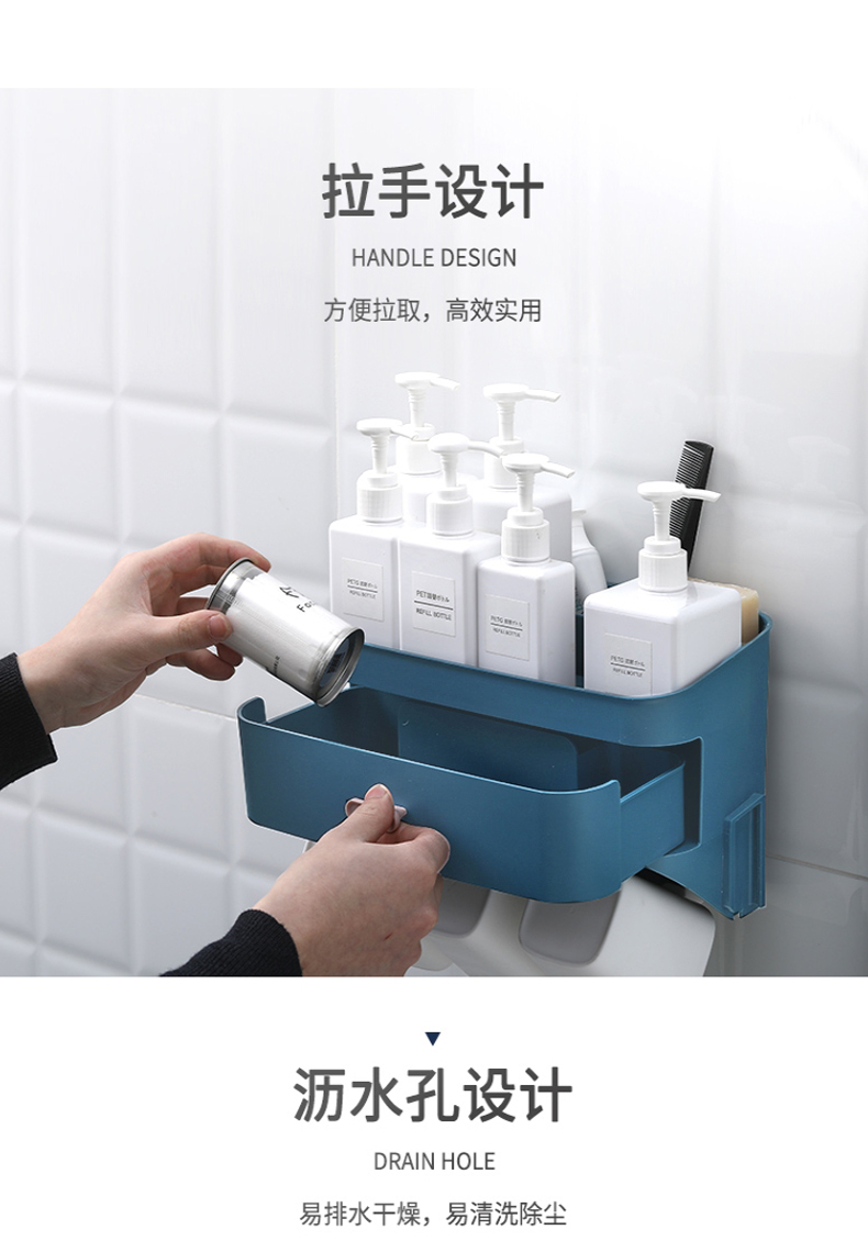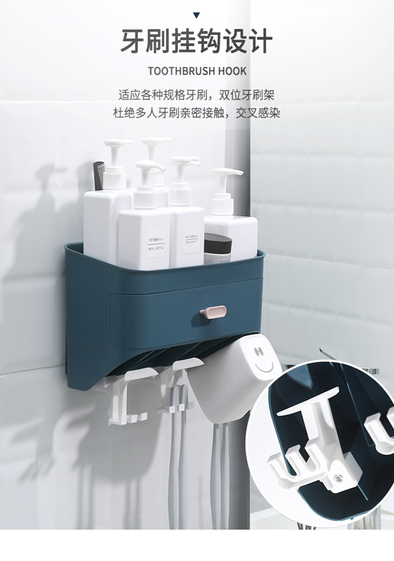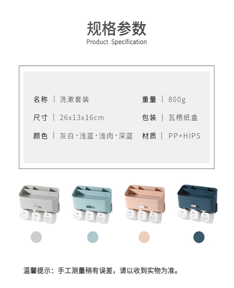小身材,大实力,深浅分格设计,斜面拿取更顺手,沥水孔设计排水除湿便于清洗,独立牙刷架避免混放,免打孔设计安装简便,简约纯色,清新百搭