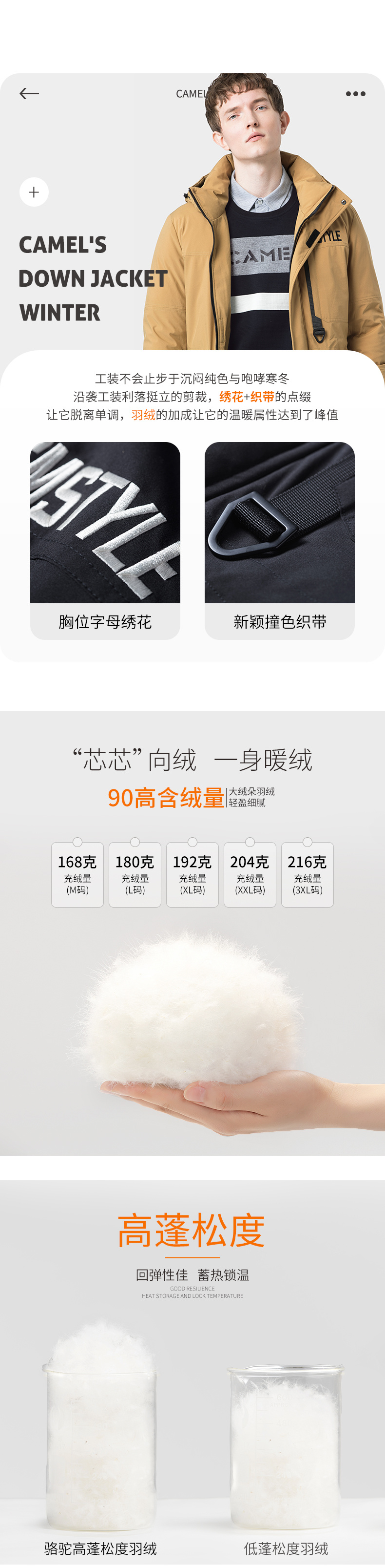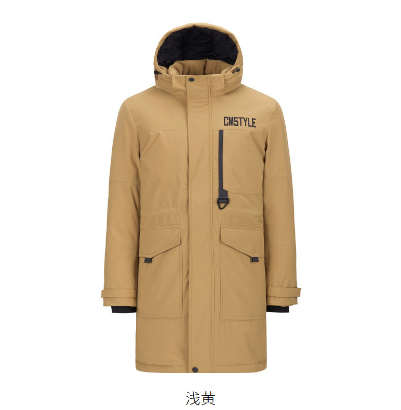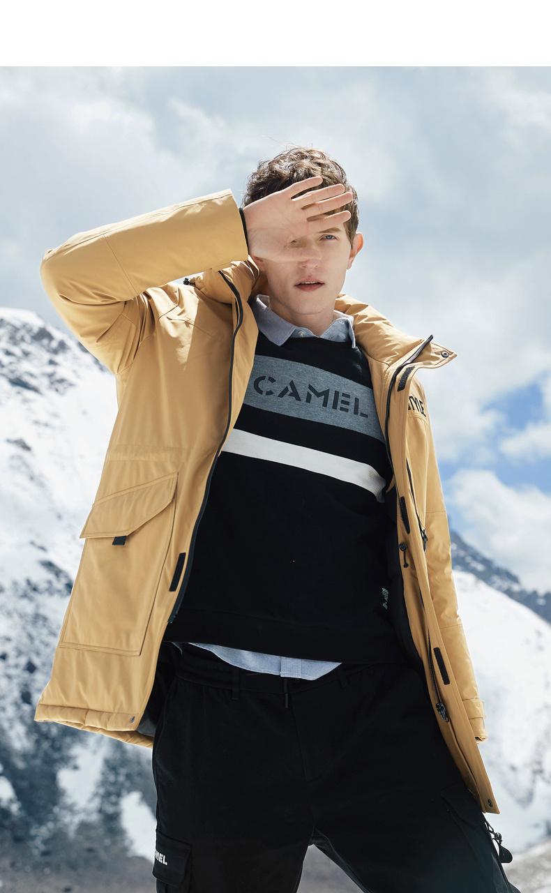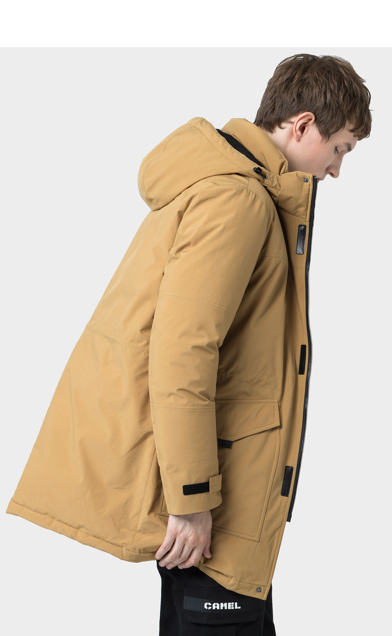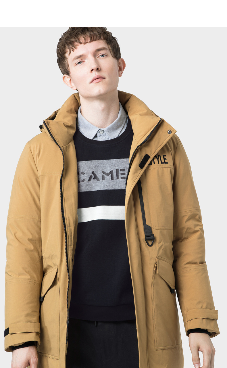 骆驼男装黄色工装羽绒服男中长款宽松加厚保暖刺绣字母白鸭绒外套