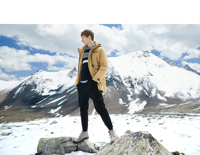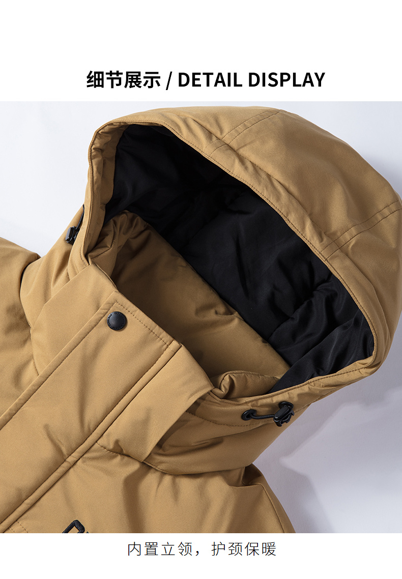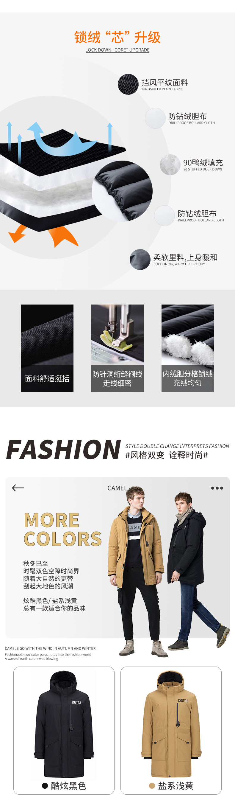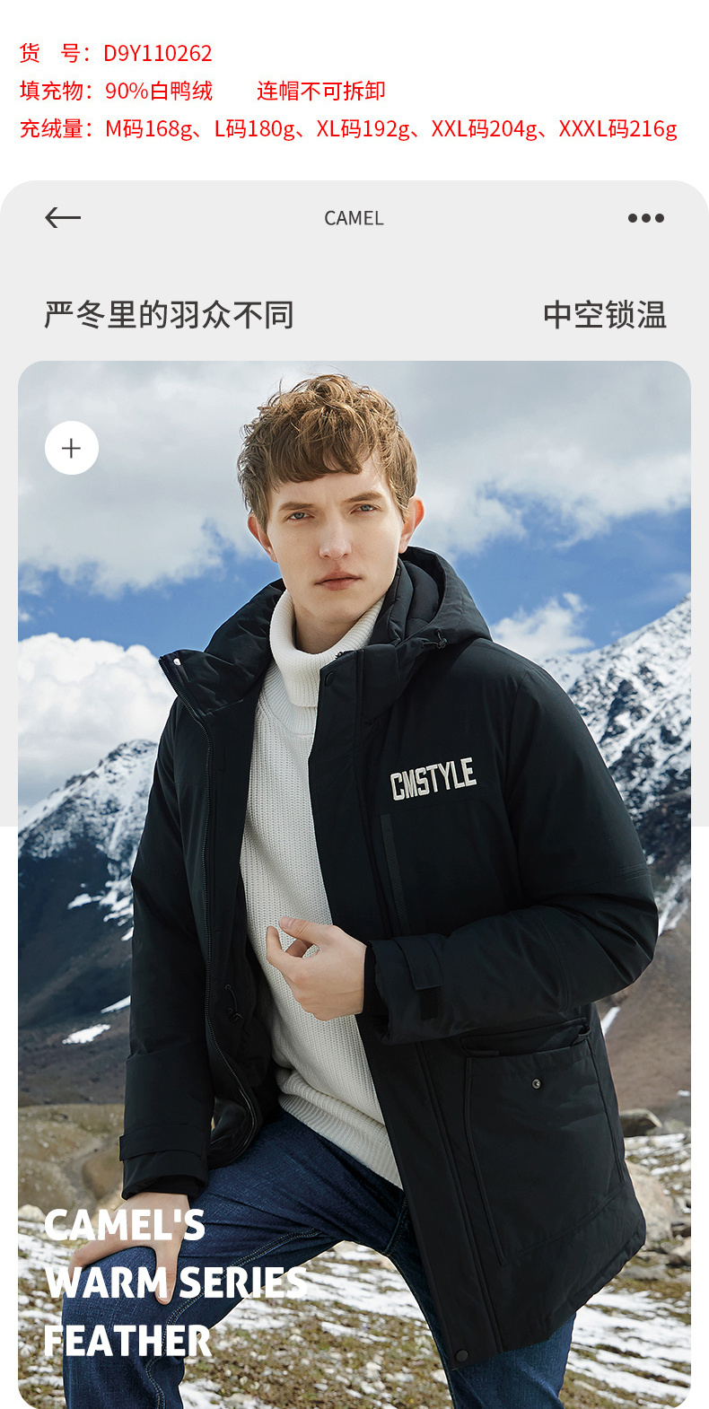 骆驼男装黄色工装羽绒服男中长款宽松加厚保暖刺绣字母白鸭绒外套