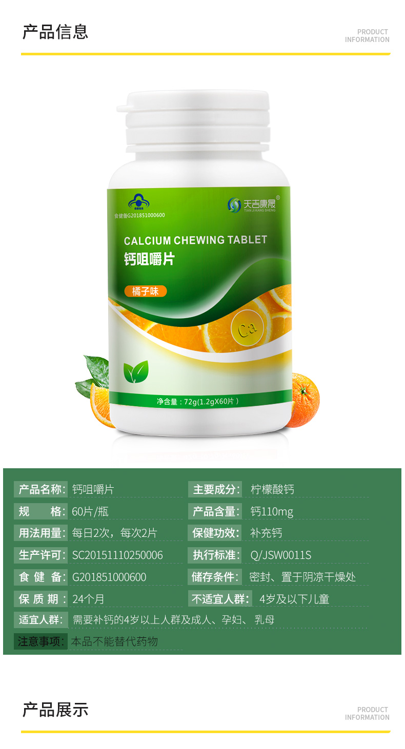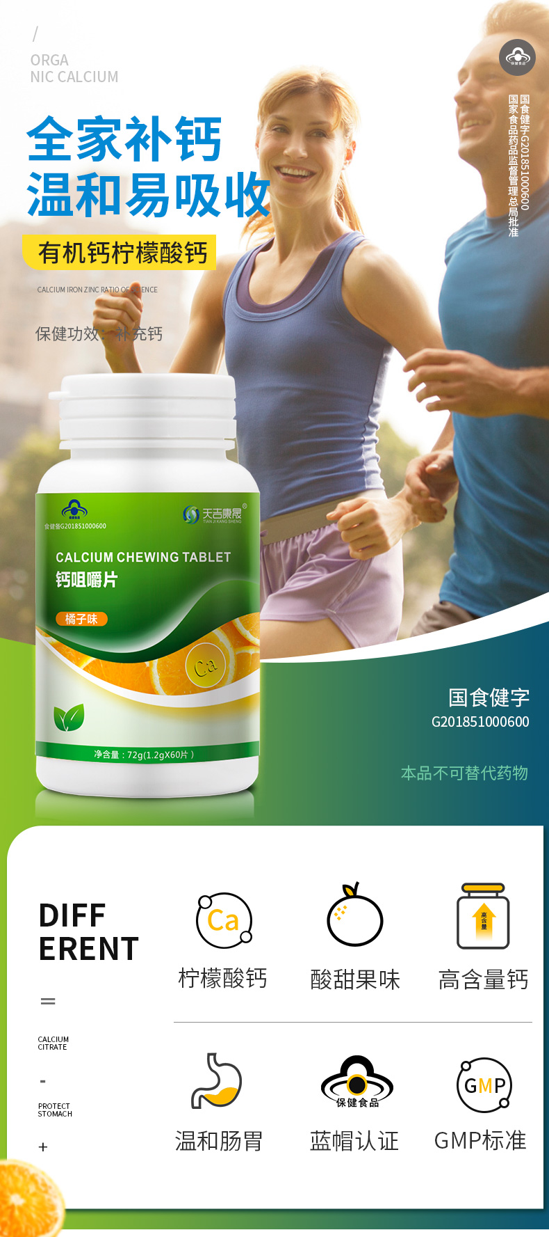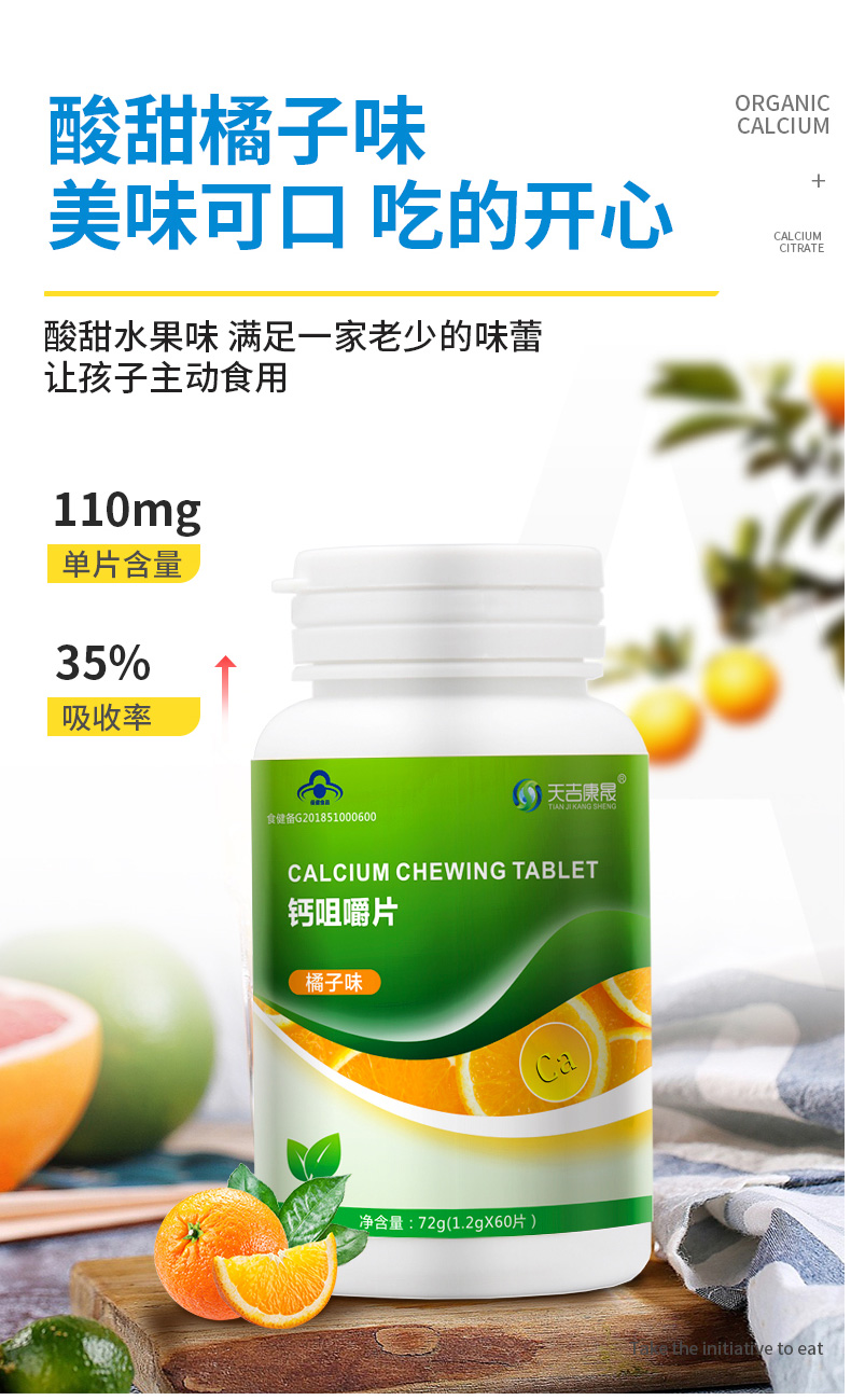 天吉康晟钙片柠檬酸钙成人中老年儿童青少年补钙片橘子味咀嚼片