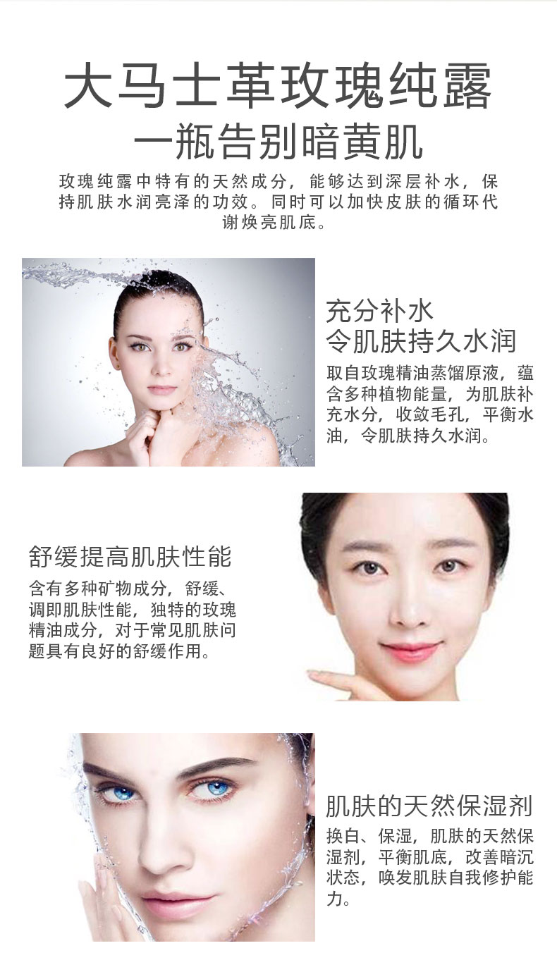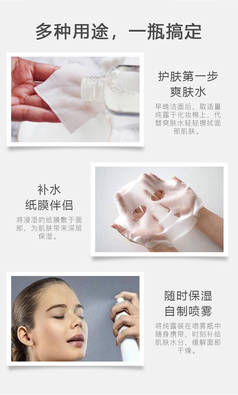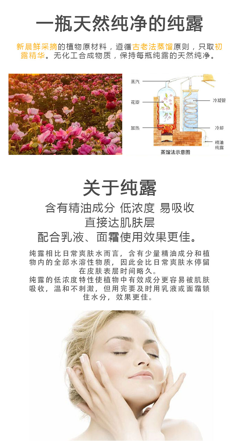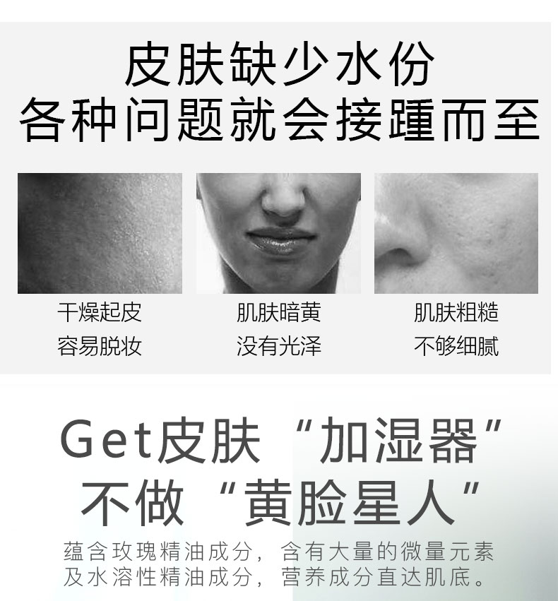 玫瑰蒸馏萃取,缓解皮肤干燥,舒缓紧绷,洁净肌肤,促进后续营养吸收,给您天然的“玫瑰水滋养”,喷雾设计,随时补水,护肤中的简约派!