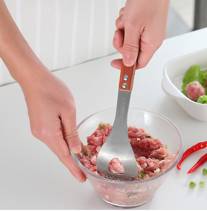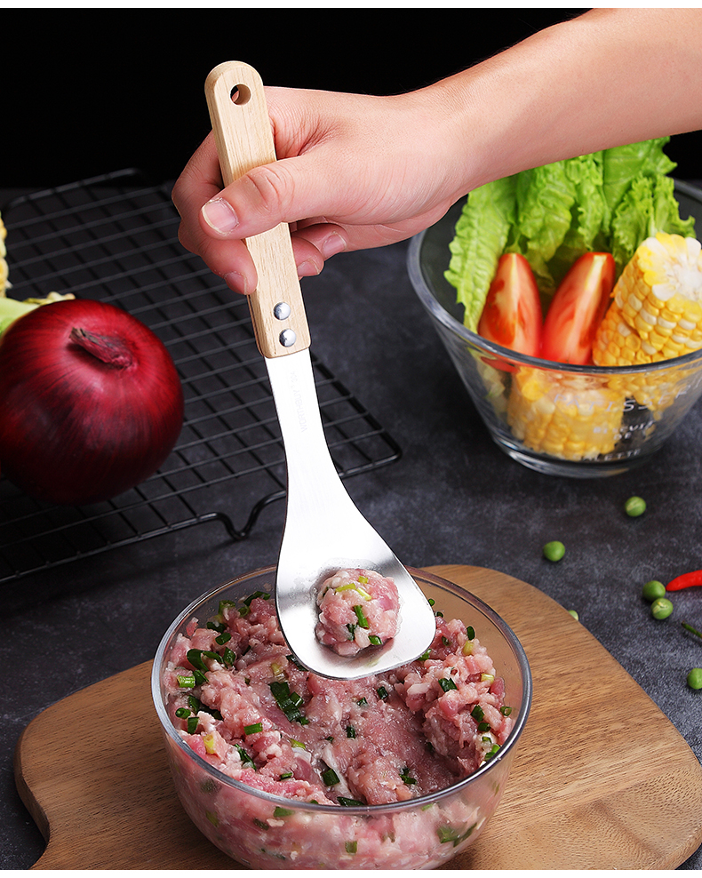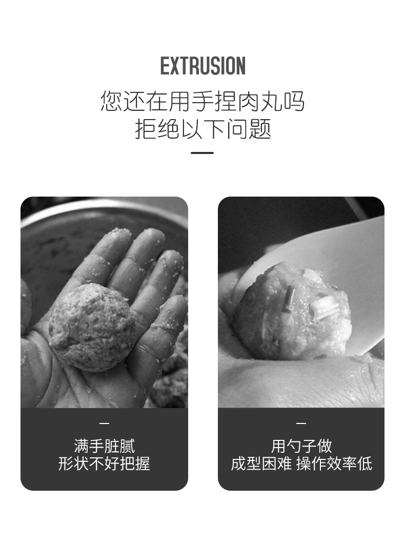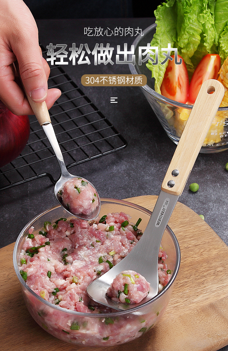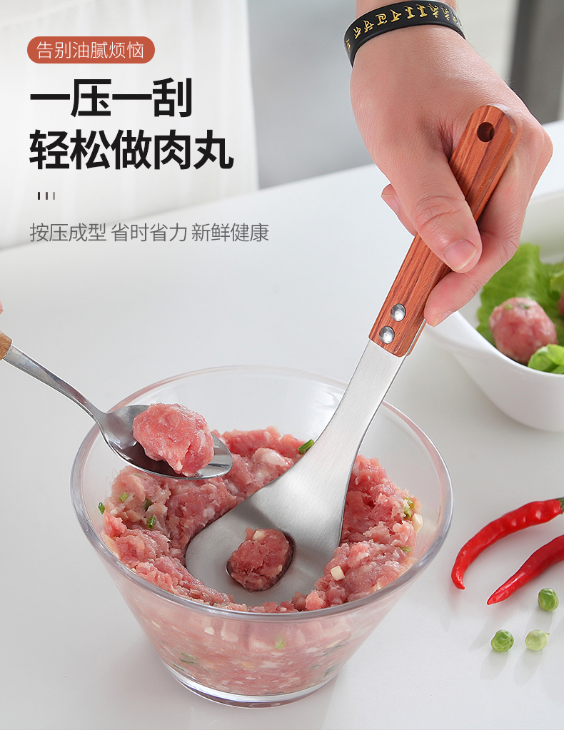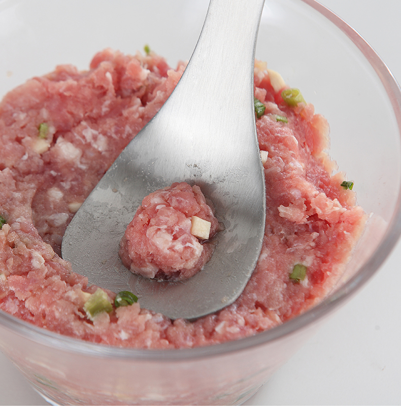 再也不用担心不会制作肉丸啦,赶紧备一个吧!一款可以为你解决用手做肉丸太油腻的神奇,304不锈钢肉丸器,椭圆漏孔,有效成型。舒适握感,拿捏方便。