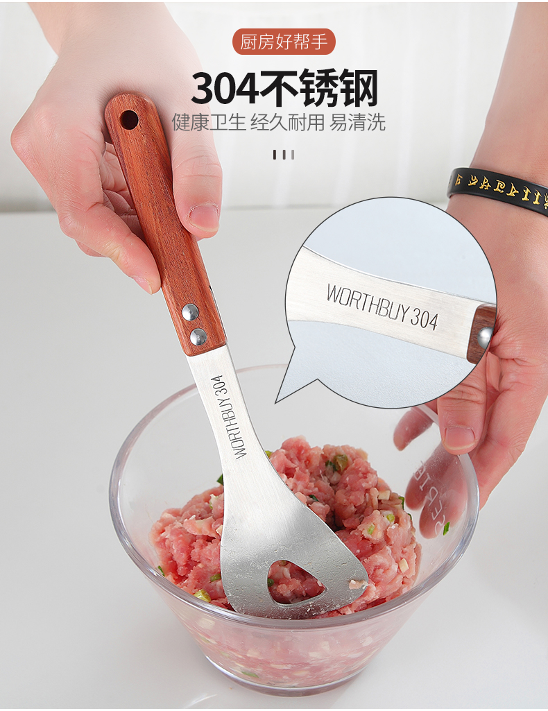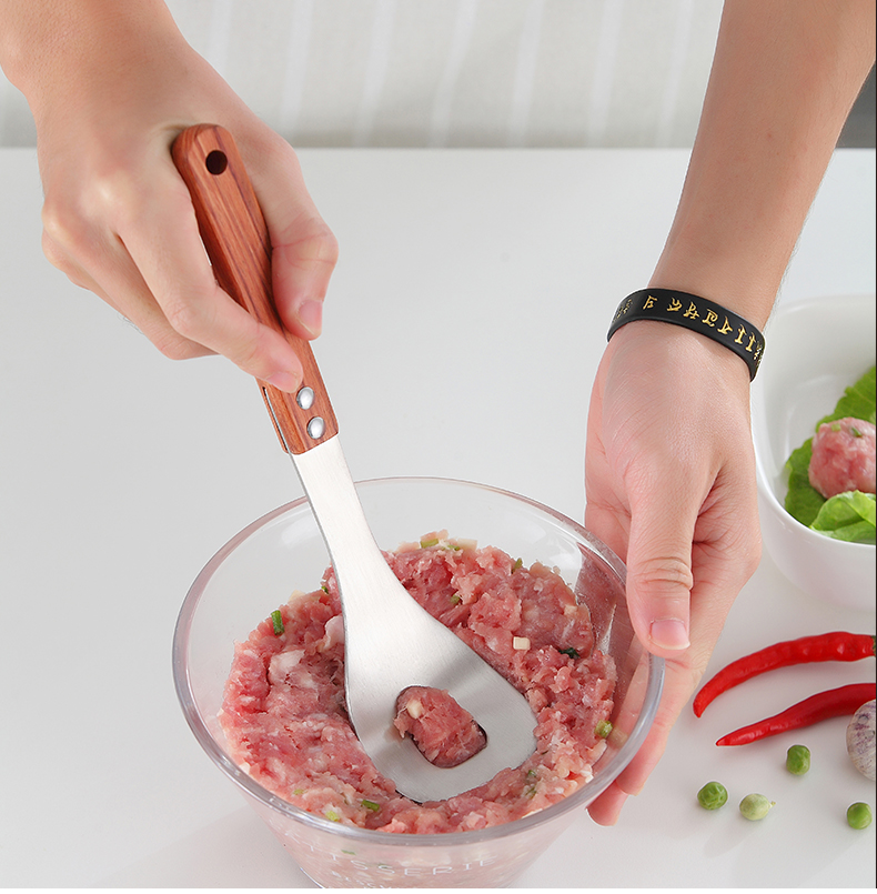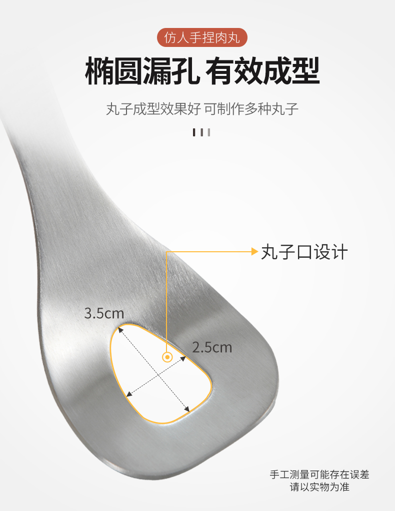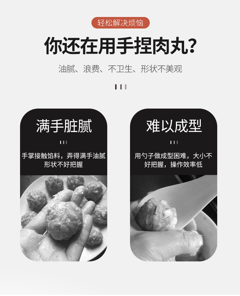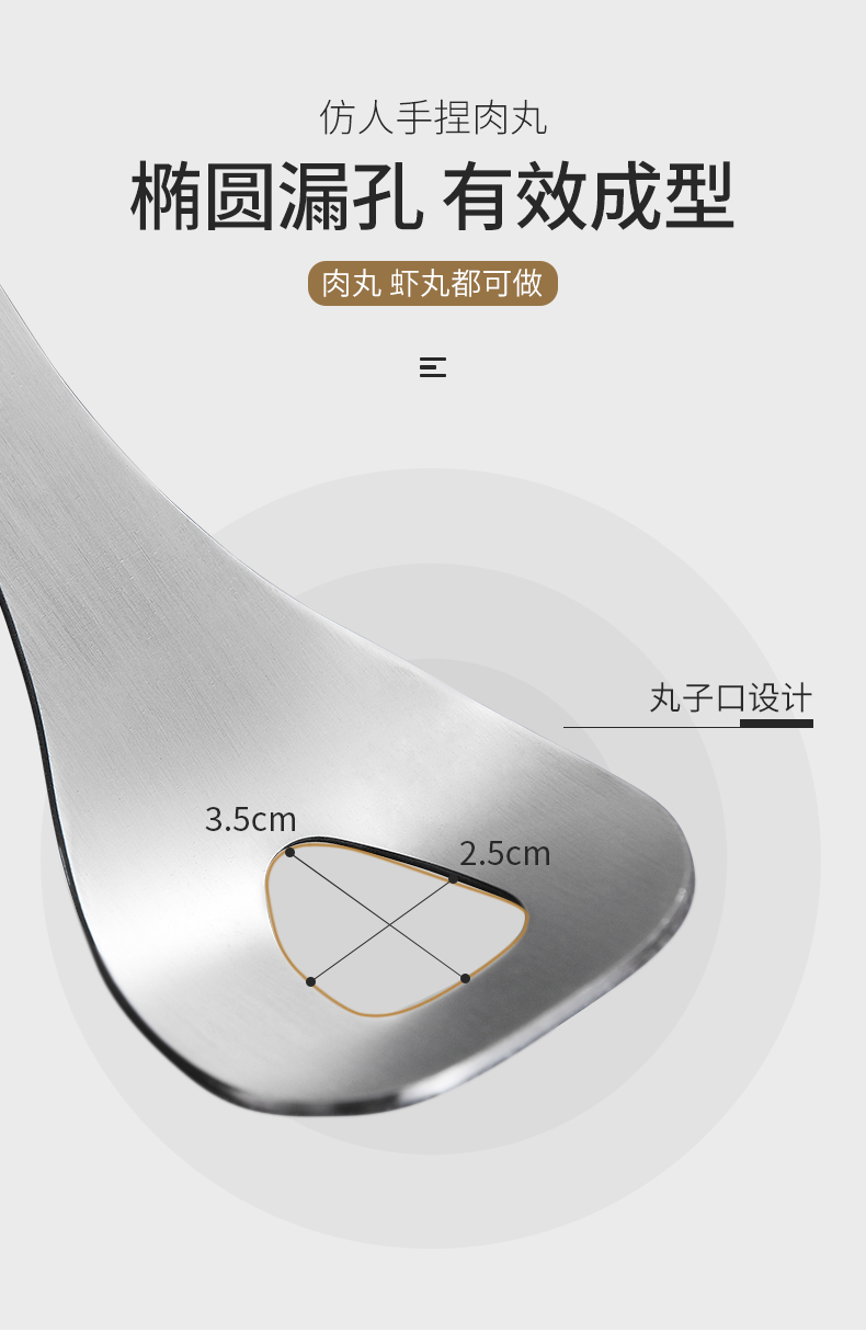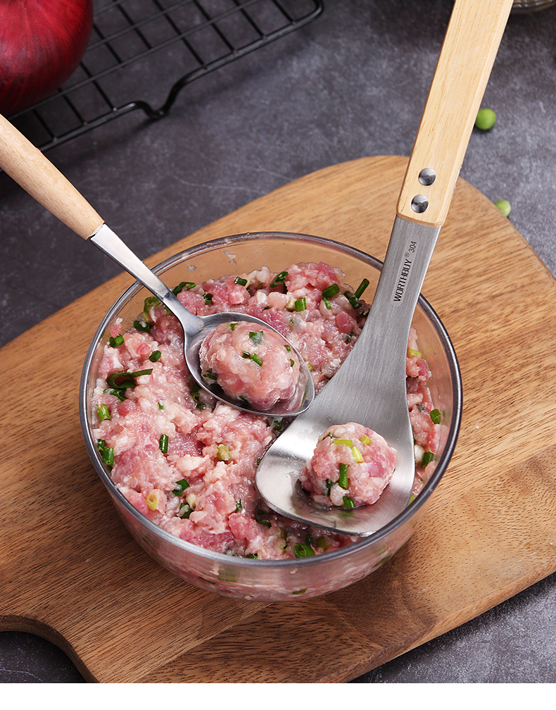 再也不用担心不会制作肉丸啦,赶紧备一个吧!一款可以为你解决用手做肉丸太油腻的神奇,304不锈钢肉丸器,椭圆漏孔,有效成型。舒适握感,拿捏方便。