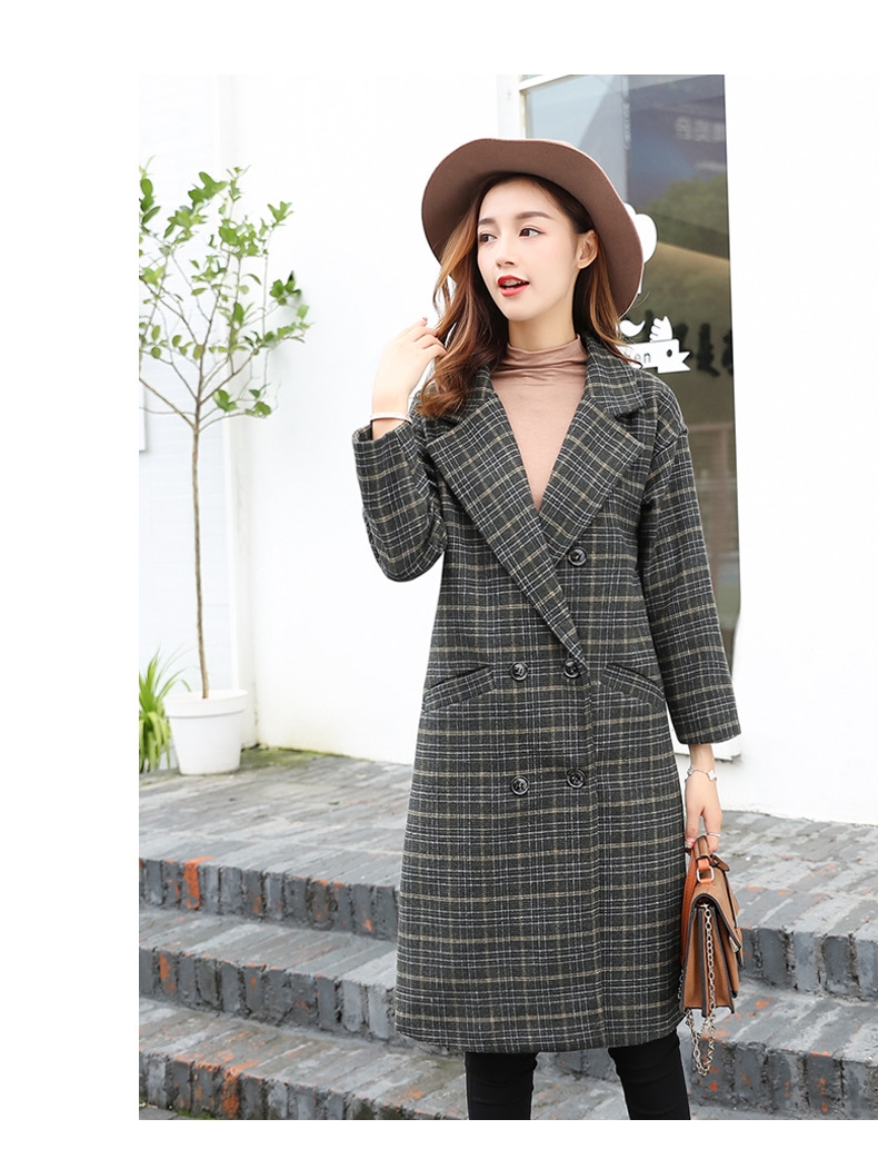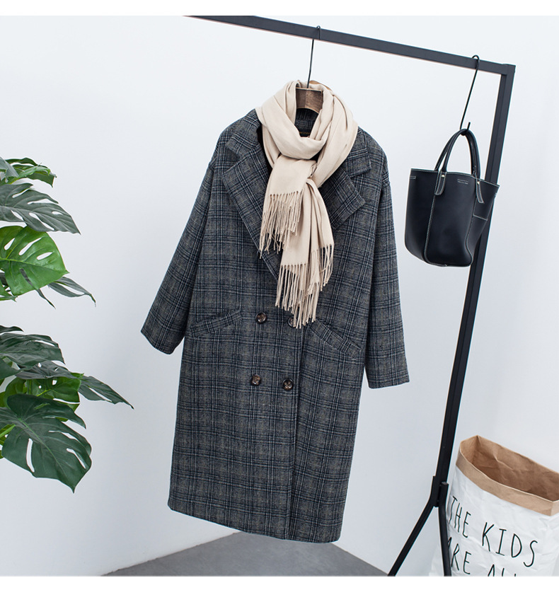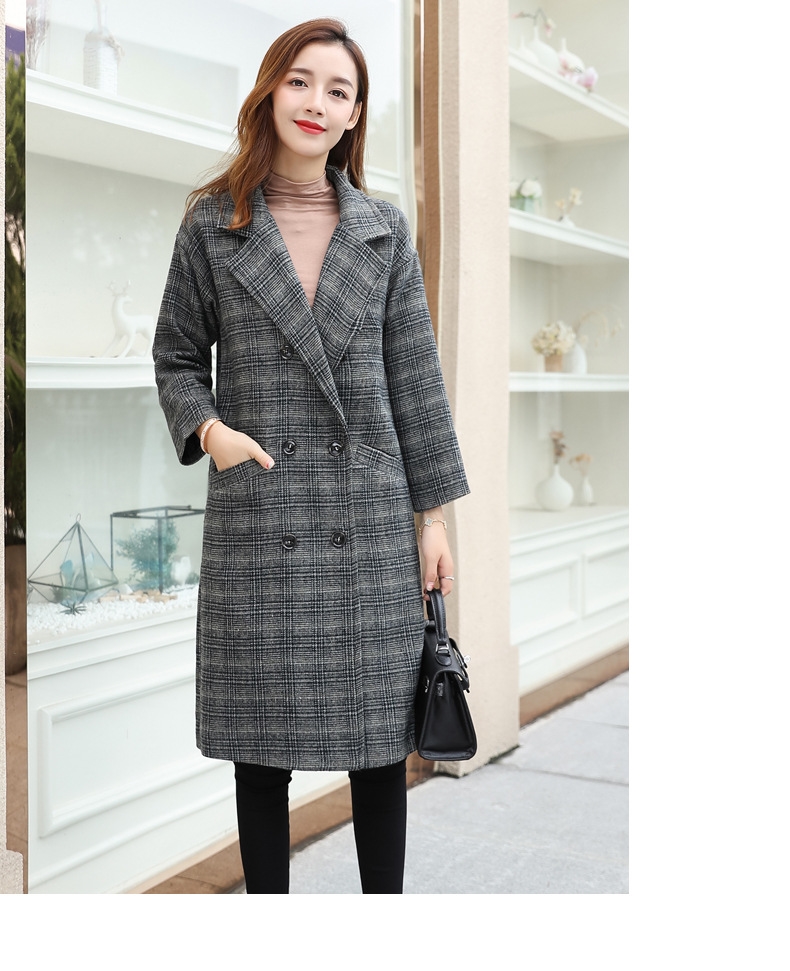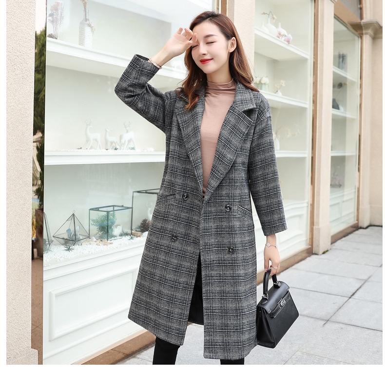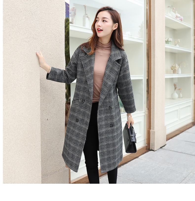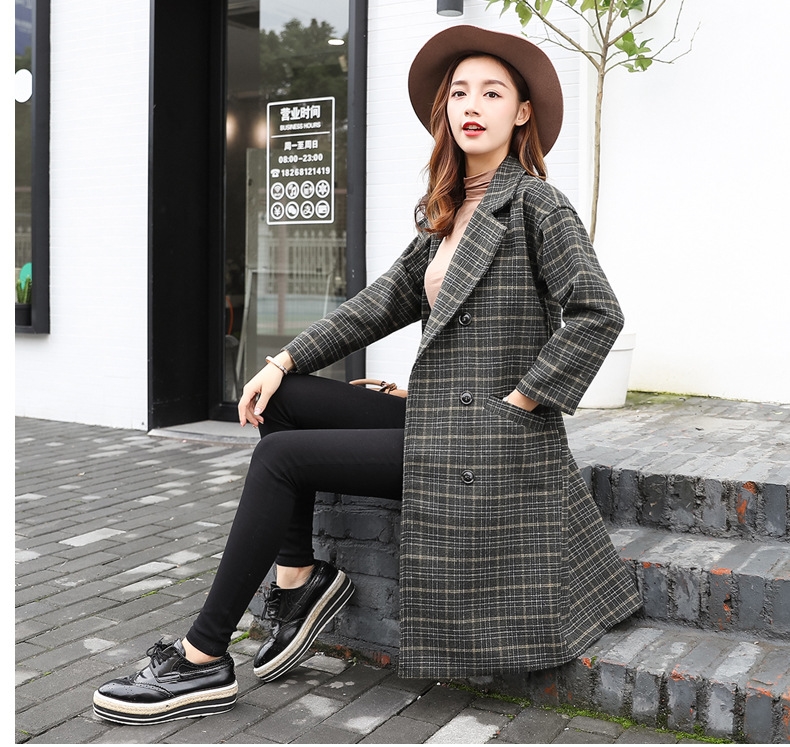 冬加厚新款毛呢外套女韩版中长款加棉格子呢大衣双排扣修身显瘦潮