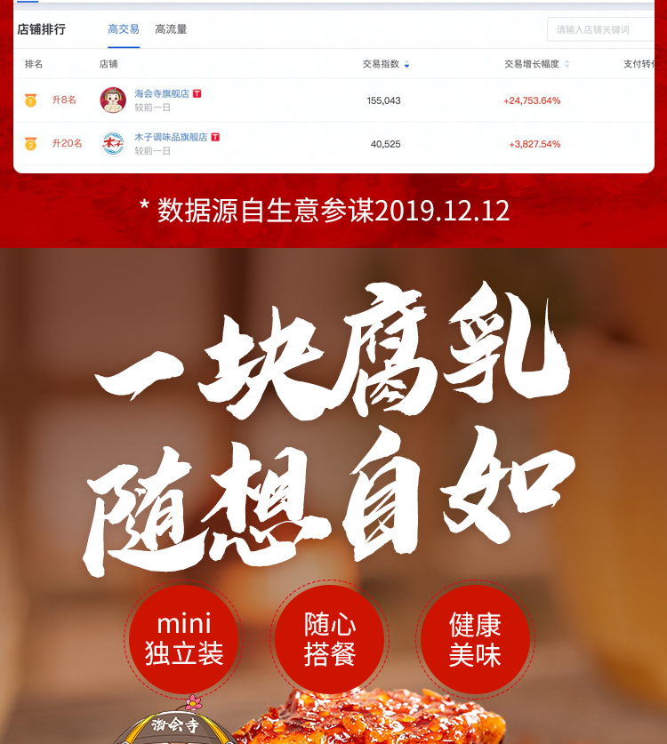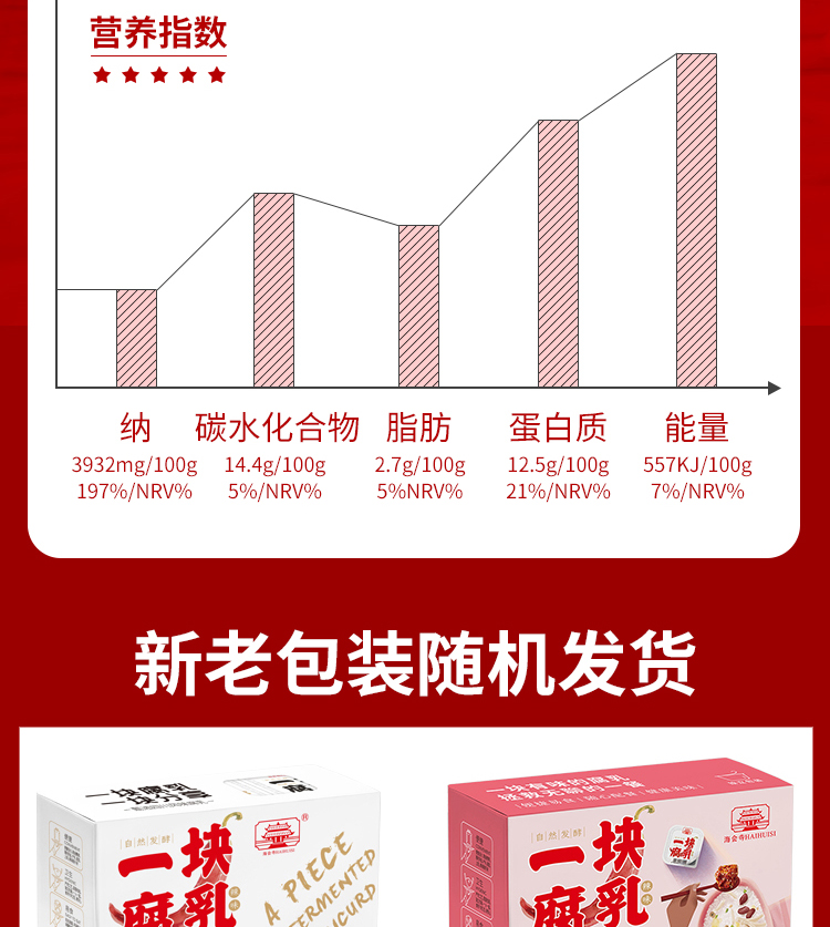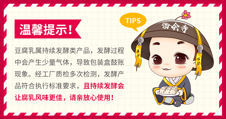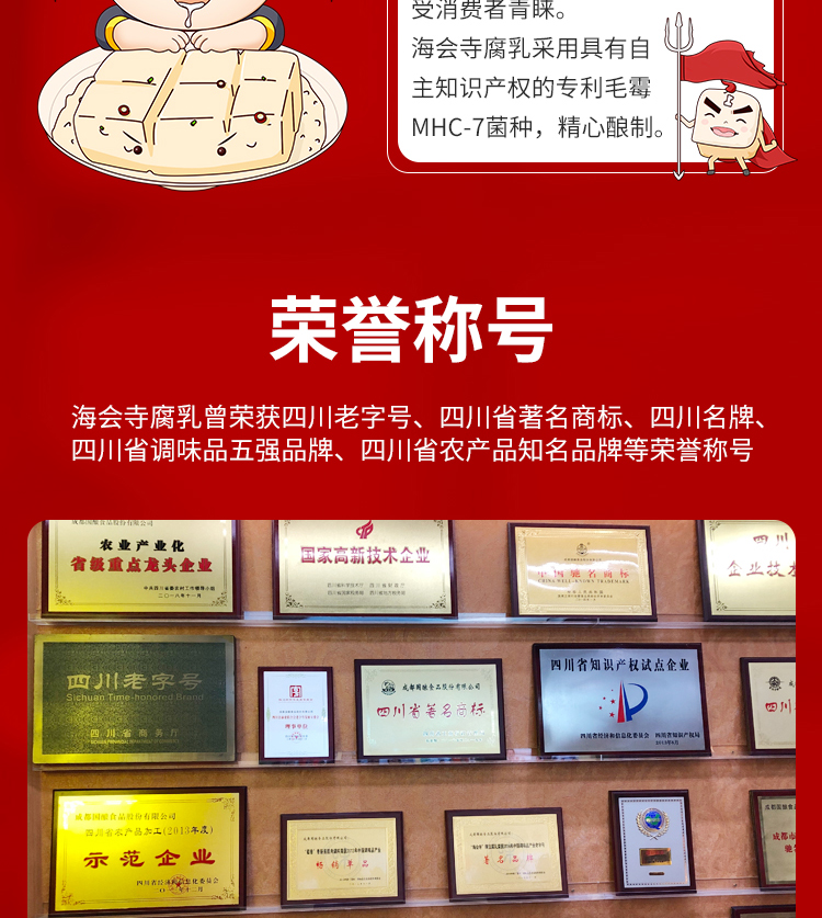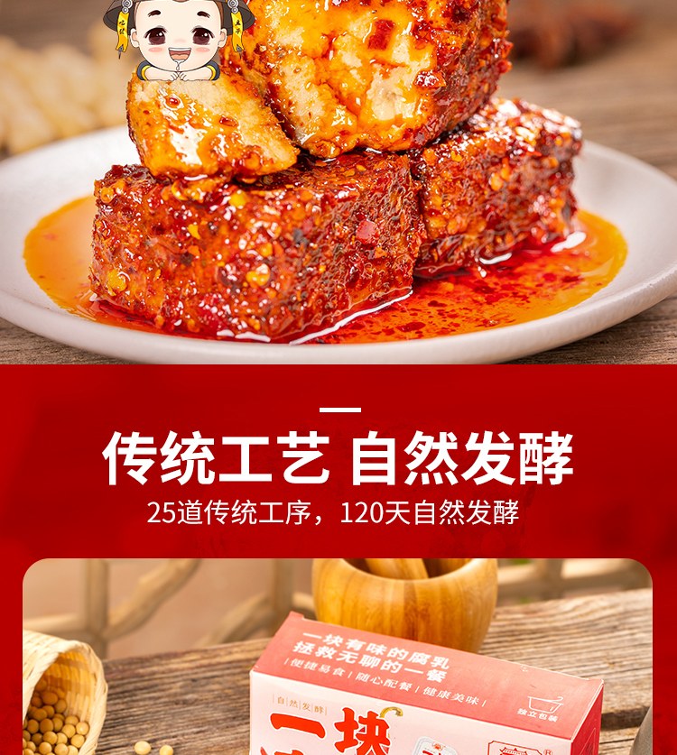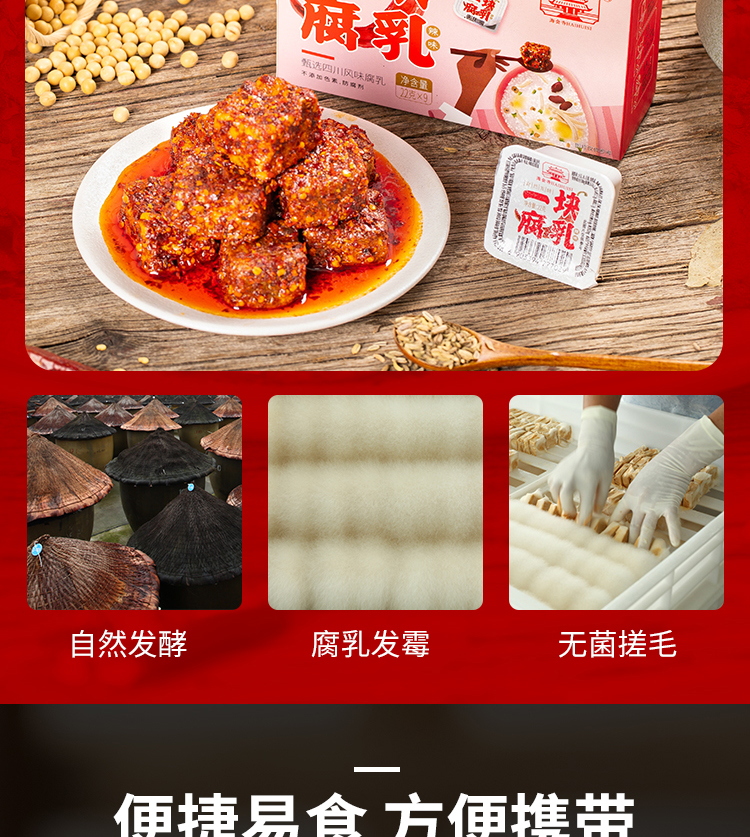 腐乳专家“海会寺”推出一块腐乳独立包装,超多美食网红主播推荐,精选优质植物油、颗粒饱满的上等黄豆,秘制鲜香辣椒,随身携带,非常方便,省去带瓶上阵的烦恼。仅需一盒,出差旅行,留学必备。