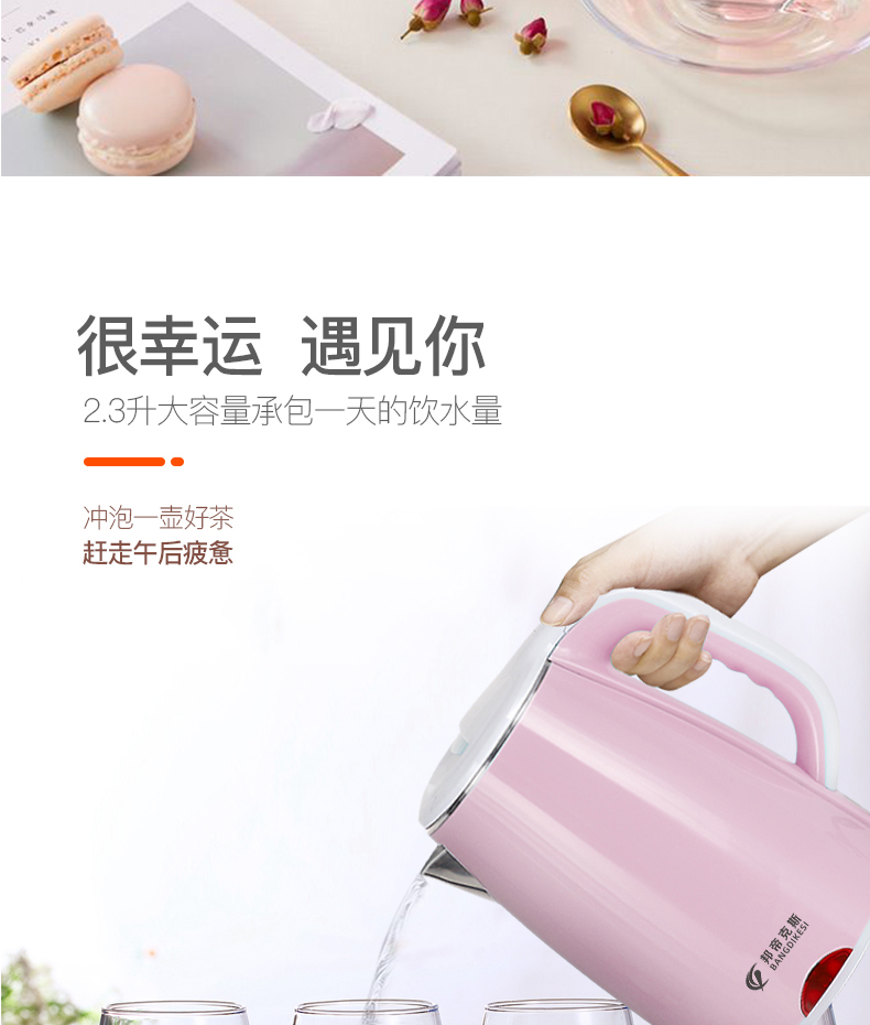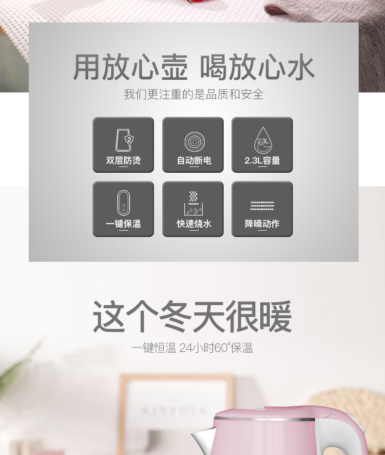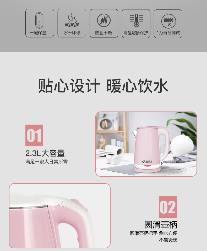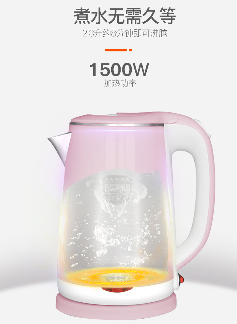2.3L大容量,食品级304不锈钢材质,烧一壶健康的水,双重壶身防烫,水开即停防干烧,1500w大功率,6分钟快速煮水,喝开水无需等待,颜值实用集一身,伴你温暖常在!