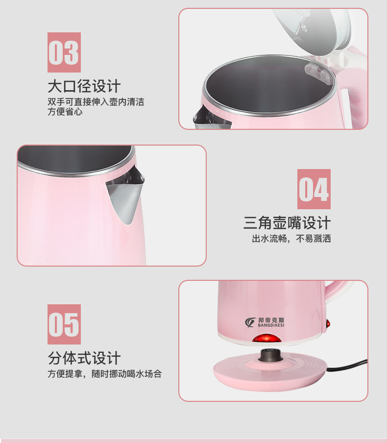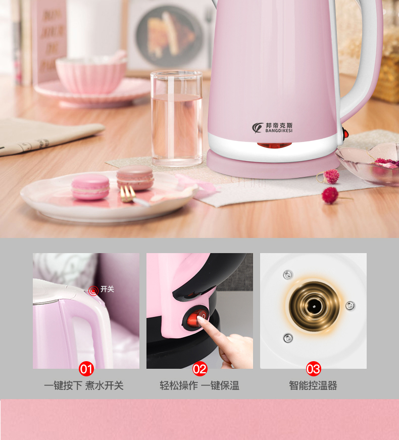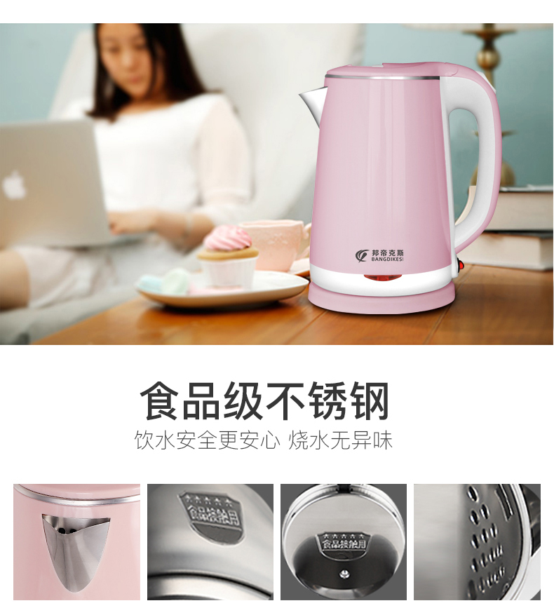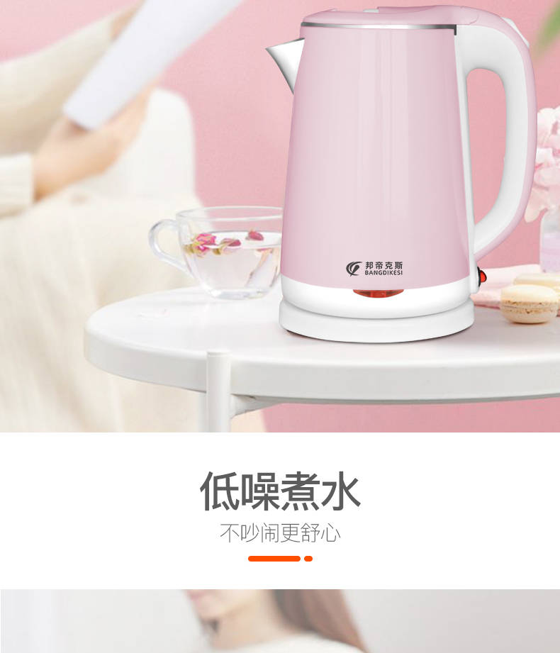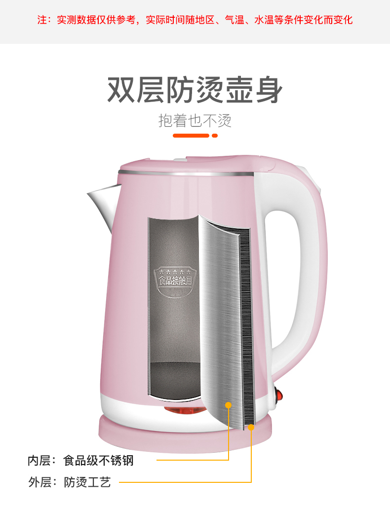 2.3L大容量,食品级304不锈钢材质,烧一壶健康的水,双重壶身防烫,水开即停防干烧,1500w大功率,6分钟快速煮水,喝开水无需等待,颜值实用集一身,伴你温暖常在!