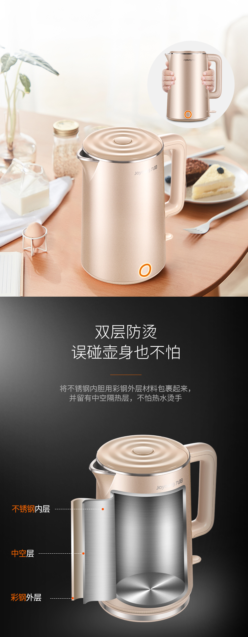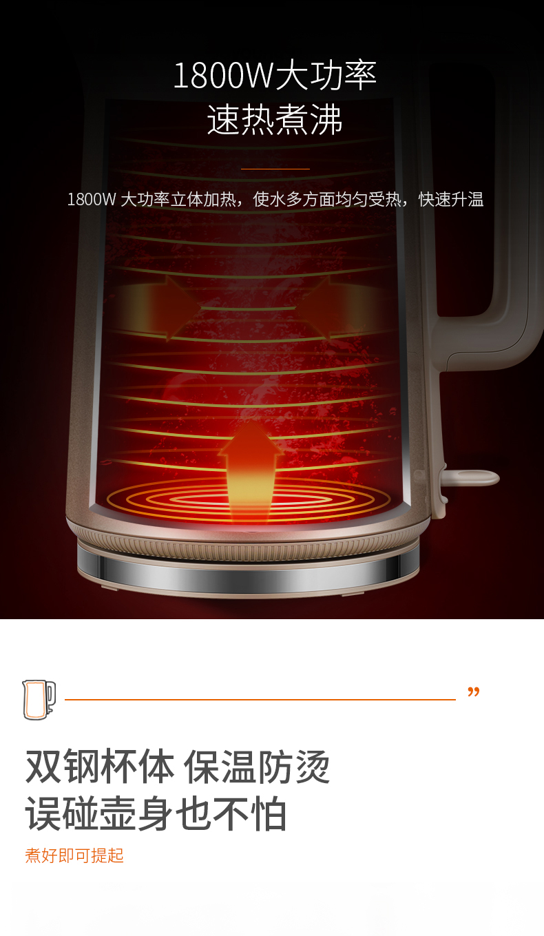 九阳电热水壶,升级设计工艺,实现静音烧水。1800W大功率快速沸腾,无需久等。双钢杯体,锁温防烫,误碰壶身也不怕。