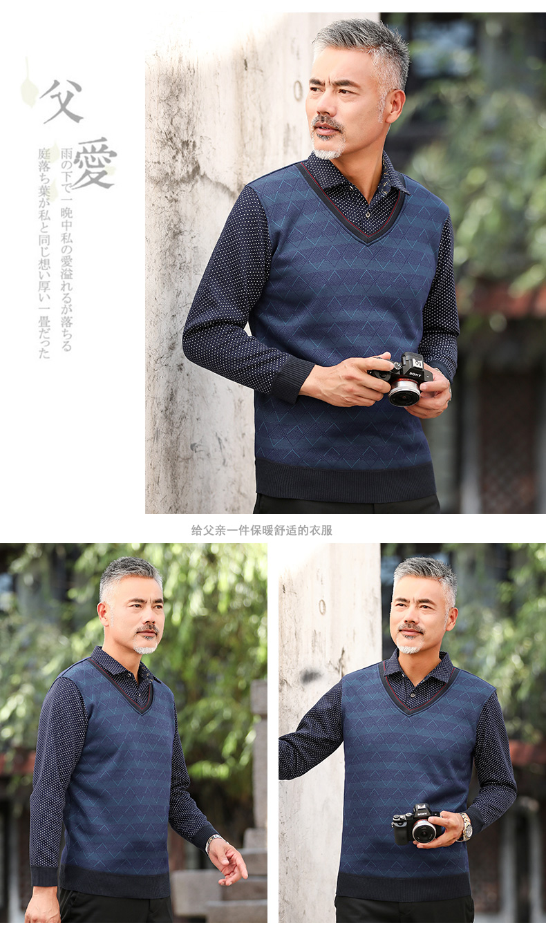 爸爸冬装长袖T恤加绒衬衫领假两件40-50岁中老年男装保暖针织衫