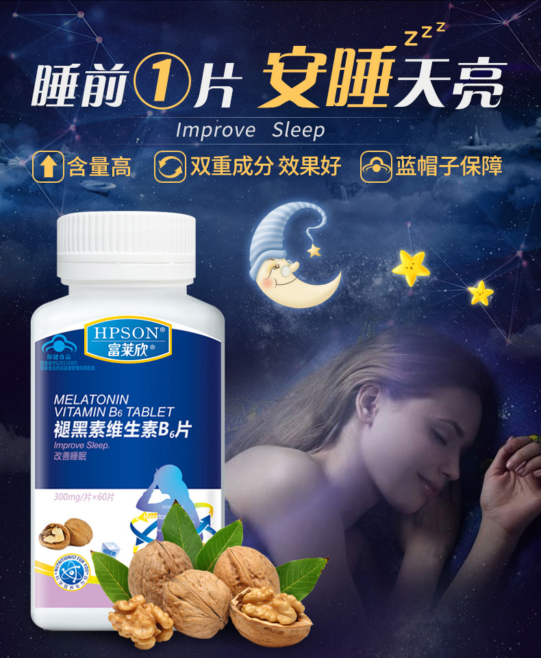 送30片】HPSON官网褪黑素B6片 助眠改善失眠安定深度睡眠片成人