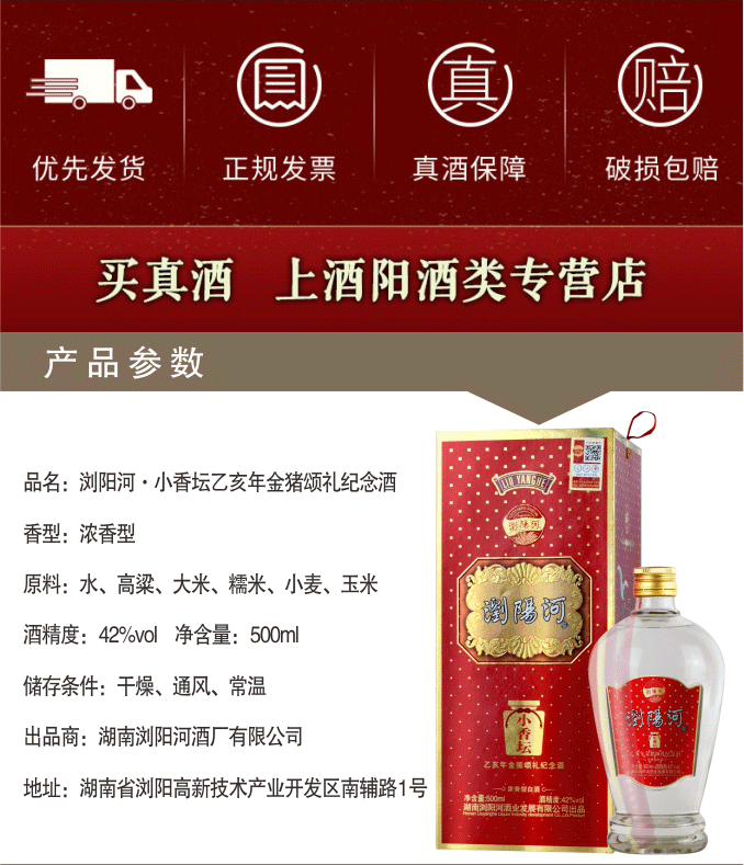 浏阳河乙亥年金猪颂礼纪念酒42度500ml浓香型白酒瓶装整箱整件