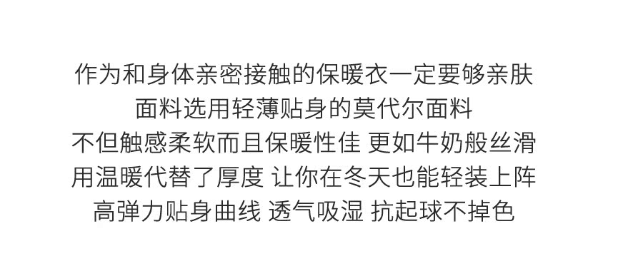 37度恒温美体自发热,如牛奶般丝滑的保暖衣,把牛奶穿在身上,超薄款亲肤贴身,透气吸湿,抗起球不掉色,夏代尔面料,用温暖代替了厚度,让你在冬天也能轻装上阵~