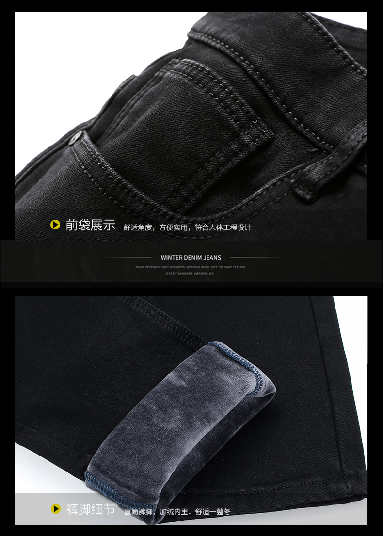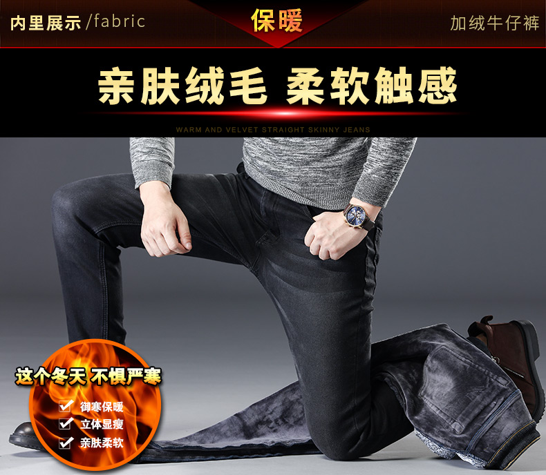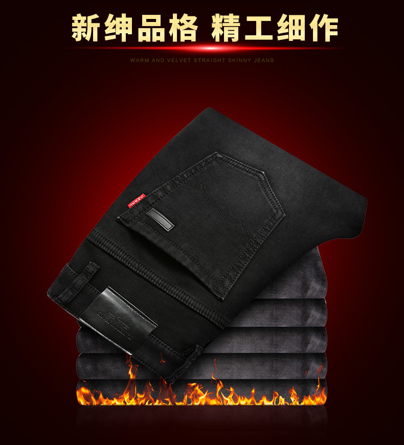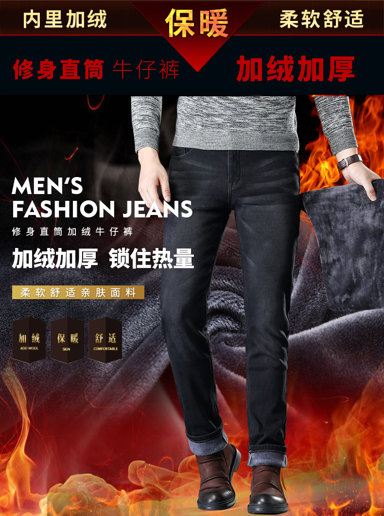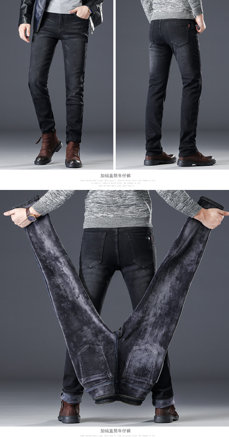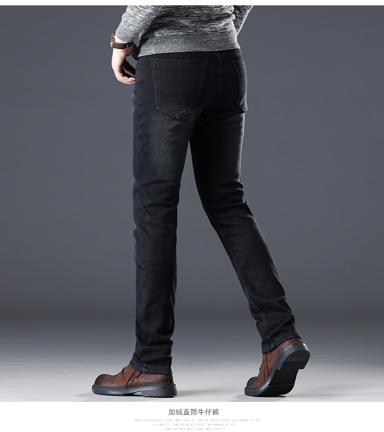 冬季男士加绒加厚修身牛仔裤男直筒男式弹力带绒黑色宽松牛子裤潮
