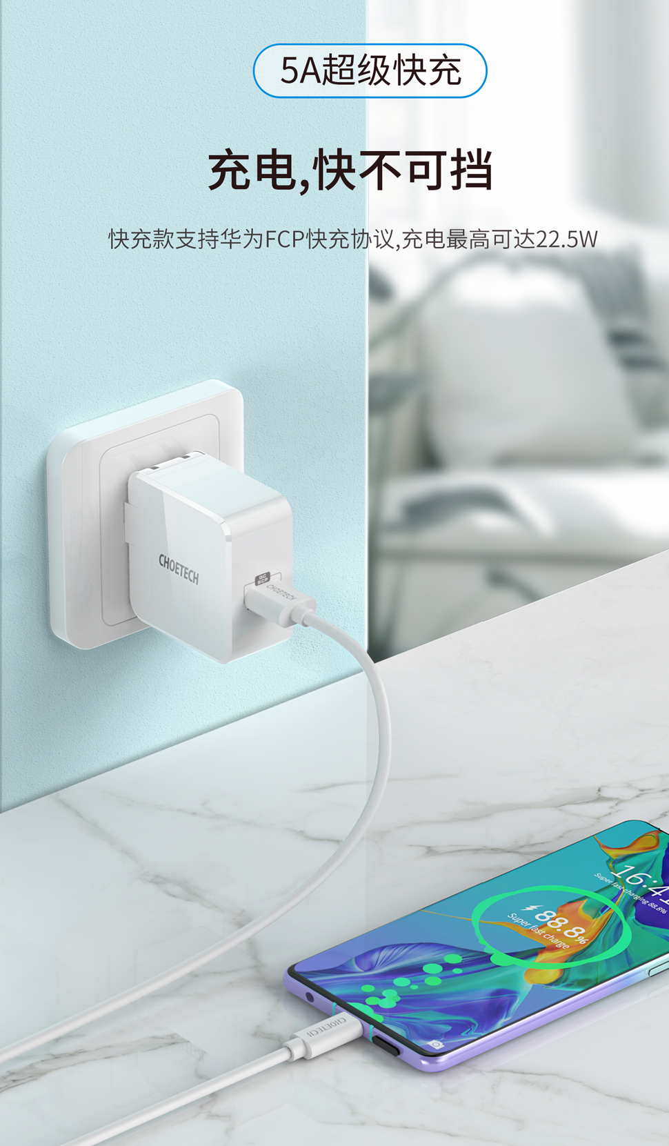 CHOETECH原装正品适用小米充电器18W闪充QC3.0快充头6x安卓type-c红米note7数据线8se三星s8黑鲨华为usb手机9