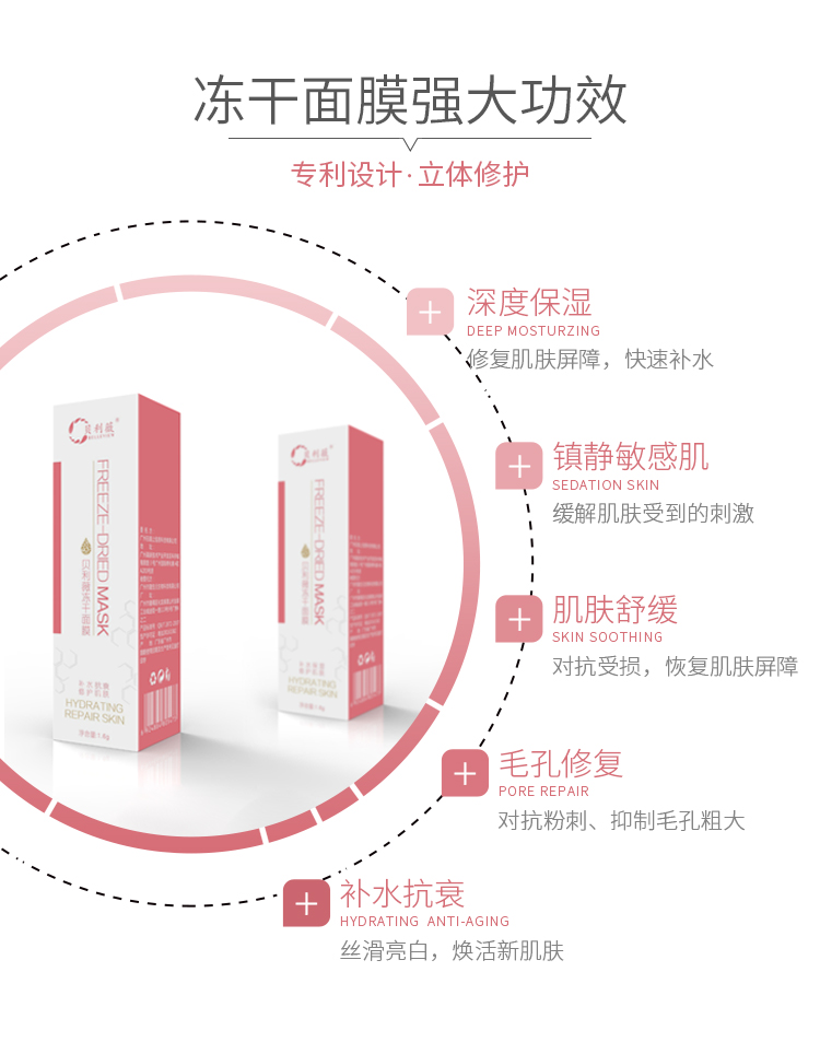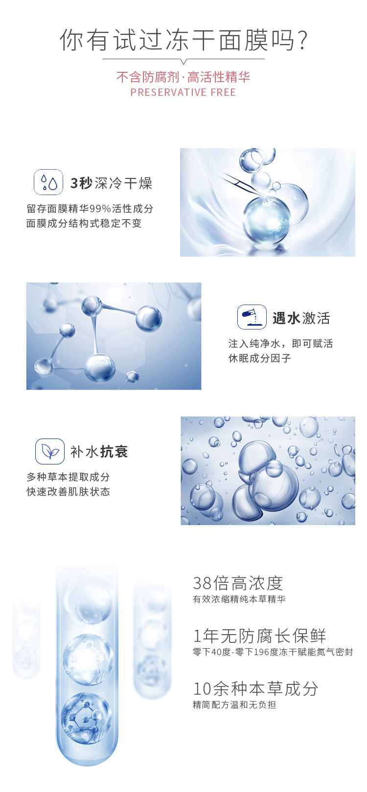 高科技冻干技术,把精华注入到膜布中,高效保存精华活性,深层锁水,紧致肌肤,缩小毛孔,安全更有效!