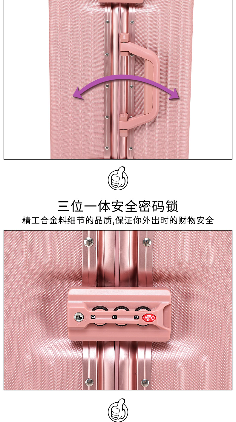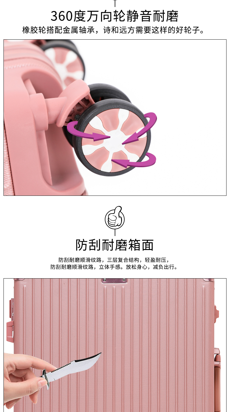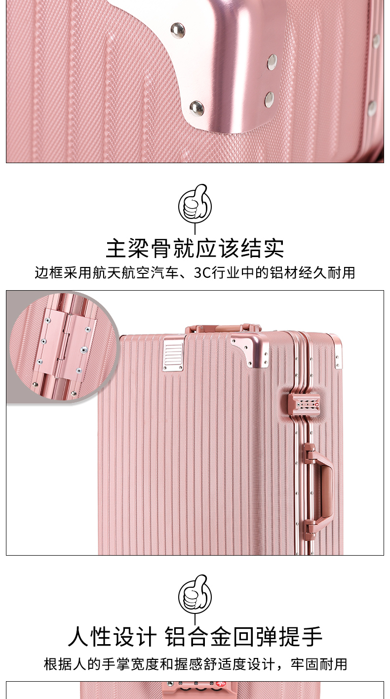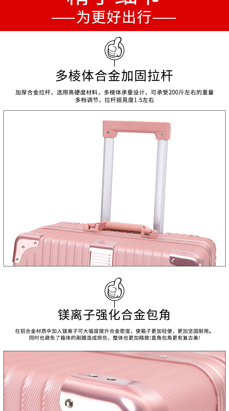 终身保修!特殊工艺坚韧耐磨,一体成型高端铝合金框拉杆,经久耐摔,360度静音万向轮,滑动自如,省时省力容量大,轻盈灵活加密收纳,外出旅行必备!【干湿分离】