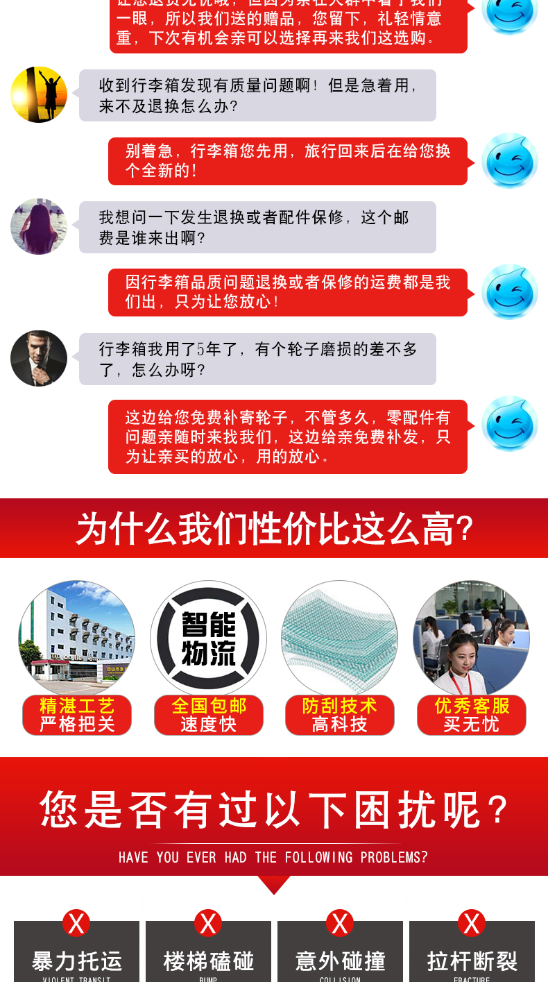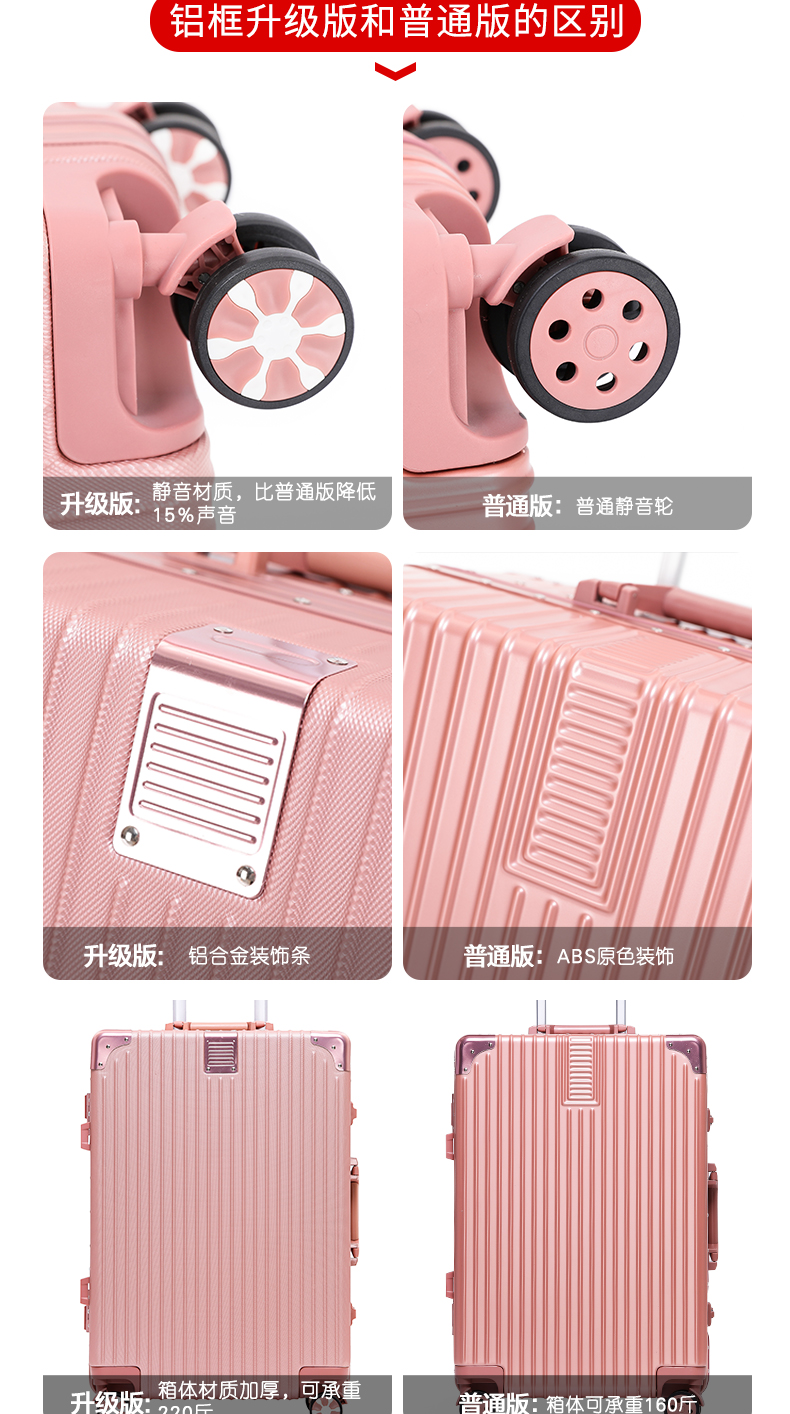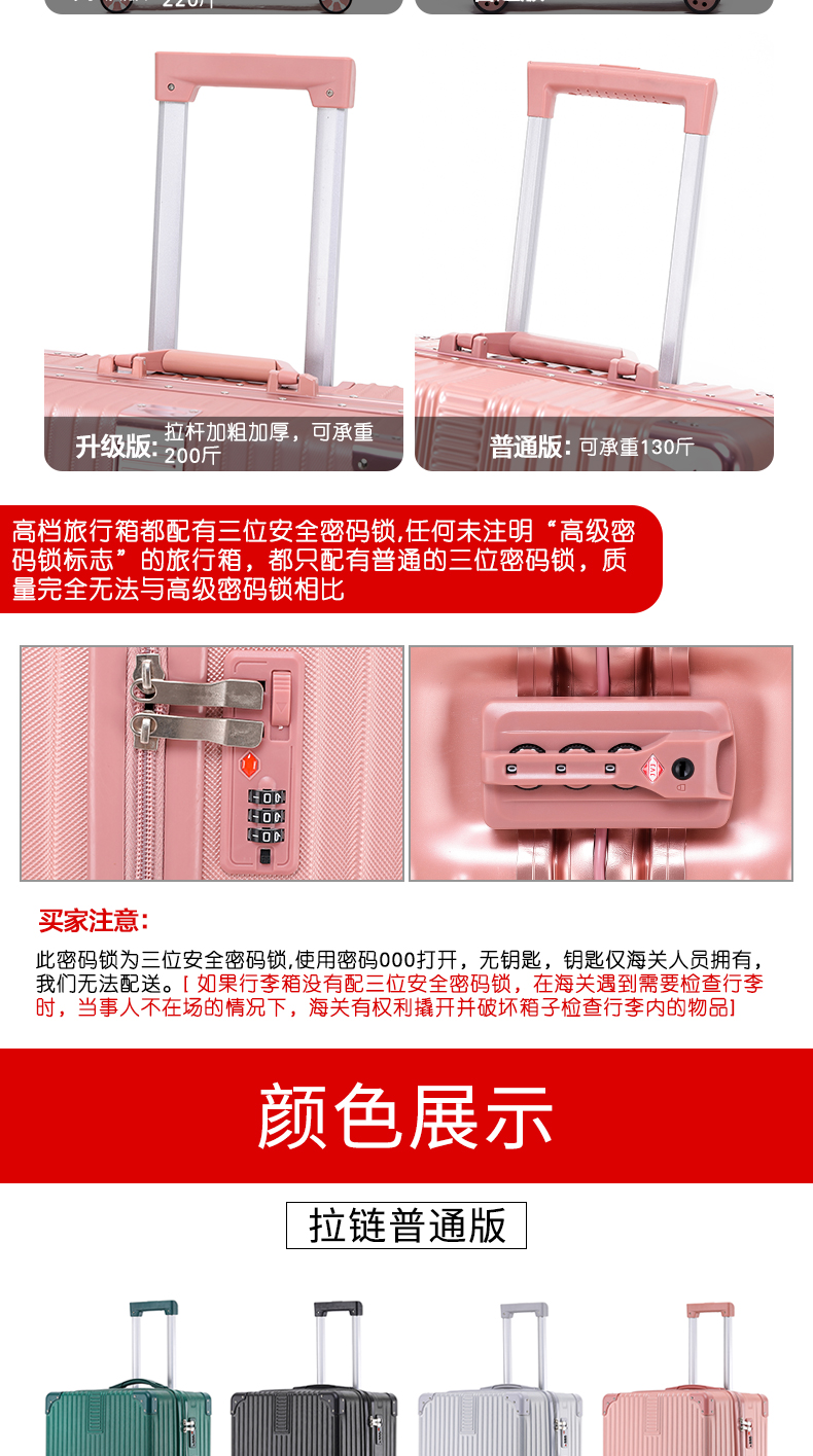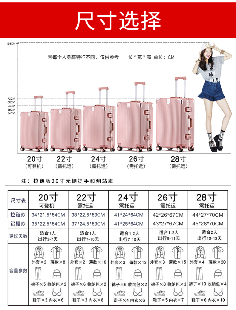 终身保修!特殊工艺坚韧耐磨,一体成型高端铝合金框拉杆,经久耐摔,360度静音万向轮,滑动自如,省时省力容量大,轻盈灵活加密收纳,外出旅行必备!【干湿分离】