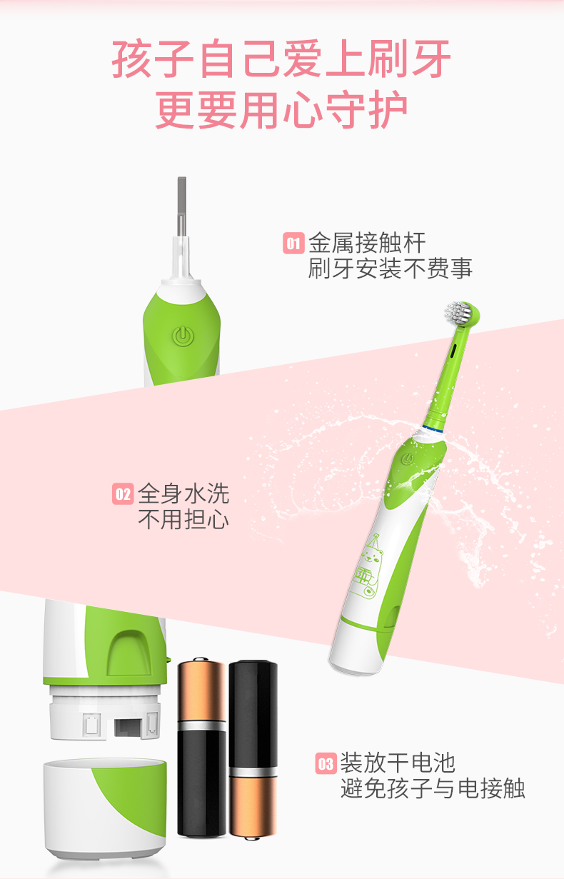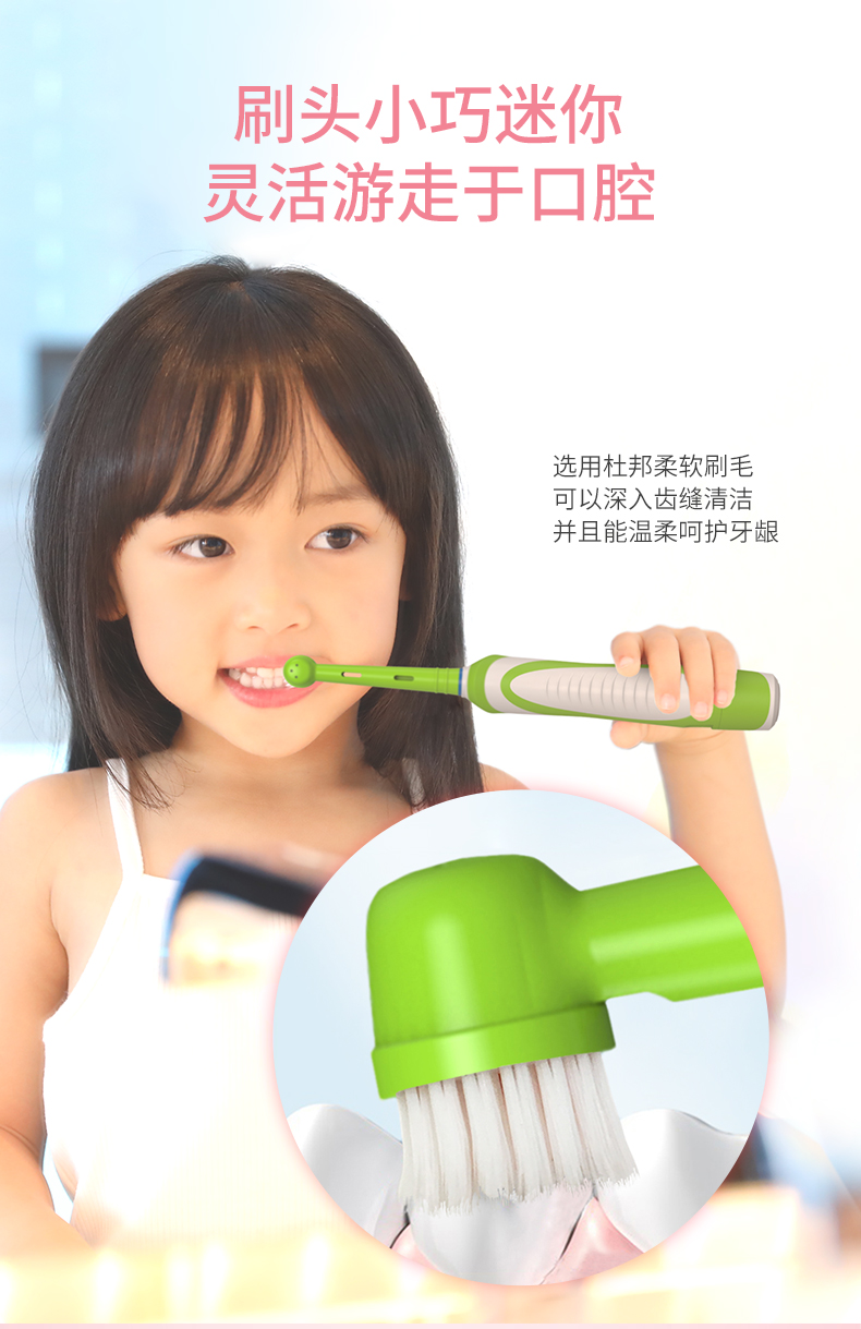 选用美国杜邦刷毛,安全TPE材质,便携式电池驱动,一键可控,保护牙龈,可全身水洗,3色可选,2年质保,给宝宝不一样的洁齿体验!【赠运费险】