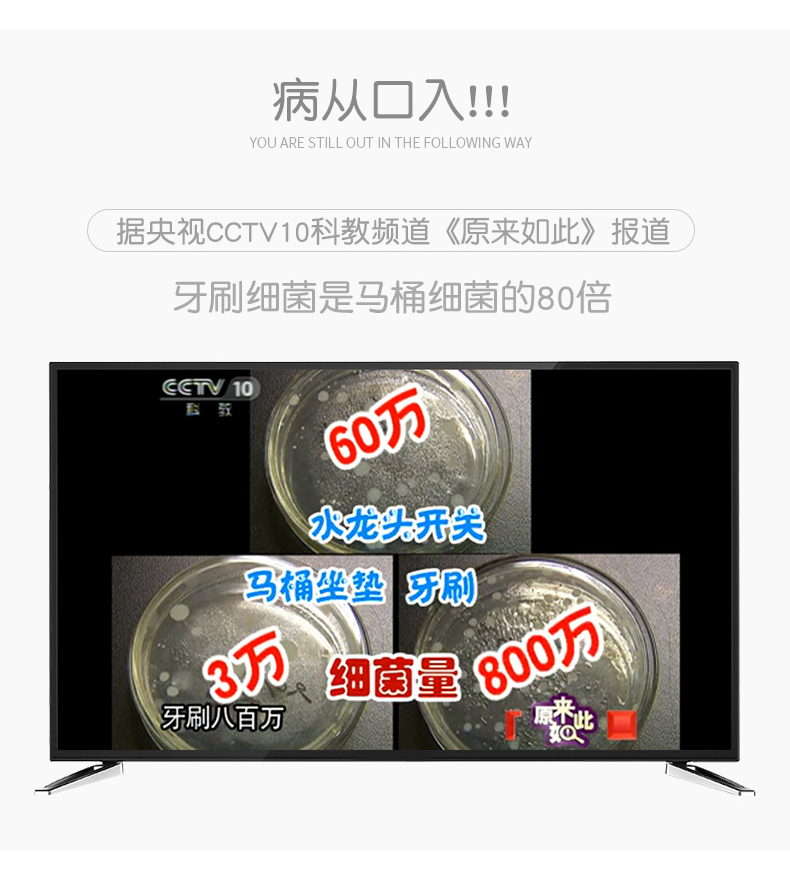 央视报道牙刷细菌是马桶细菌的80%倍,放潮湿卫生间滋生细菌不卫生的牙刷会带来疾病,这款高科技计时智能紫外线杀菌牙刷架,杀菌率高达99.99%,快给家人用起来,抢完必涨!