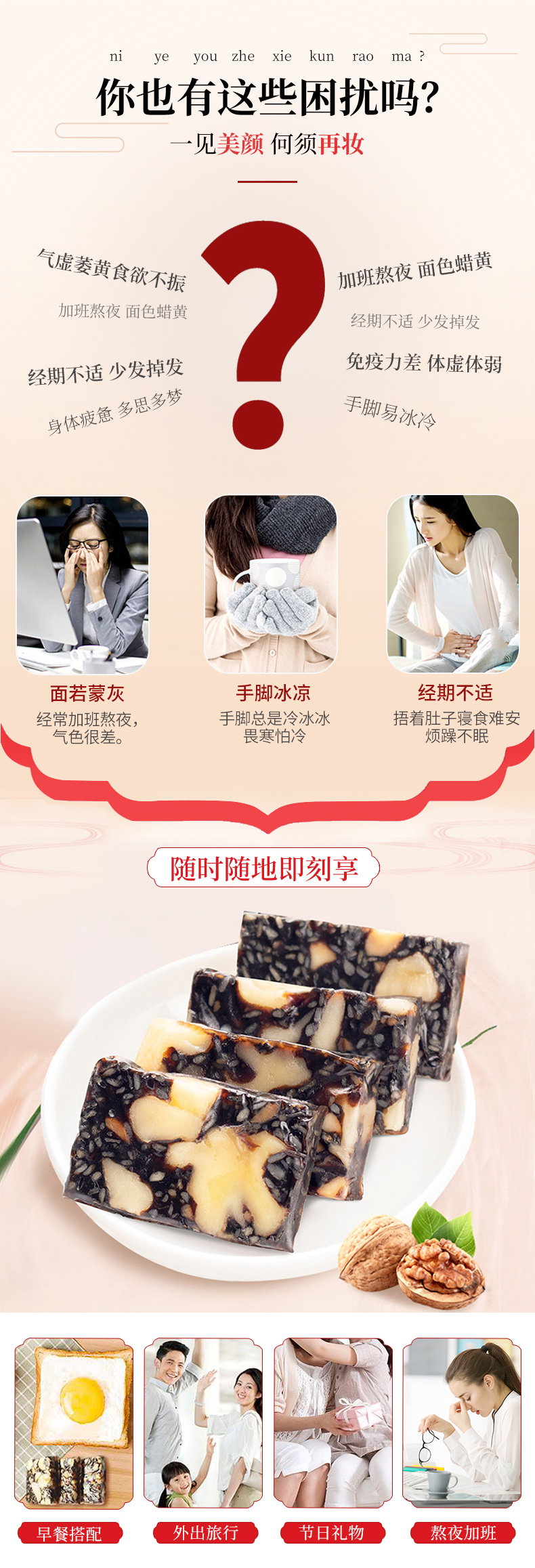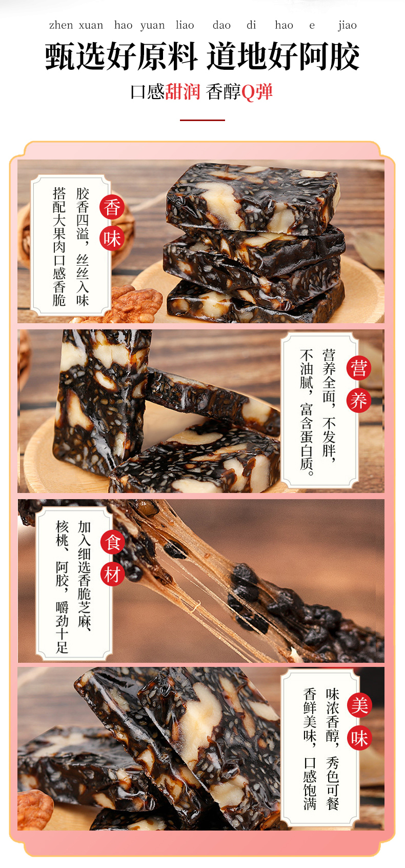 女人如花,需要胶养!阿胶固元糕,精选好食材,科学配比,7天纯手工新鲜熬制,营养不流失,独立包装,每天一块,养出好气色,养生女孩赶紧下手!