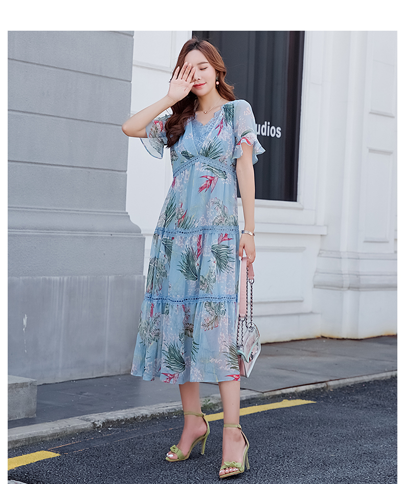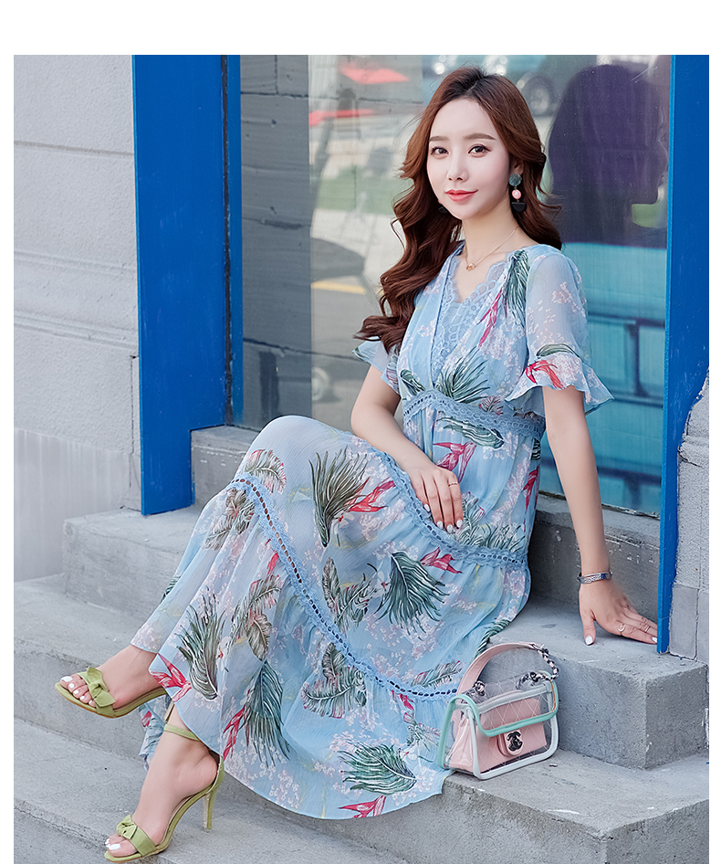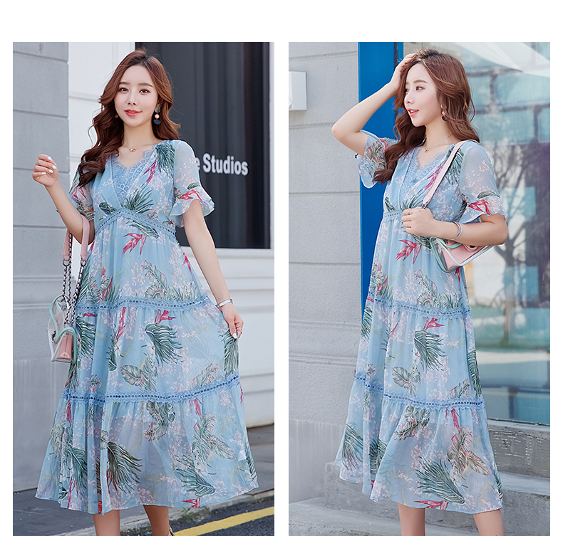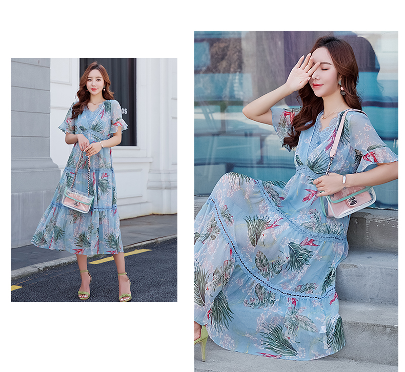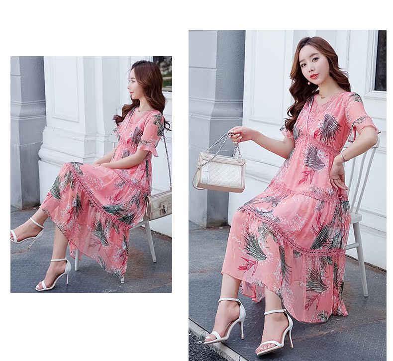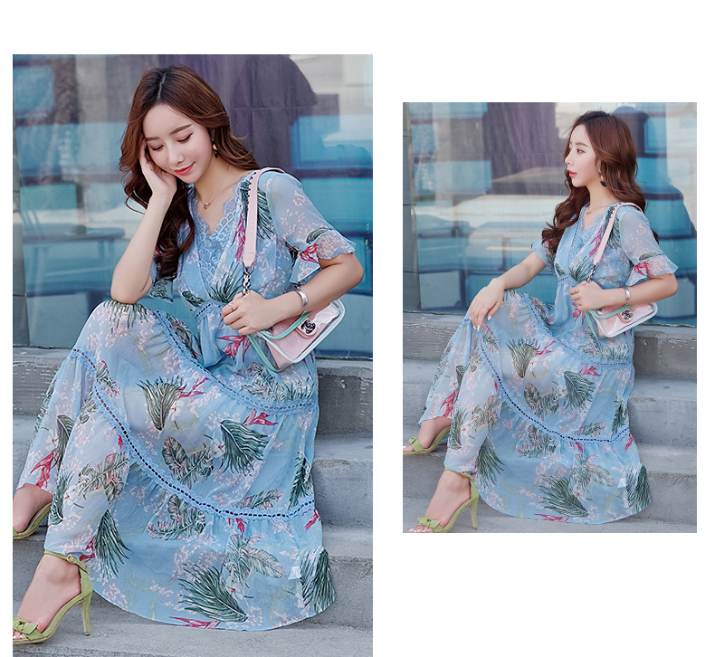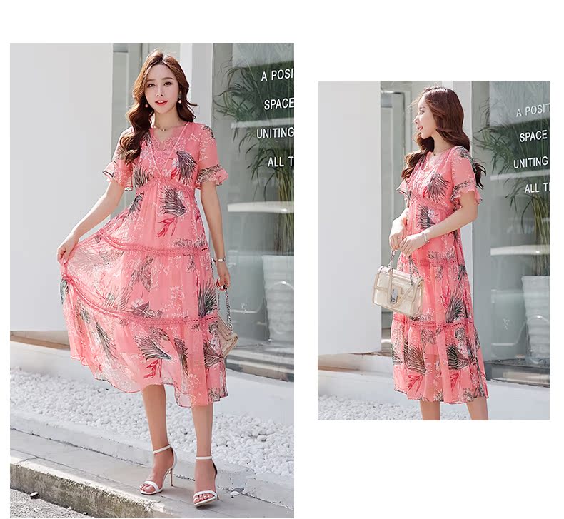 欧诗曼锦雪纺连衣裙两件套2019新款夏季碎花过膝长裙女