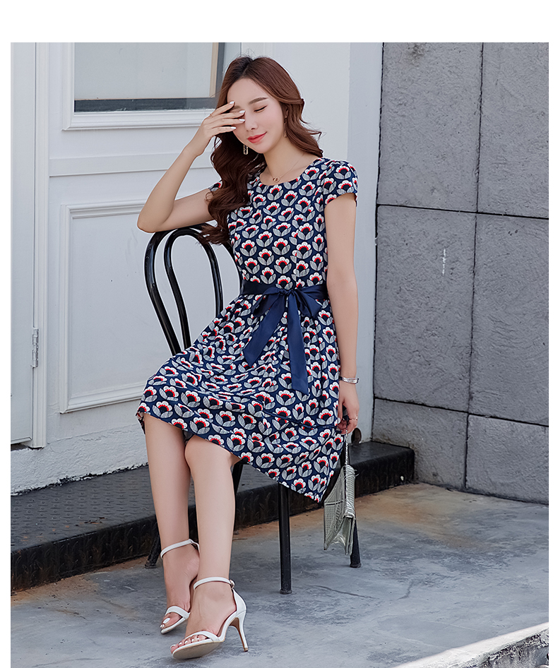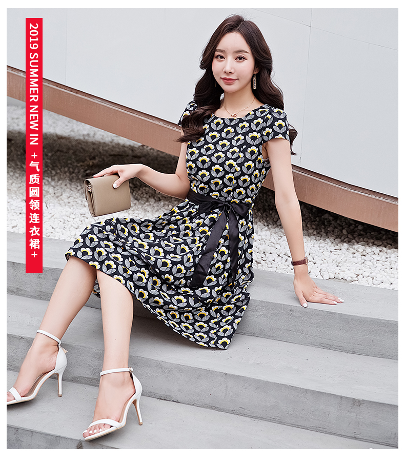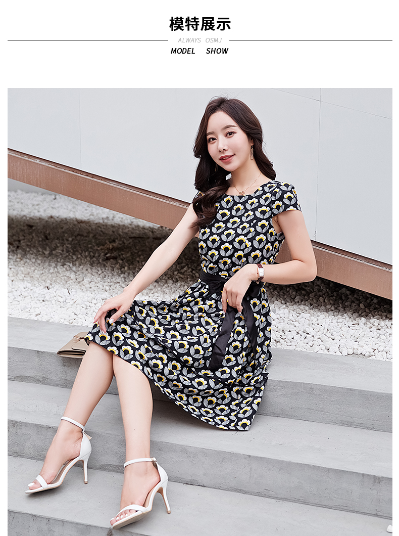 欧诗曼锦复古印花连衣裙2019夏季新款圆领收腰修身a字裙