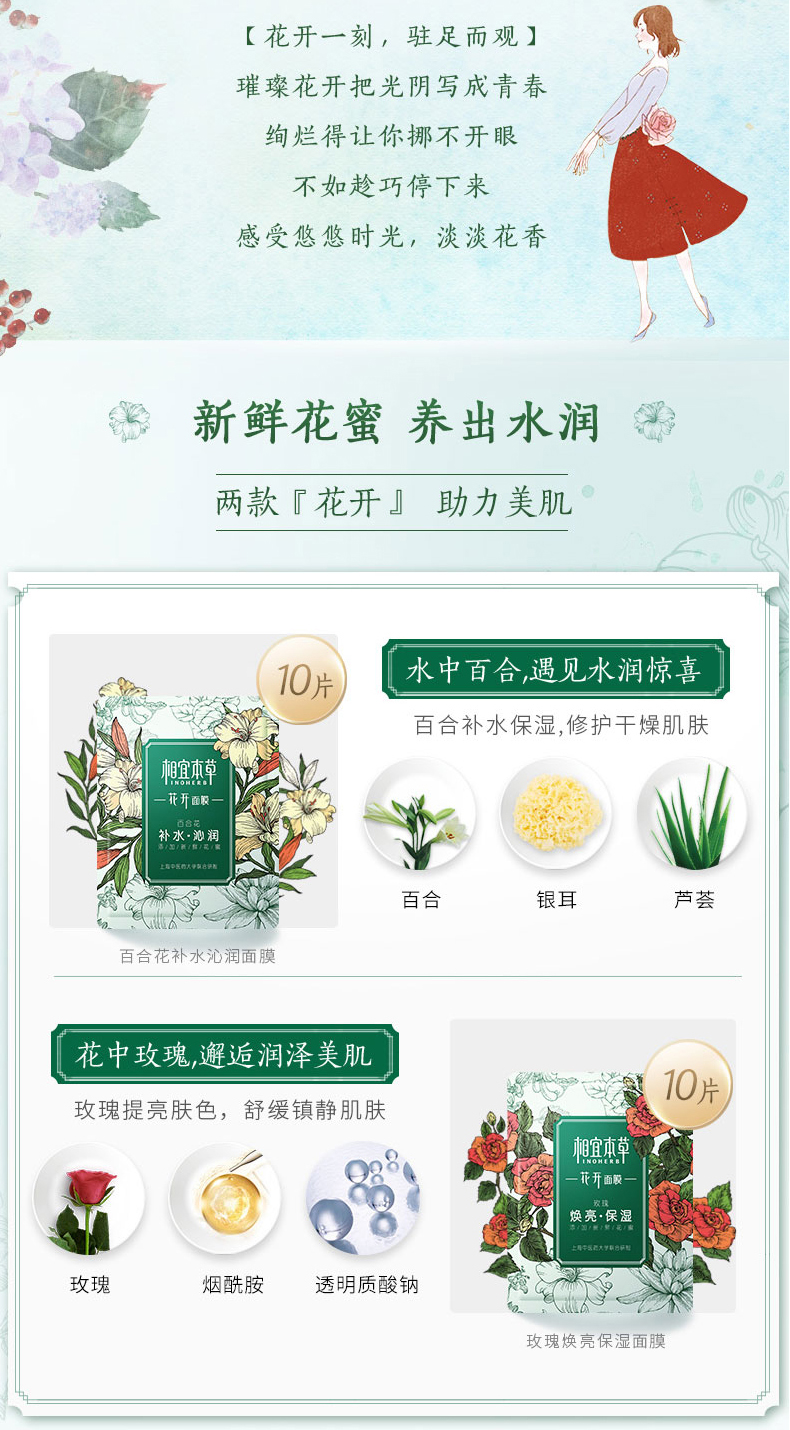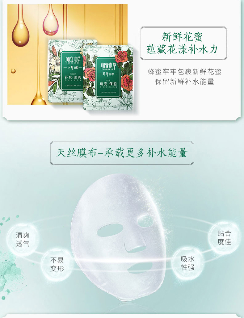 送10片共30片,国货口碑,实力取胜,补水沁润,新鲜花蜜润养,唤醒甜蜜美肤,提亮肤色,舒缓镇静肌肤,以花养肌,温和深润,花蜜营养,天丝膜布,承载更多补水能量,清爽透气,吸水性强,贴合度佳