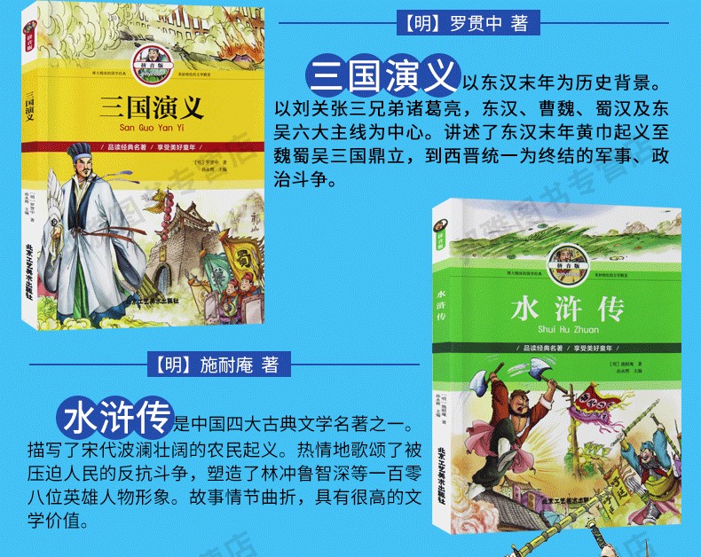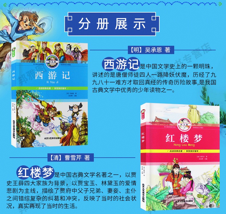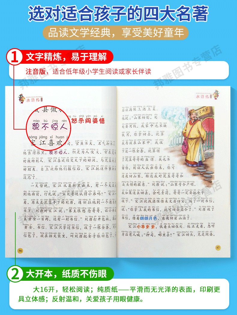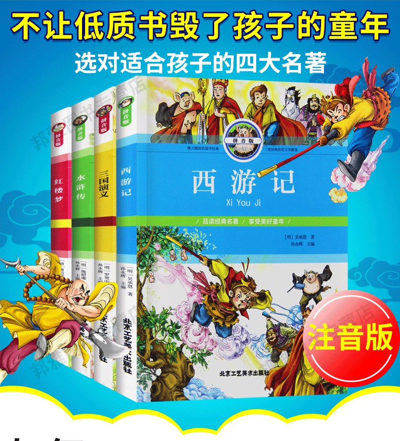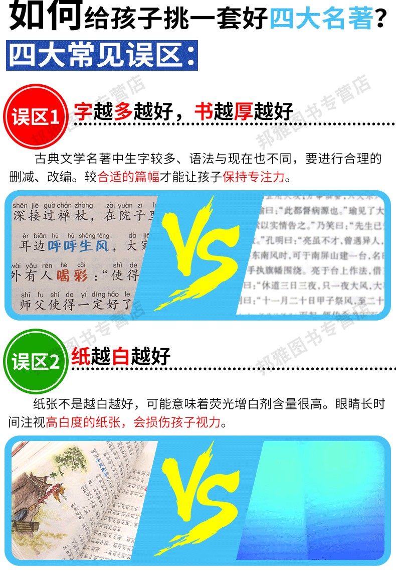 中国古典四大文学名著,完整足本无删减,西游记,水浒传,红楼梦,三国演义全4册,环保硬壳+锁线装订,高清印刷,文字清晰,白话文无障碍阅读,让孩子全面了解又不感到枯燥!