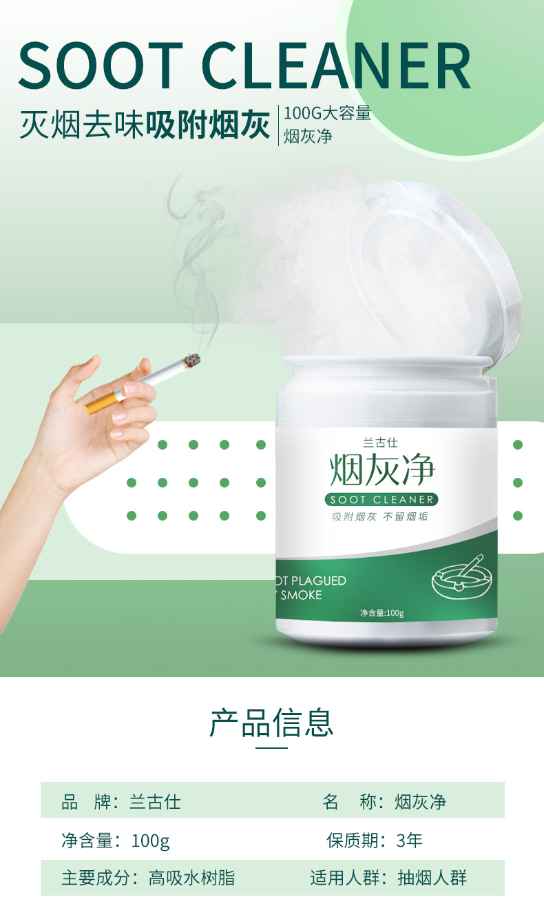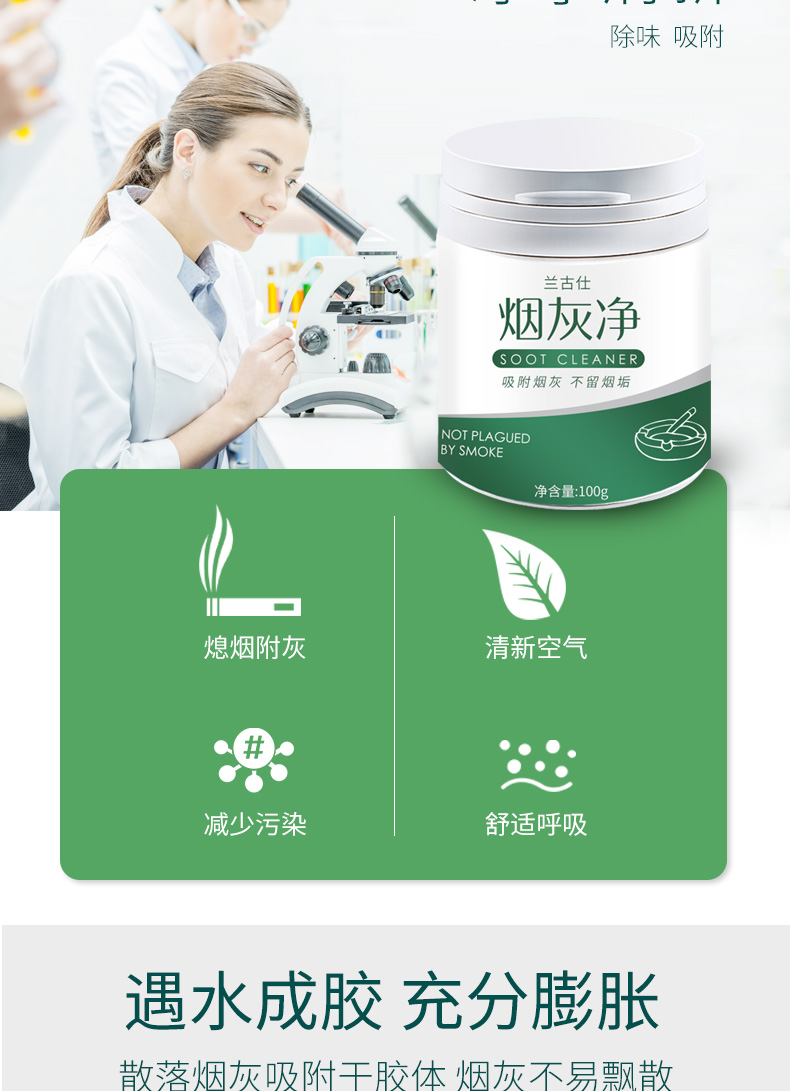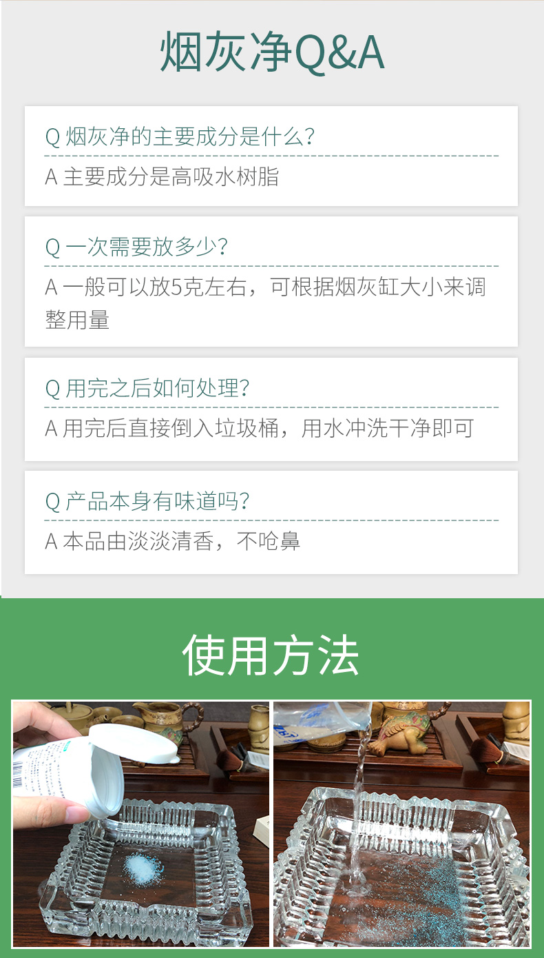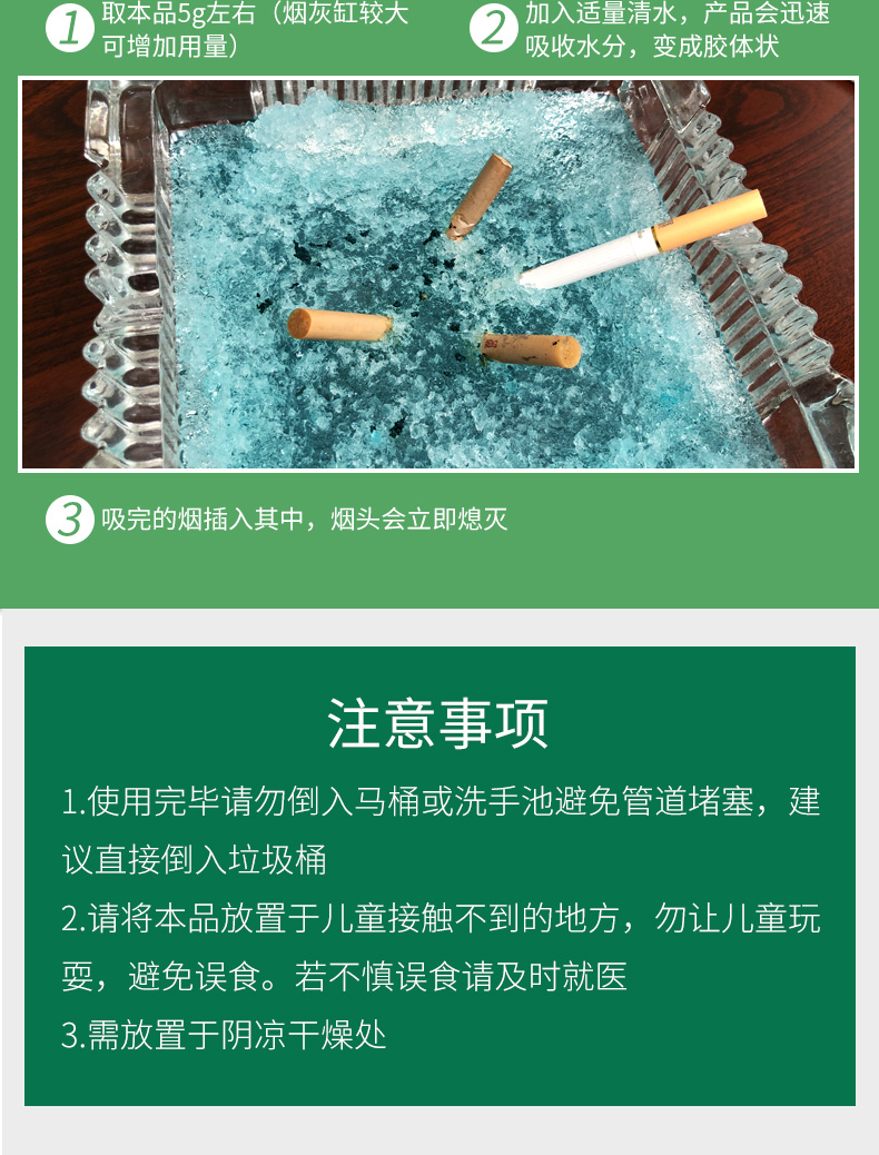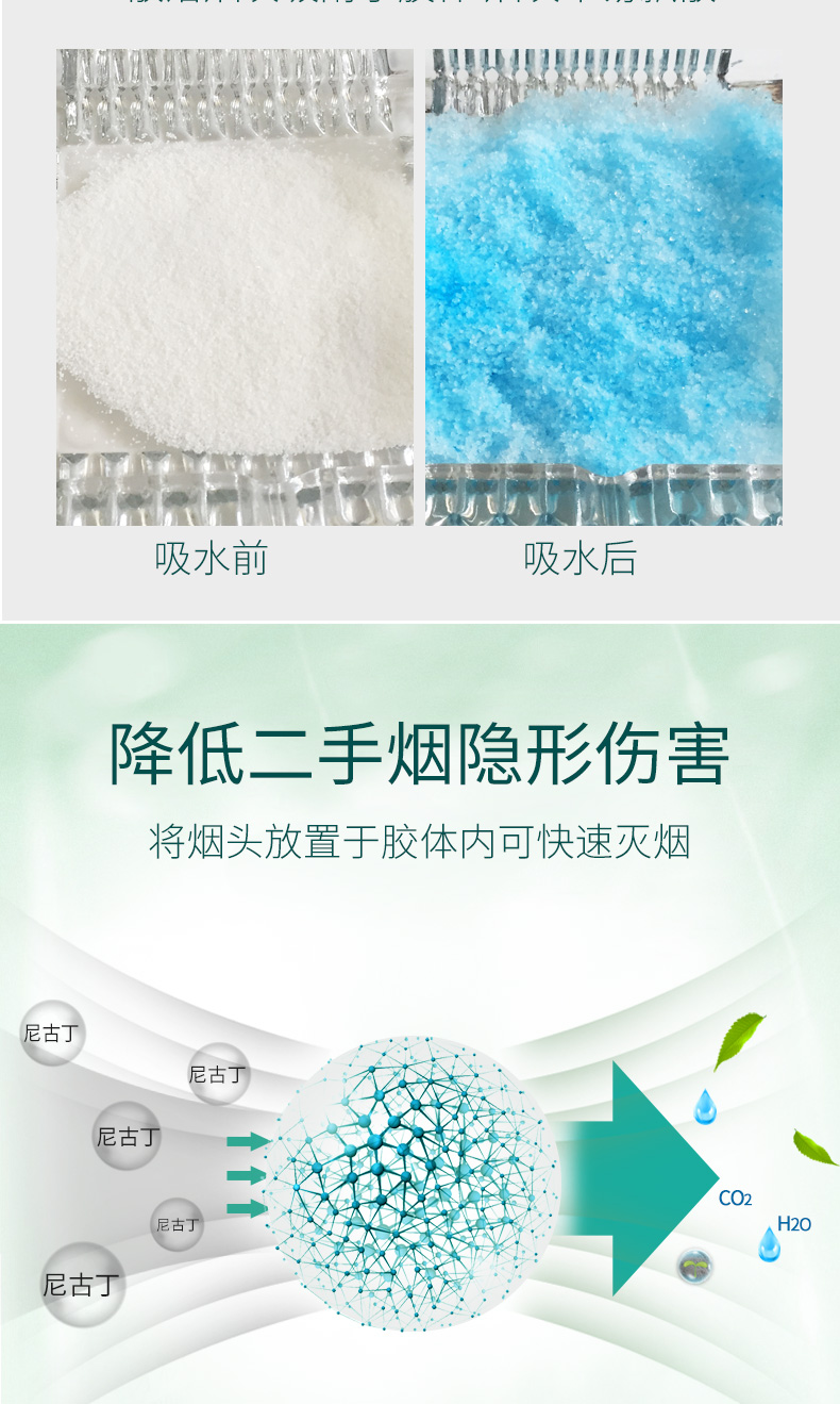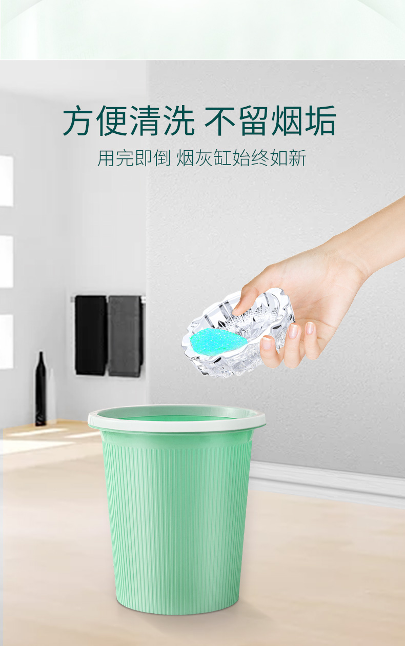 灭烟除味,净享清新,散落烟灰吸附于胶体烟灰不易飘散,将烟头放置于胶体内可快速灭烟,用完即倒,烟灰缸始终如新。