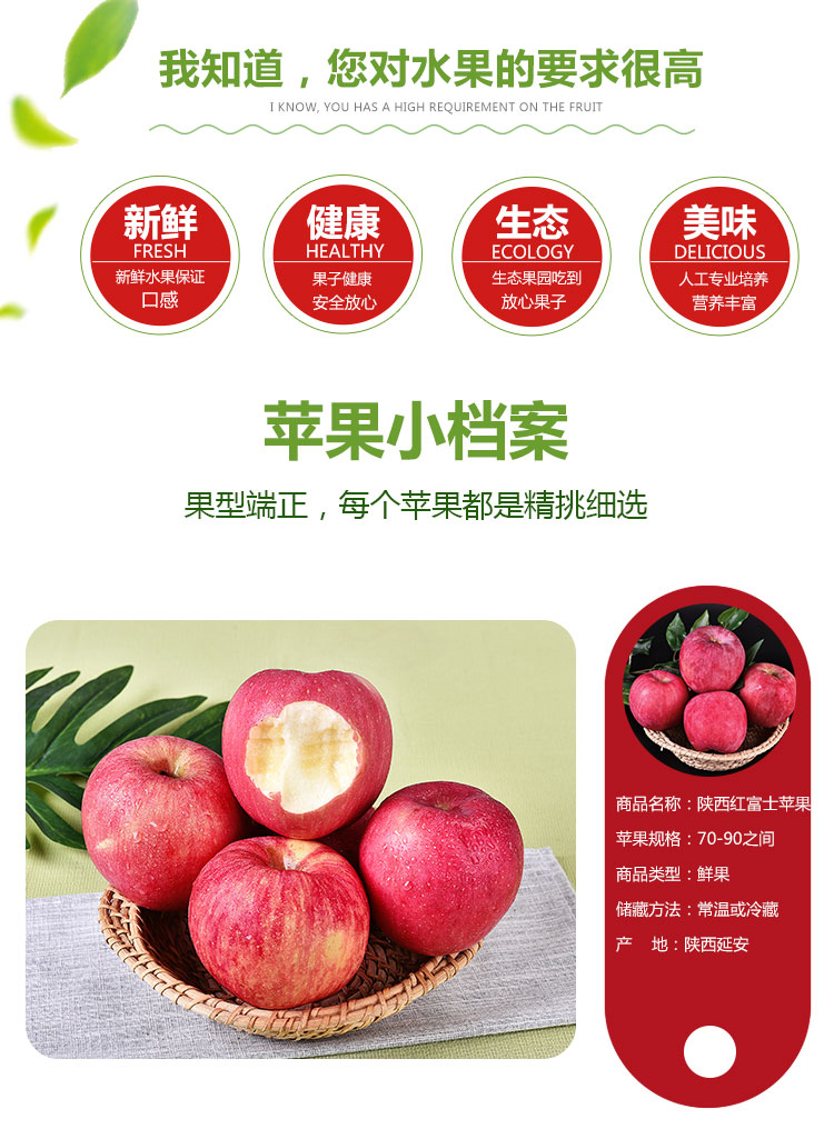 甜过初恋~久违的脆甜可口大苹果来了!来自陕西的红富士大苹果,天然无污染,绿色有机不打蜡!很好吃的苹果,脆甜多汁儿,锁住新鲜,美味无需等待!