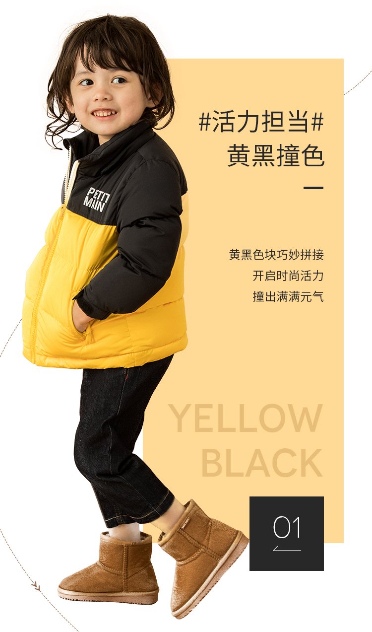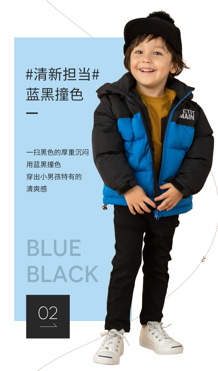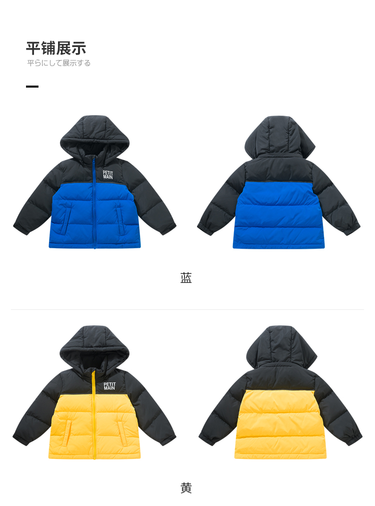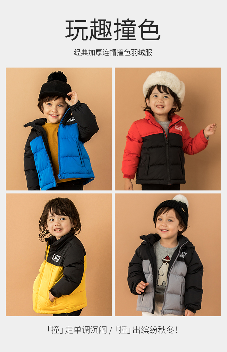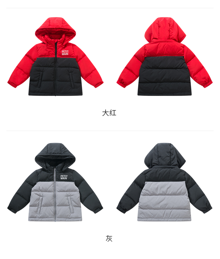 petitmain童装2019秋冬新款男童保暖外套时尚撞色加厚连帽羽绒服