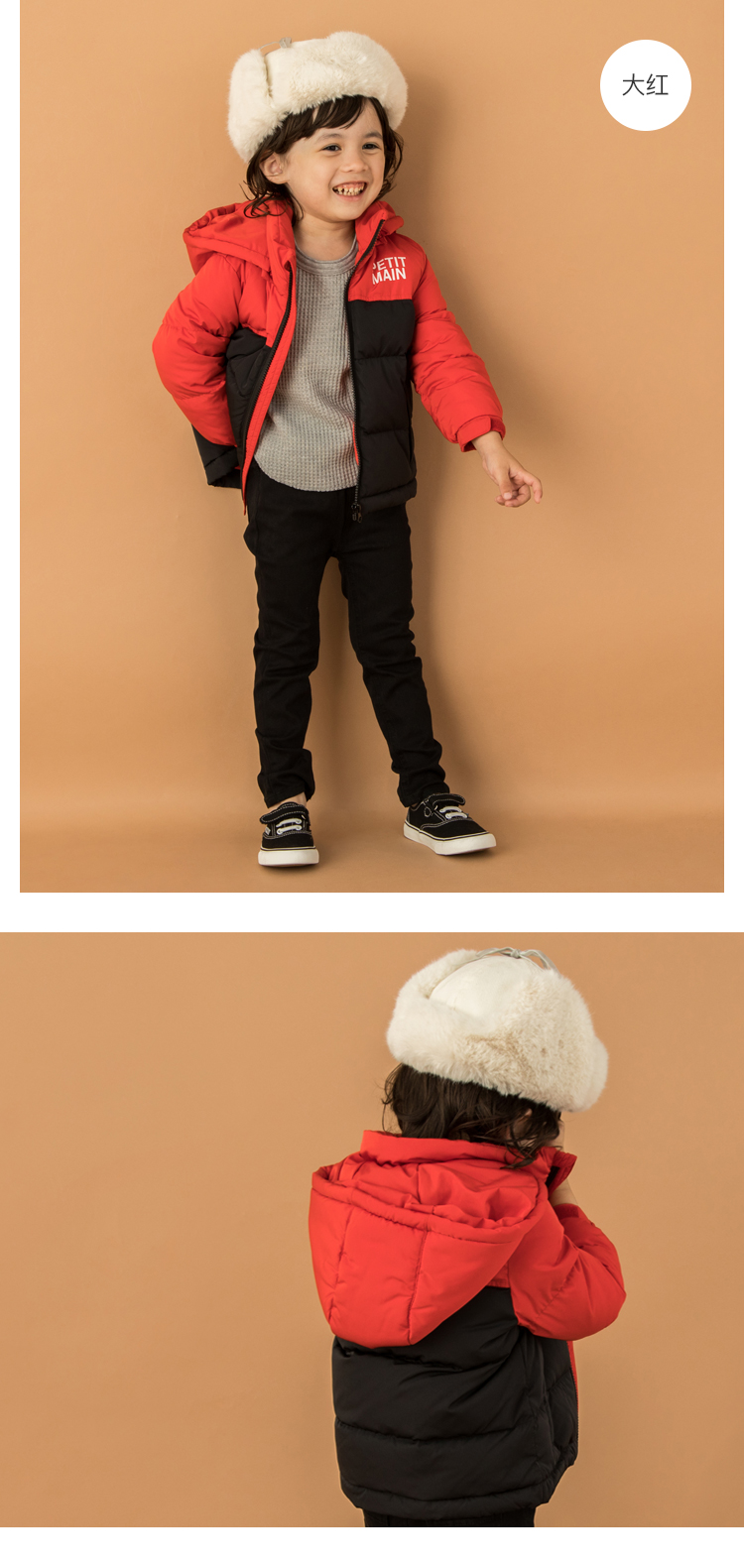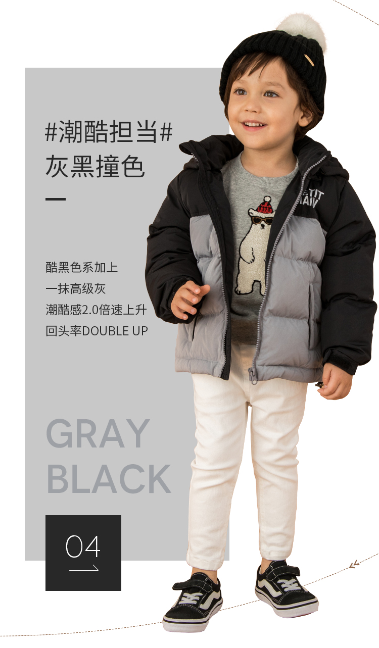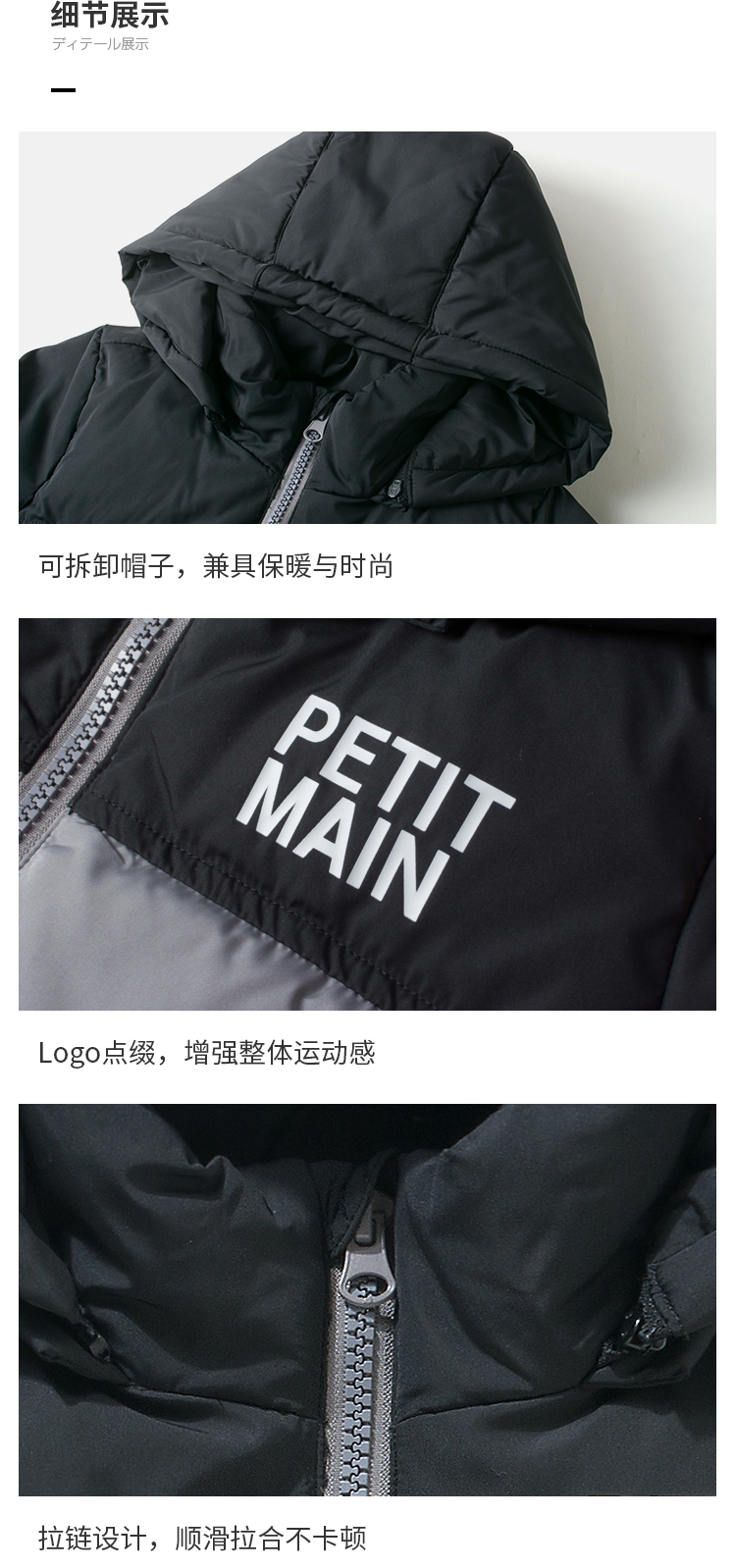 petitmain童装2019秋冬新款男童保暖外套时尚撞色加厚连帽羽绒服