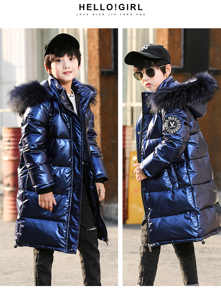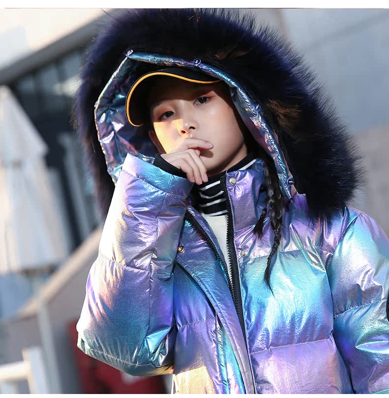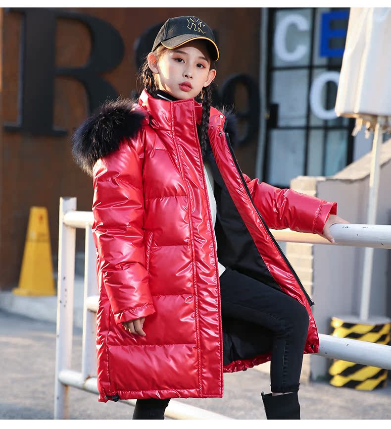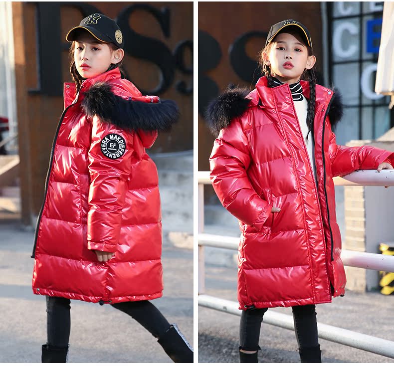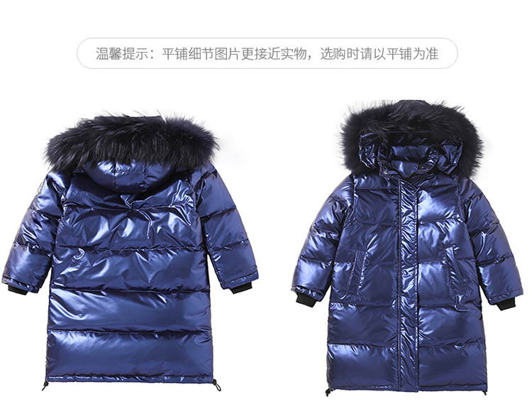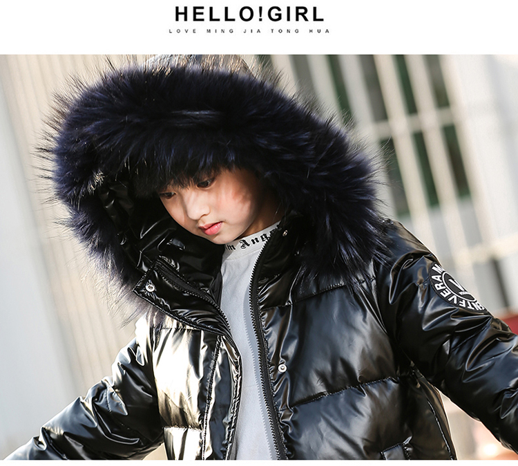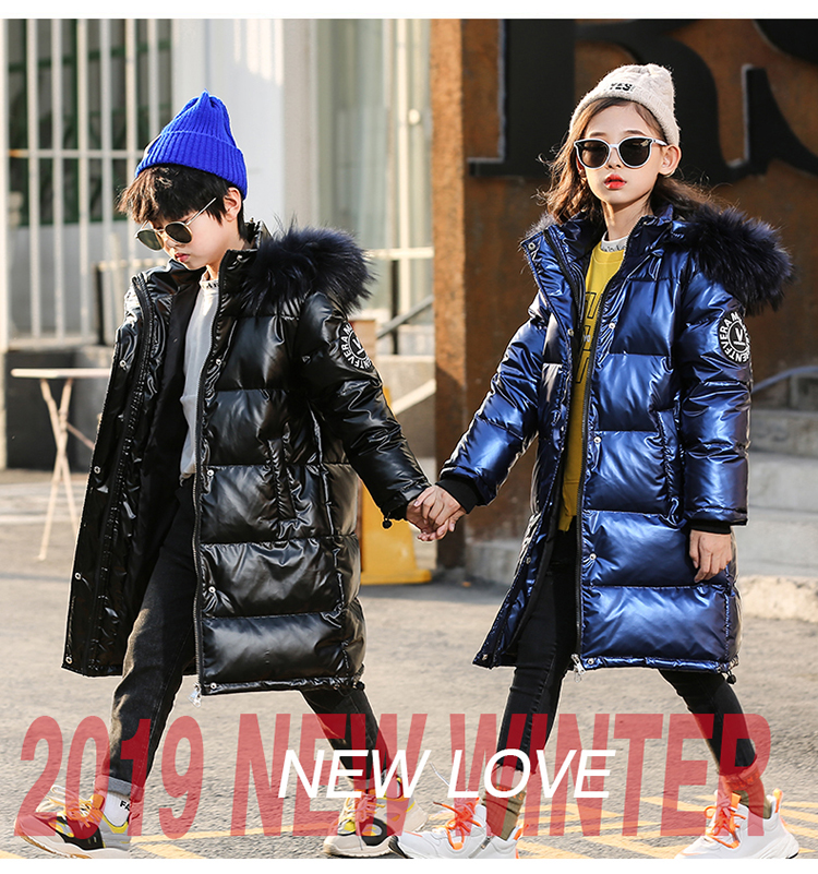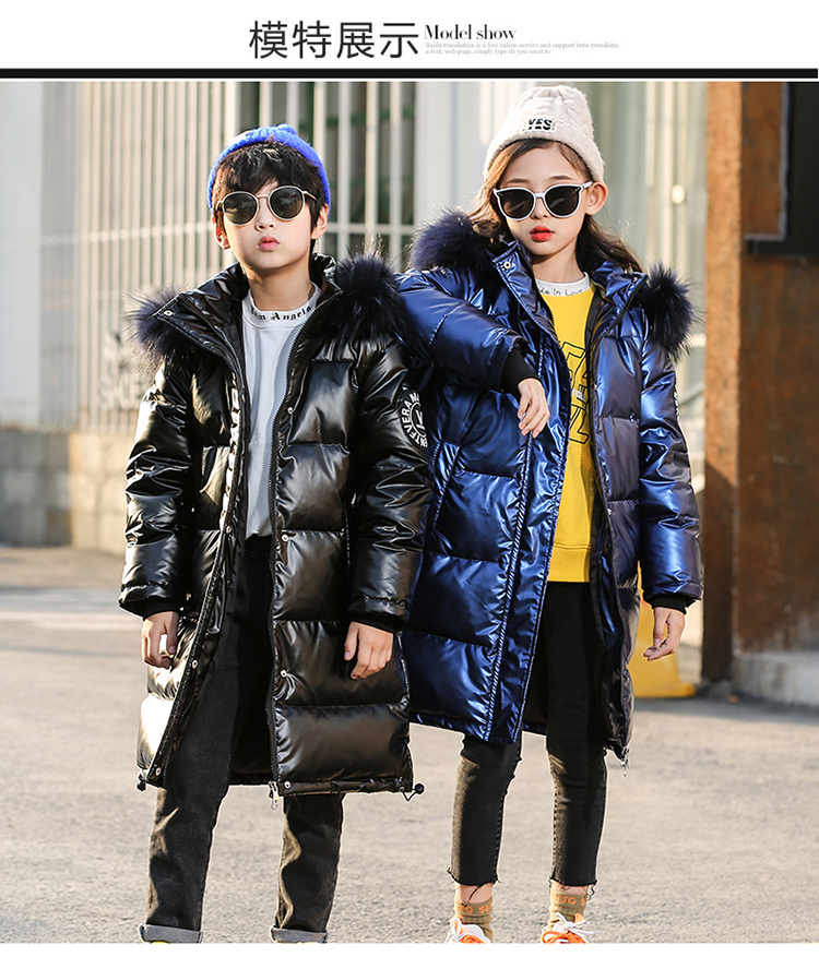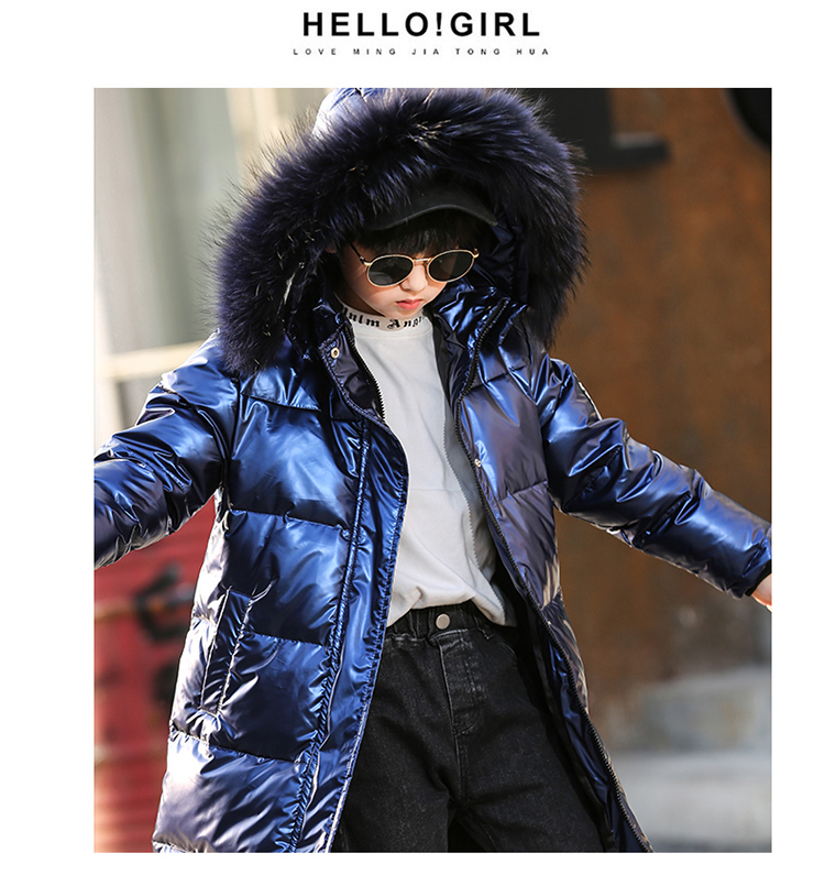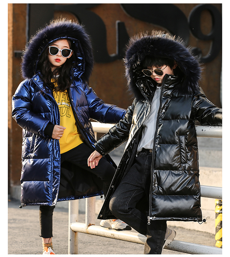 儿童羽绒服亮面连帽大毛领大童冬季韩版女童男童中长款2019新款