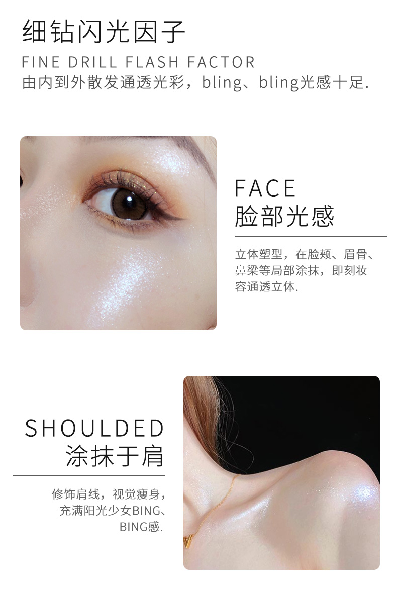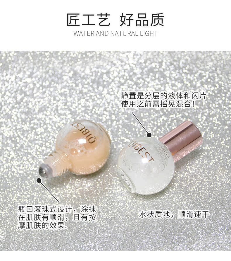 水润闪亮高光液,滚珠式设计,易上手,顺滑速干,立体塑型,内含细钻闪光因子,比固体高光更细腻,针对不同脸型,高光与阴影的完美结合,让你拥有立体妆容!防水防汗不易脱妆!