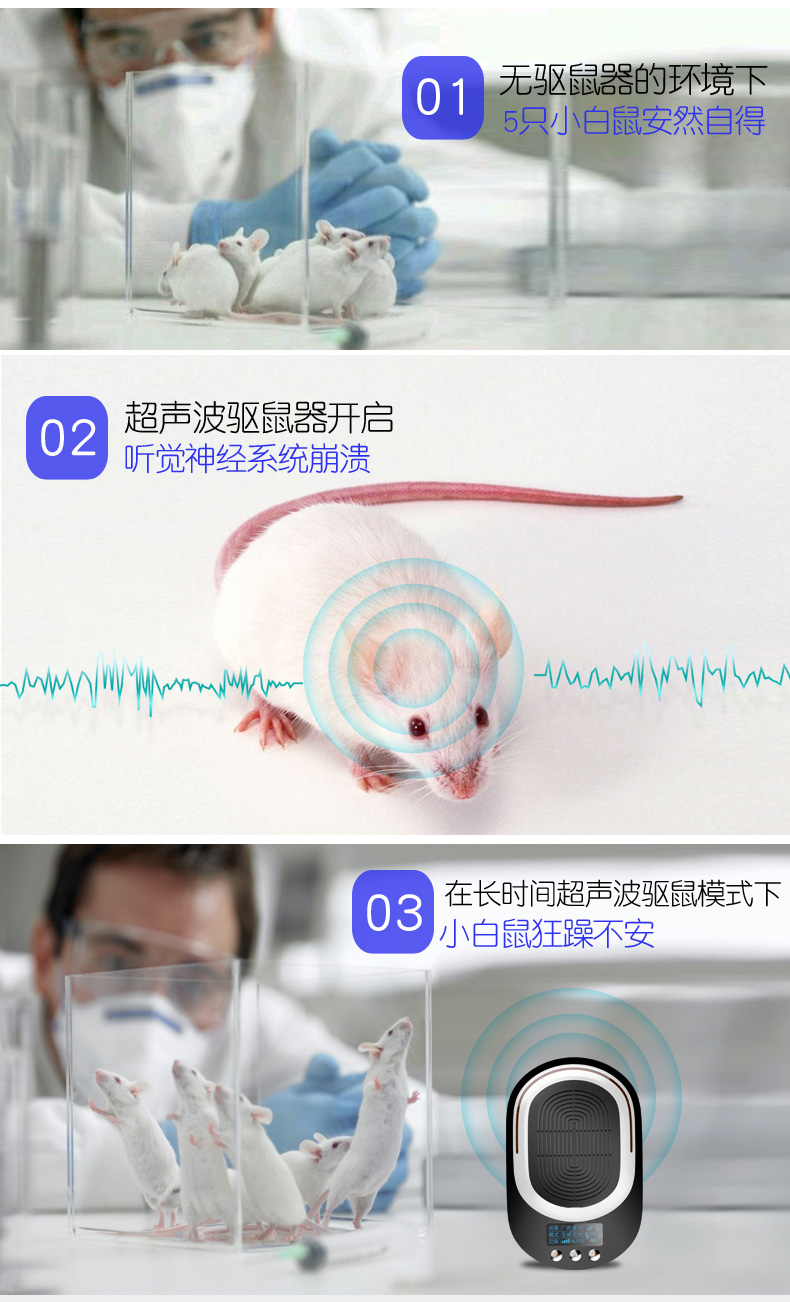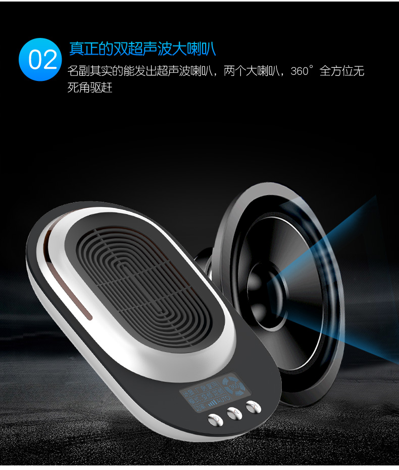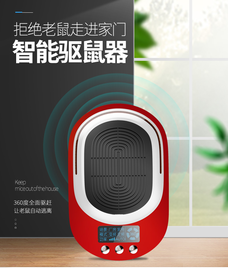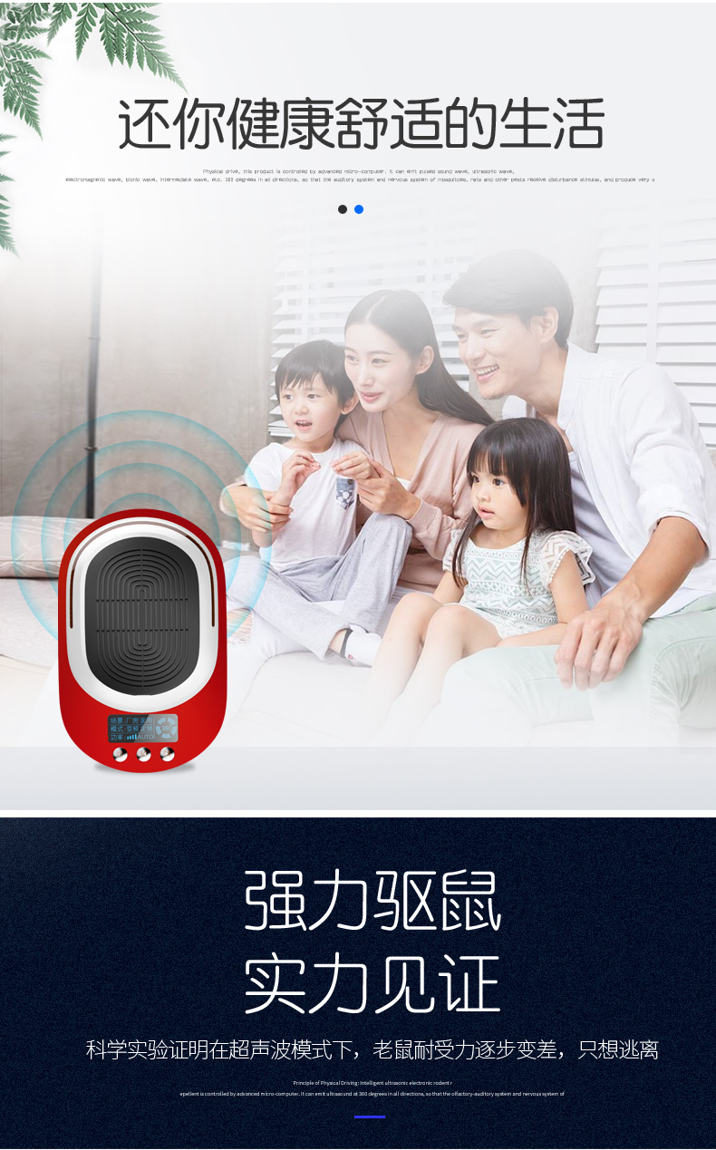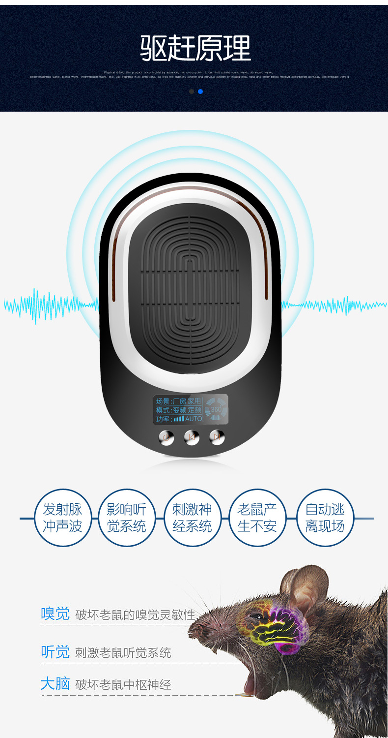 家用超声波驱鼠器,360度全方位发射超声波,智能变频驱鼠,120天无效退换,静音无噪,孕婴皆适用。双喇叭全面攻击,150平大面积覆盖,彻底解决鼠害,还您一个健康安静的生活!