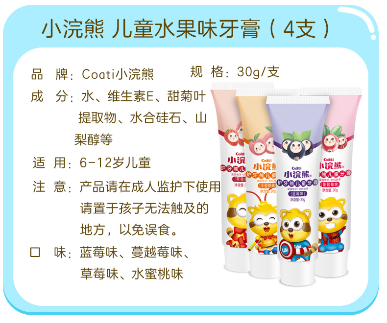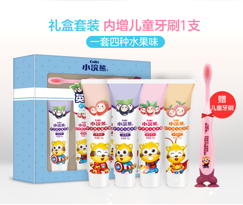【小浣熊旗舰店】小浣熊牙膏套装来咯,买即送3只牙刷~小浣熊专注儿童健康含食品级原料,富含维生素,健齿防蛀~卡通礼盒装,无氟水果味,果味随心搭配妈妈值得信赖!让宝宝爱上刷牙!【赠运费险】