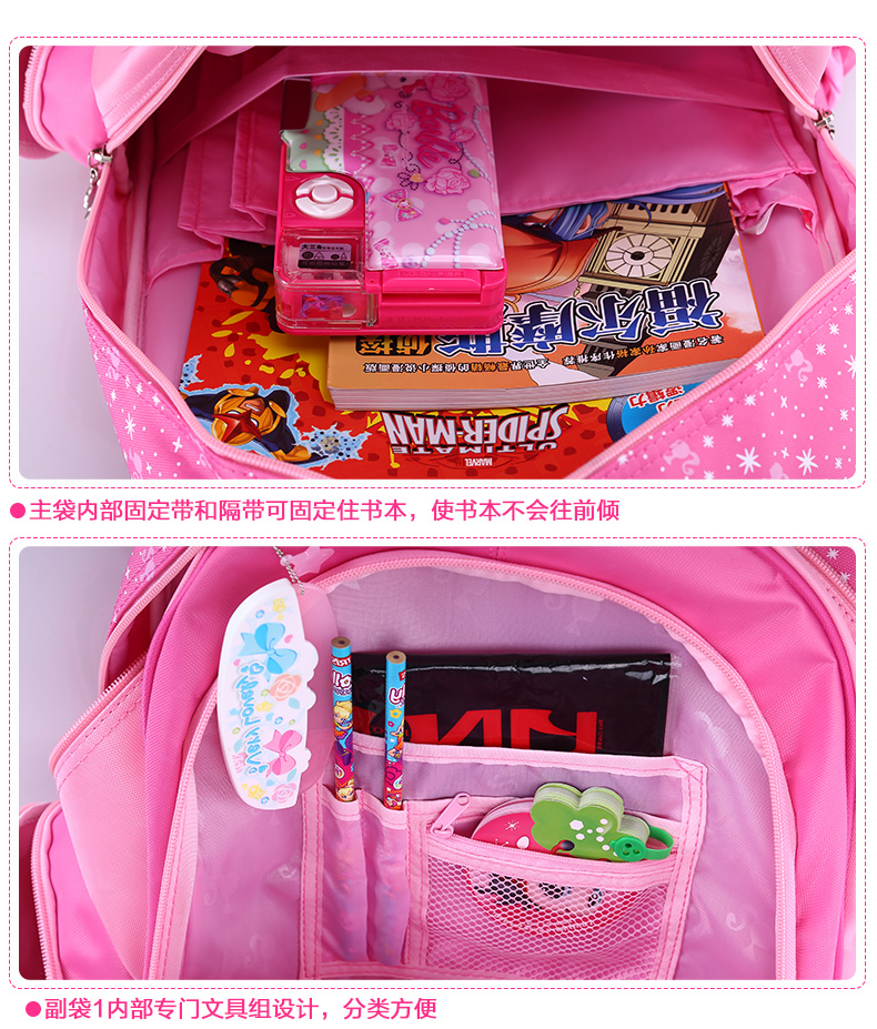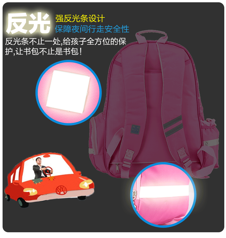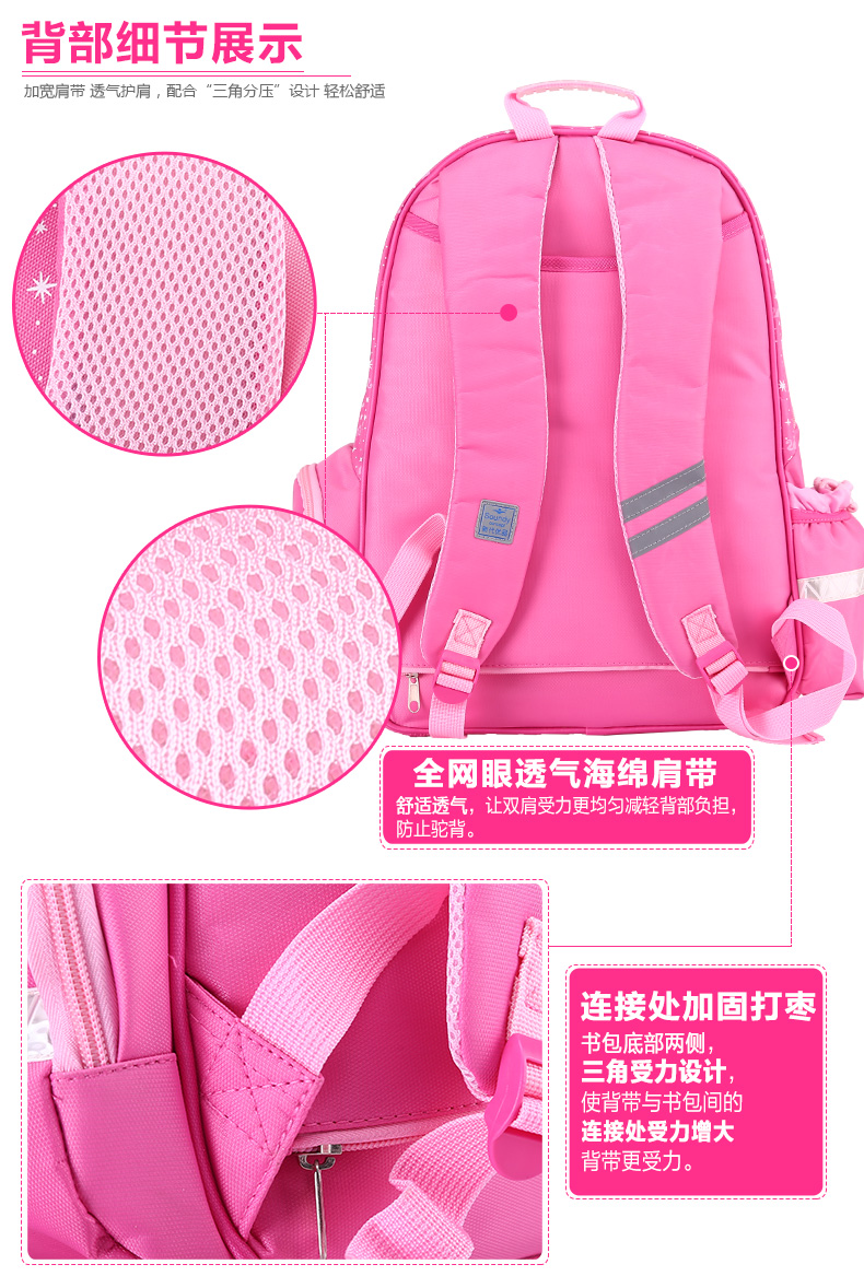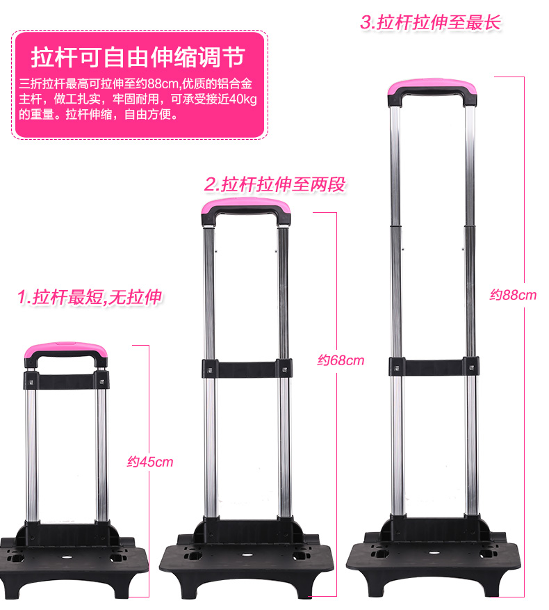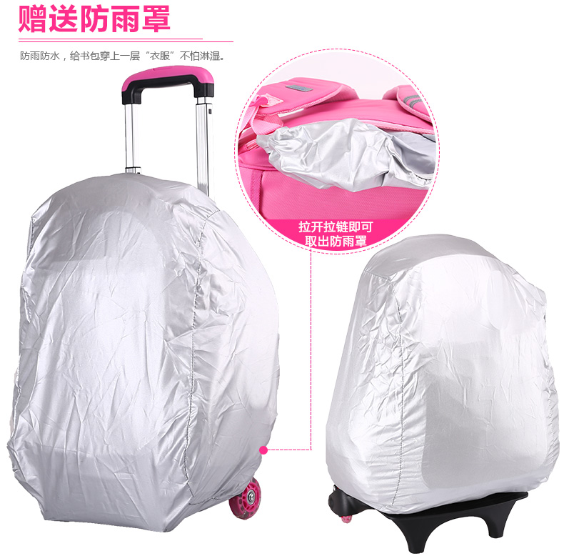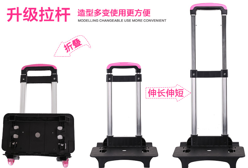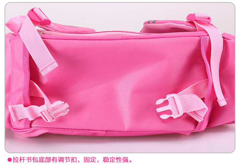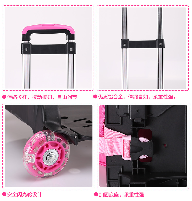 书包底部正面与背面防碰撞摩擦设计,保护书包避免底部摩擦受损!加宽肩带S设计,舒适减负,保护脊椎。三档铝合金拉杆及爬楼三轮设计,带来全新感受 68