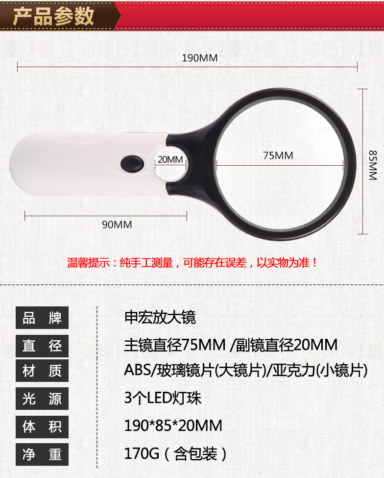 【正品保证】申宏品牌爆款放大镜强烈推荐!!高清高倍,光学手持式,放大镜带LED灯10倍,20倍老人阅读看报便携式。买就送电池!!【赠运费险】