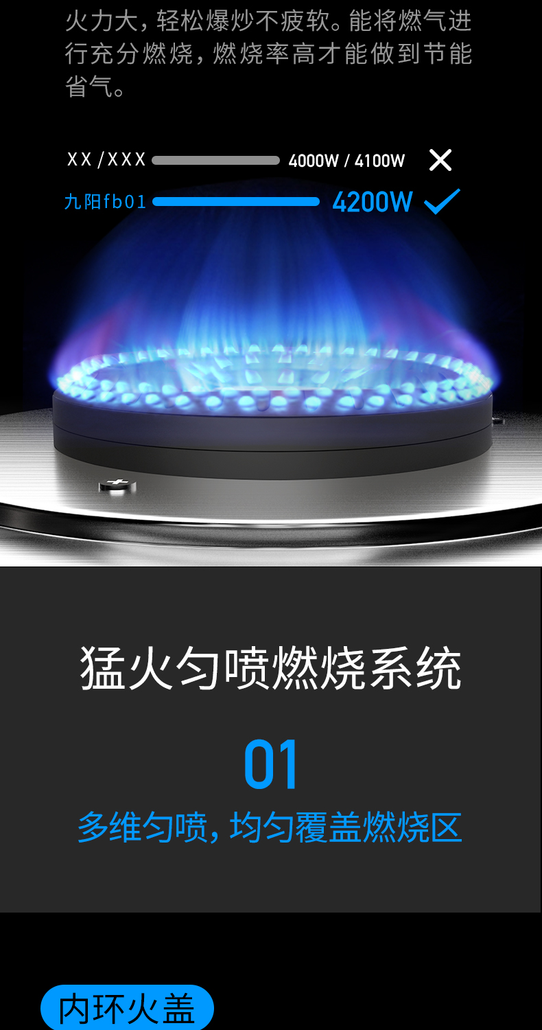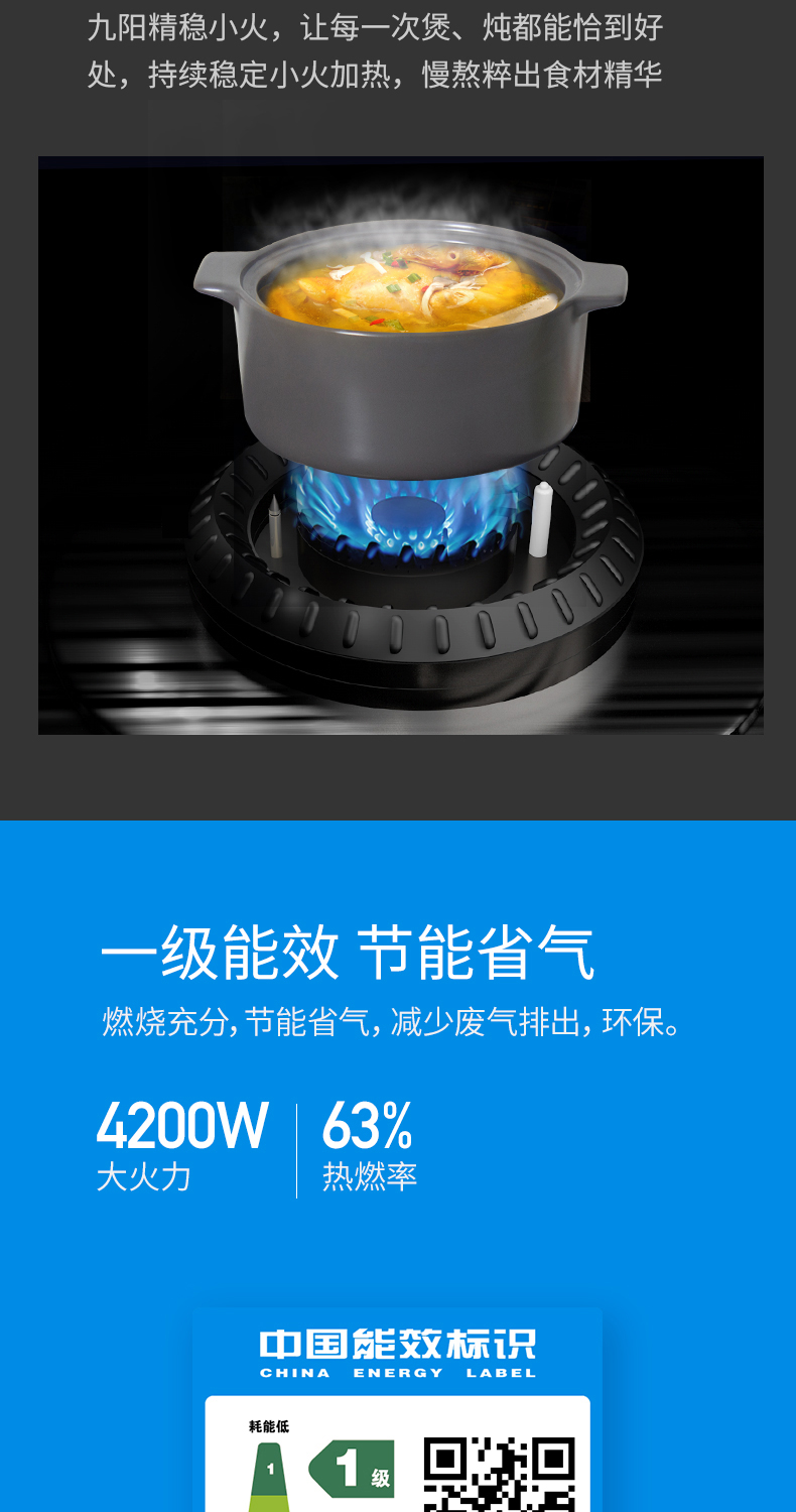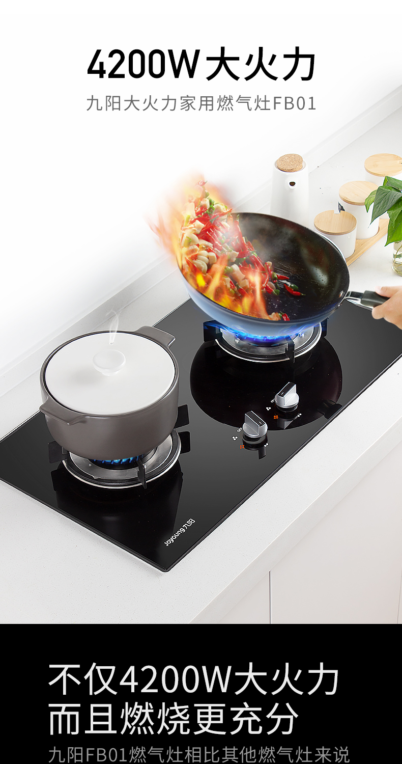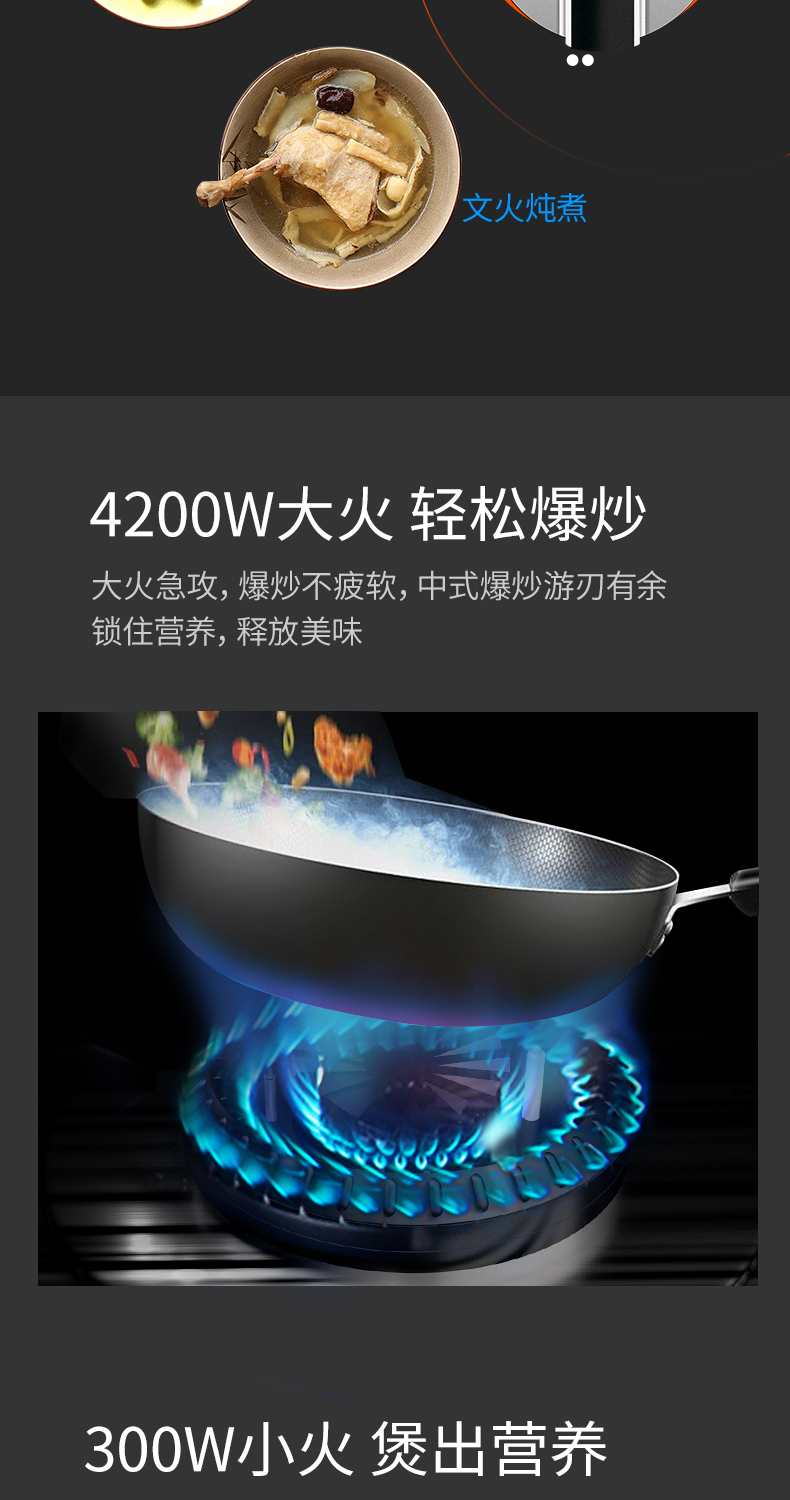 【九阳】4200W大火不疲软,爆炒游刃有余,300-4200W宽幅功率,一级能效标准,熄火保护装置,拒绝燃气泄漏,3重防爆面板,以解面板,台嵌两用。