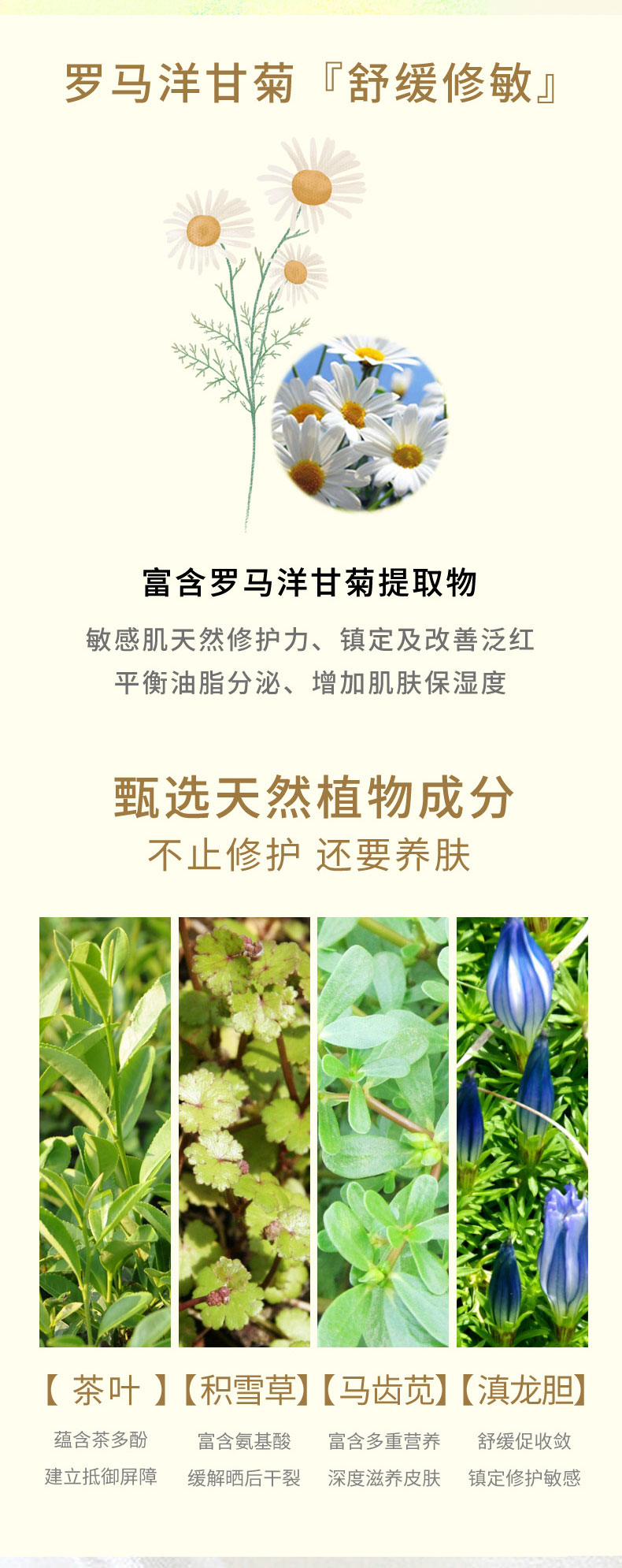 洋甘菊舒缓抗敏,修复敏感缺水肌,复活草水光润透,释放肌肤活力,山茶花净颜水光,水润看的见,蒲公英舒缓修复,痘痘肌的守护天使。