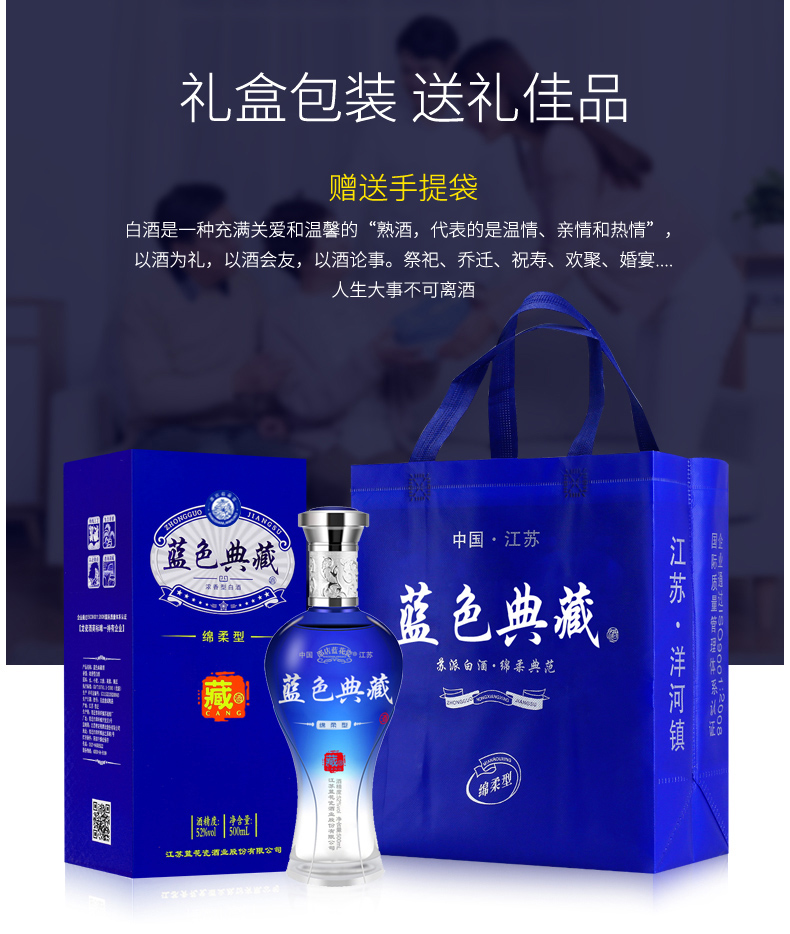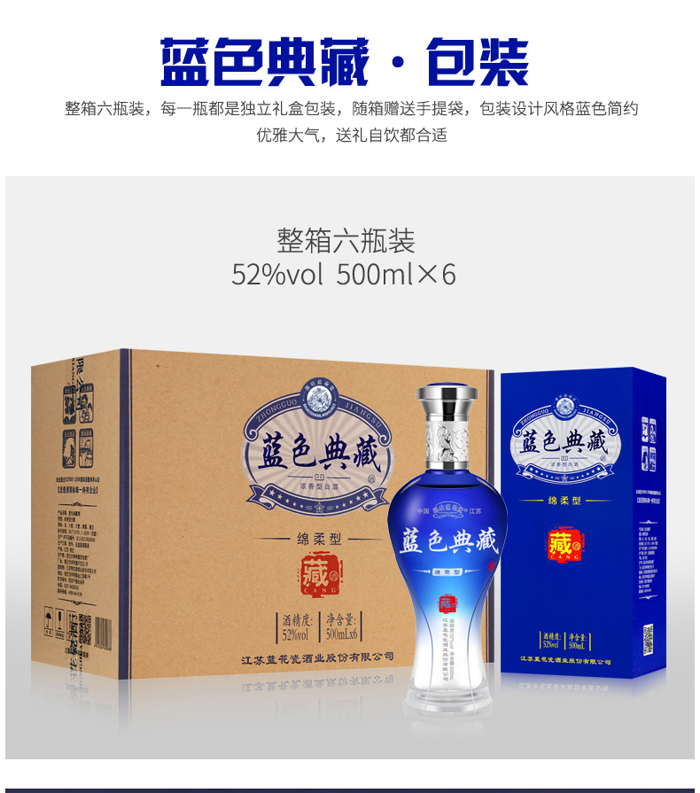 蓝色典藏52度白酒整箱特价6瓶装粮食酒礼盒江苏青花瓷酒厂出品