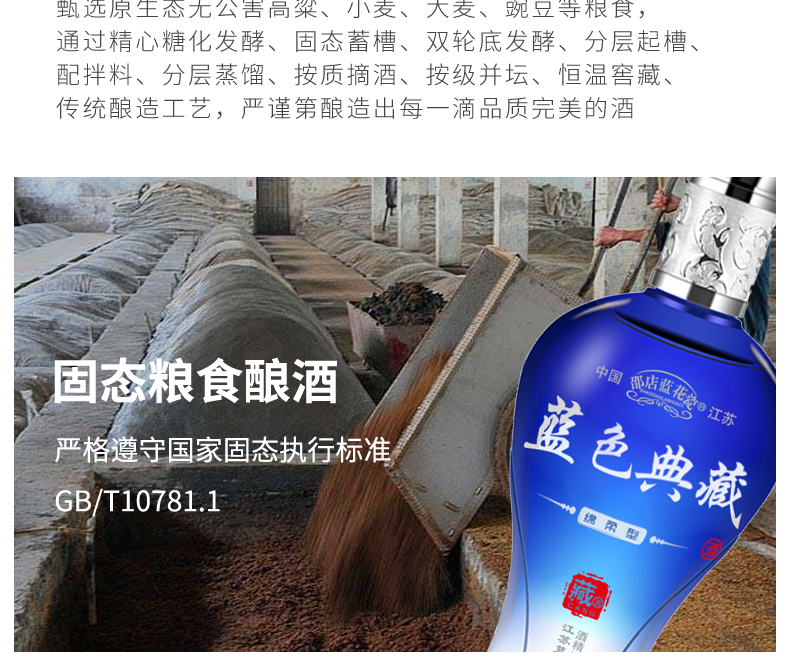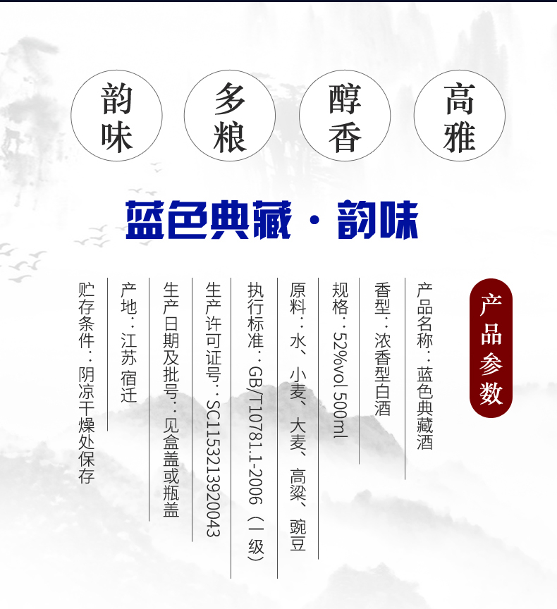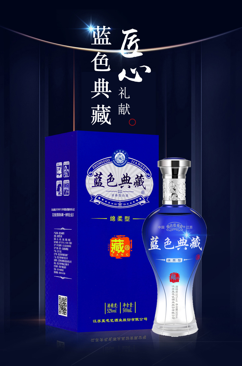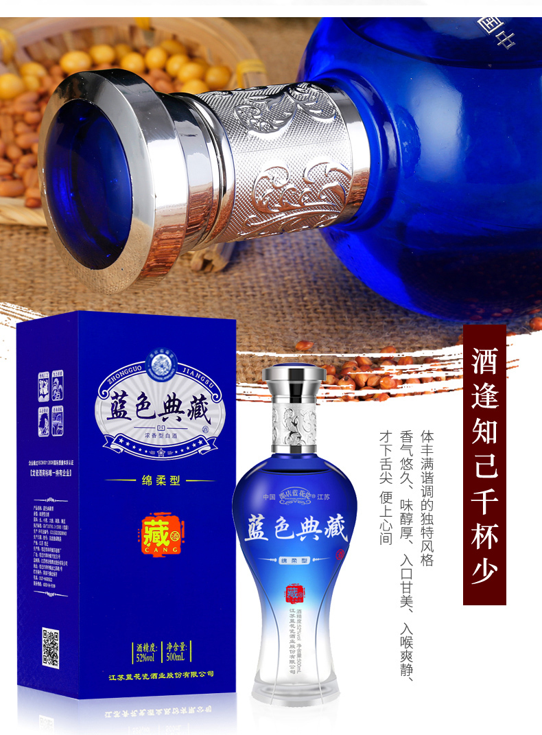 蓝色典藏52度白酒整箱6瓶装粮食酒。酒逢知己千杯少,体丰满堦调的独特风格,香气悠久,味醇厚,入口甘甜,入喉爽静,才下舌尖,便上心间,【破损包赔】