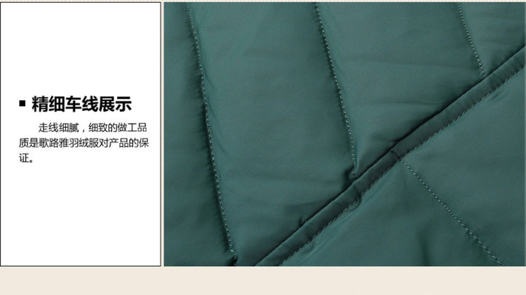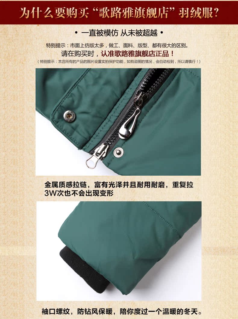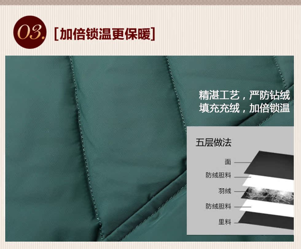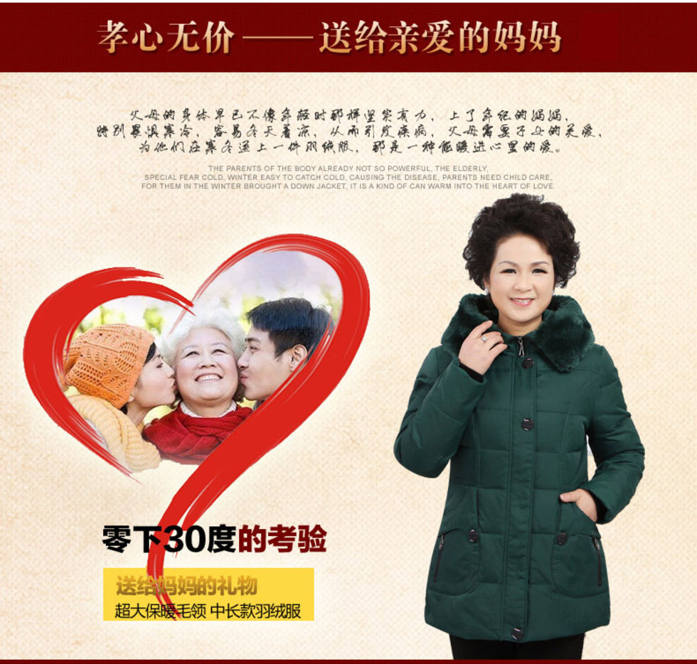 填充优质羽绒,大毛领温暖,金属质感拉链,螺纹袖口,防风保暖,精湛工艺,严防钻绒,舒适大码加厚,羽绒收腰线,为妈妈们打造纤细身腰;给妈妈一个温暖的冬季盛宴!