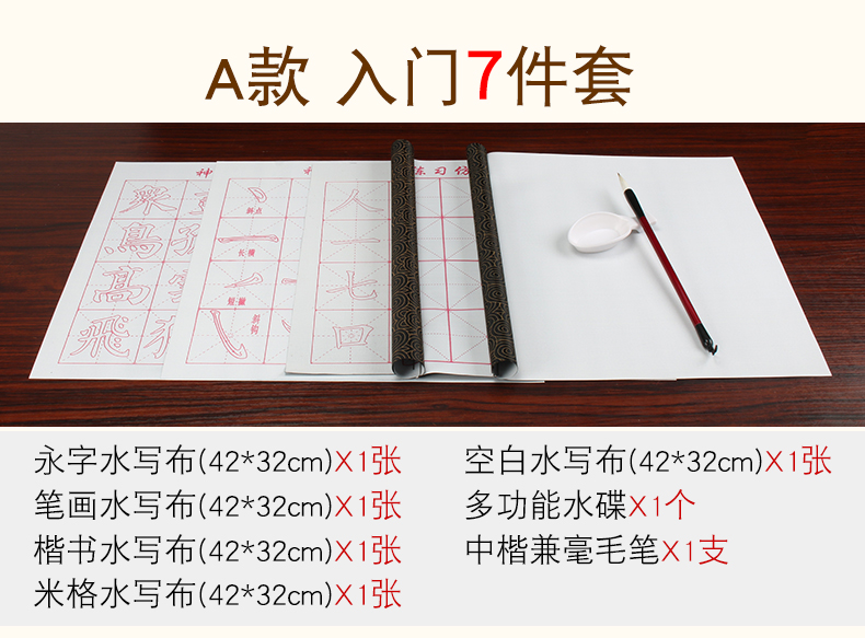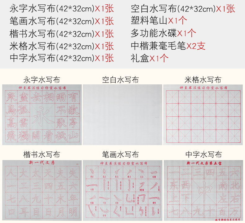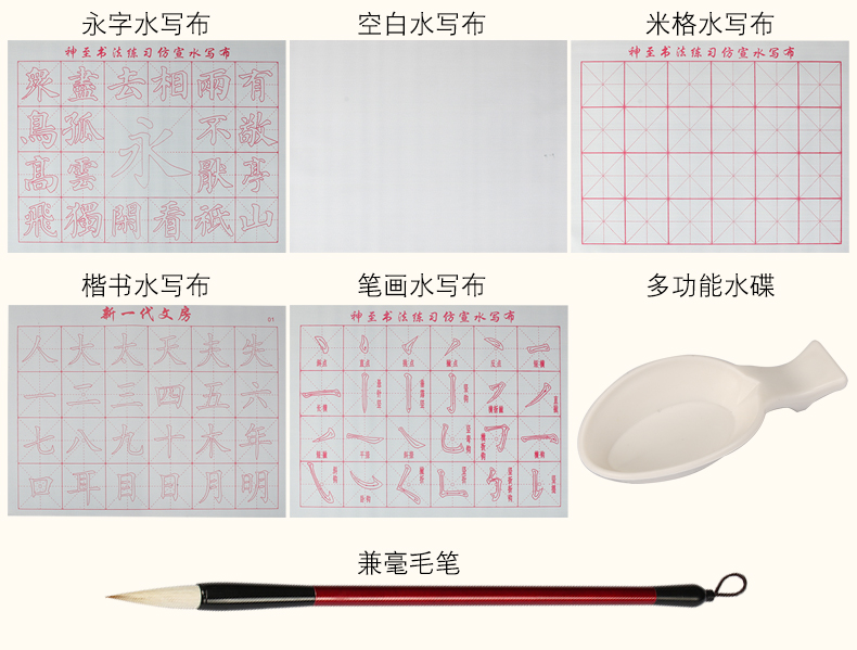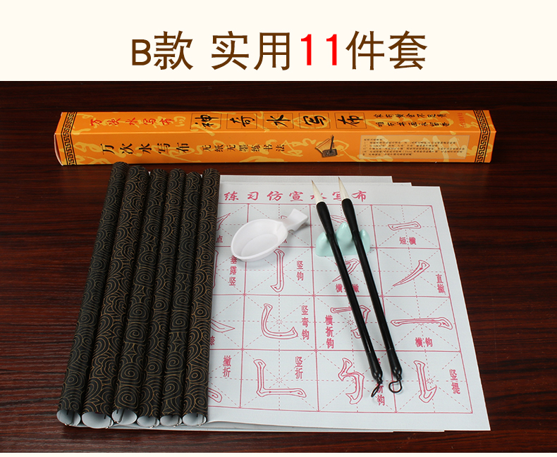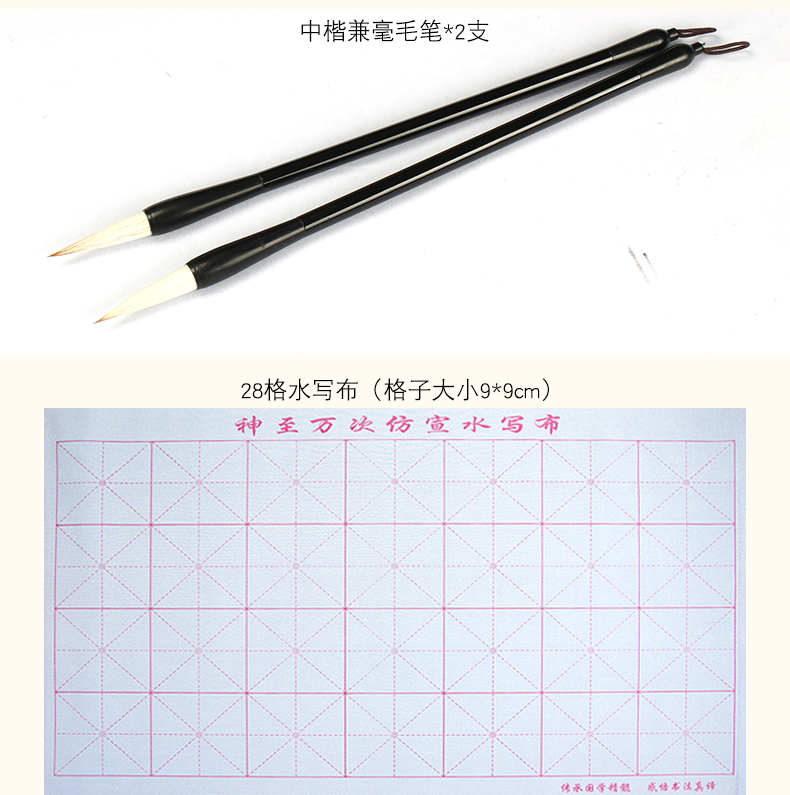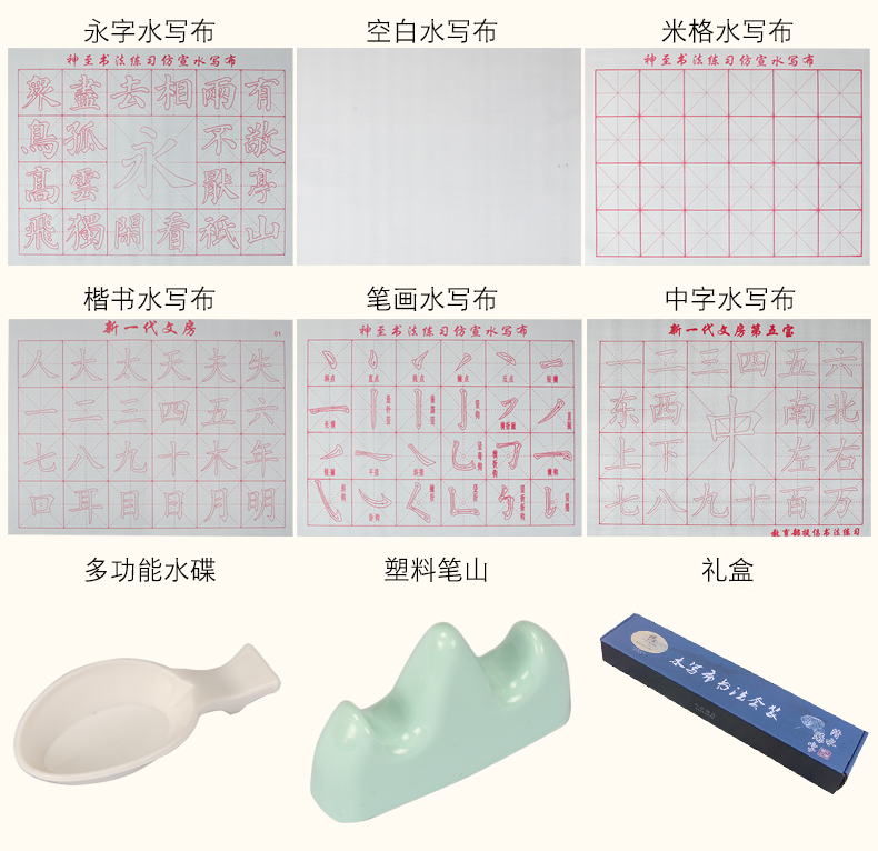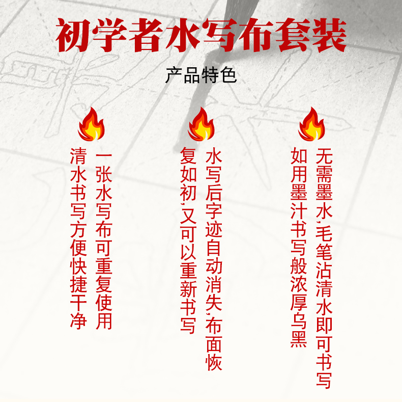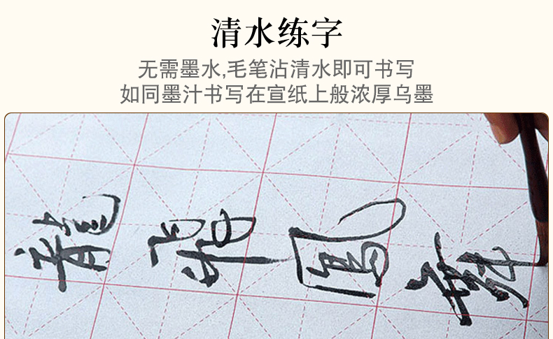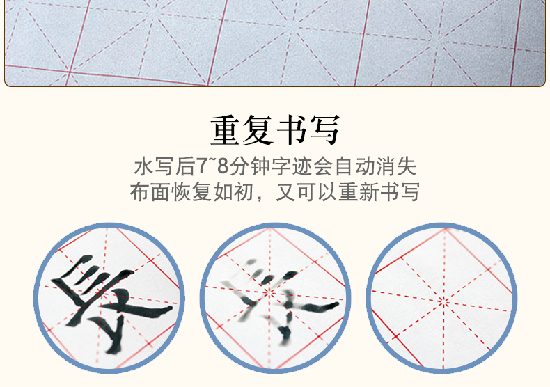 清水练字,无需墨水,毛笔沾清水即可书写,如同墨汁书写在宣纸上般浓墨乌黑,水写后7~8分钟字迹自动消失,布面恢复如初,又可以重复书写~!!