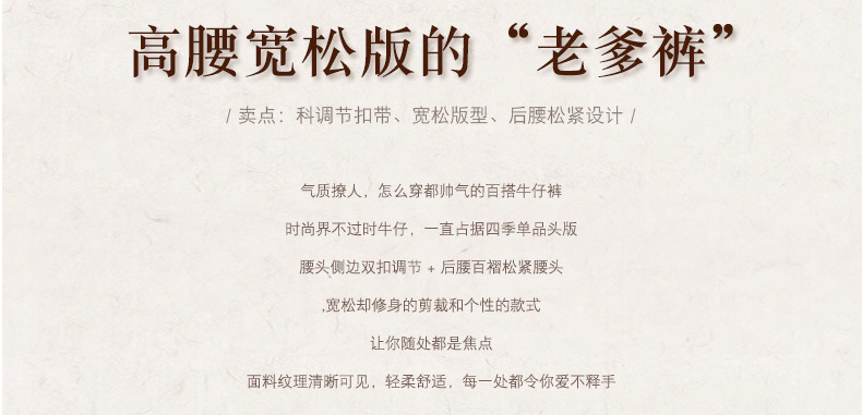 风靡牛仔界的时尚,当季帅气当道,高腰宽松版的老爹裤,看得见的质感久穿不变形,气质撩人,让你随处都是焦点~~
