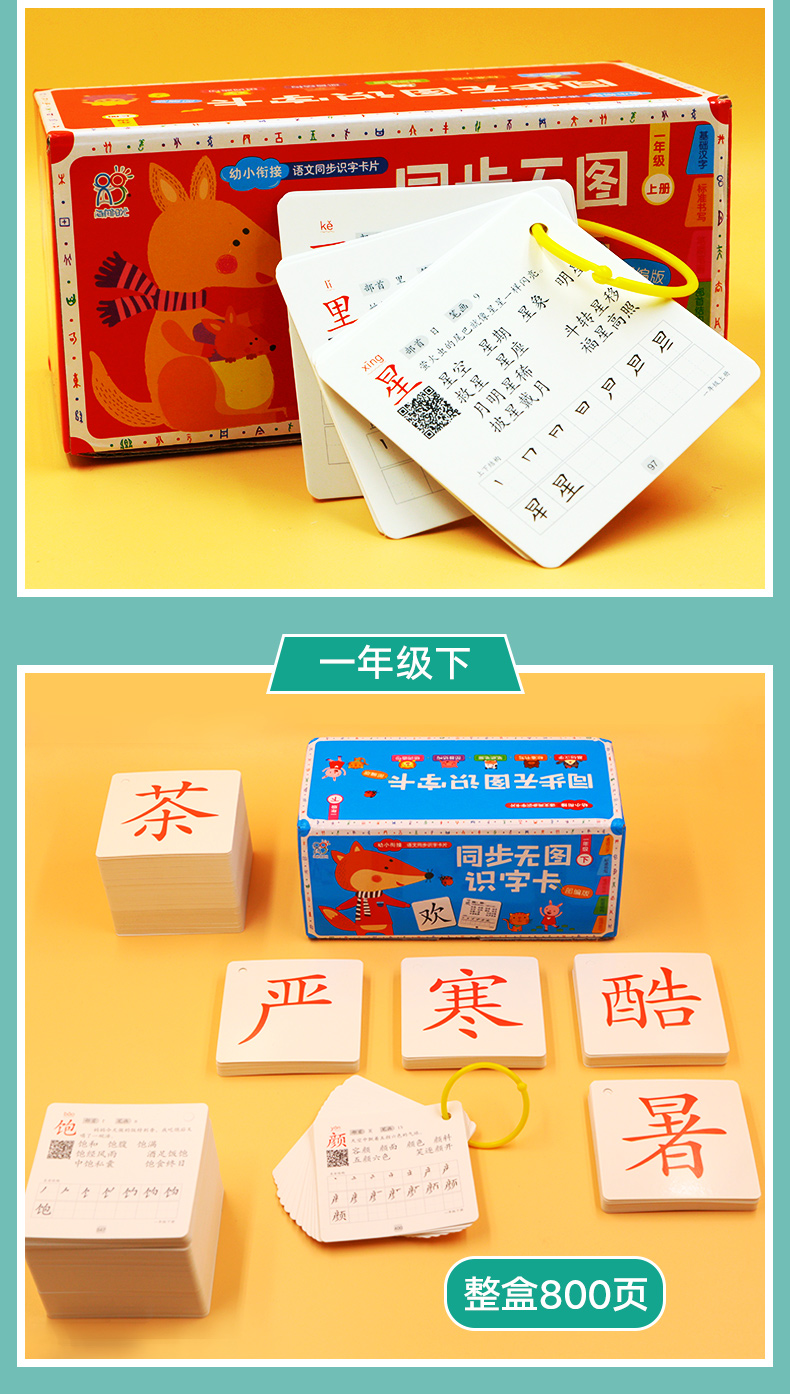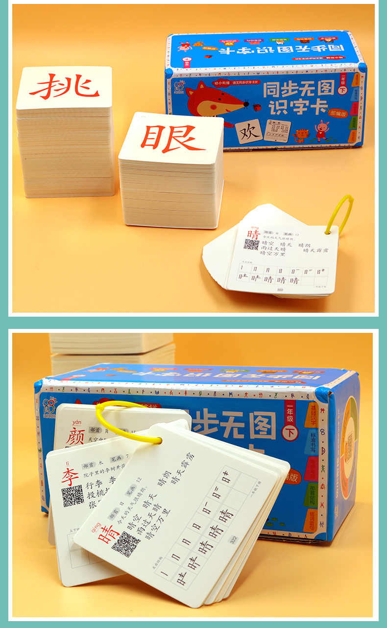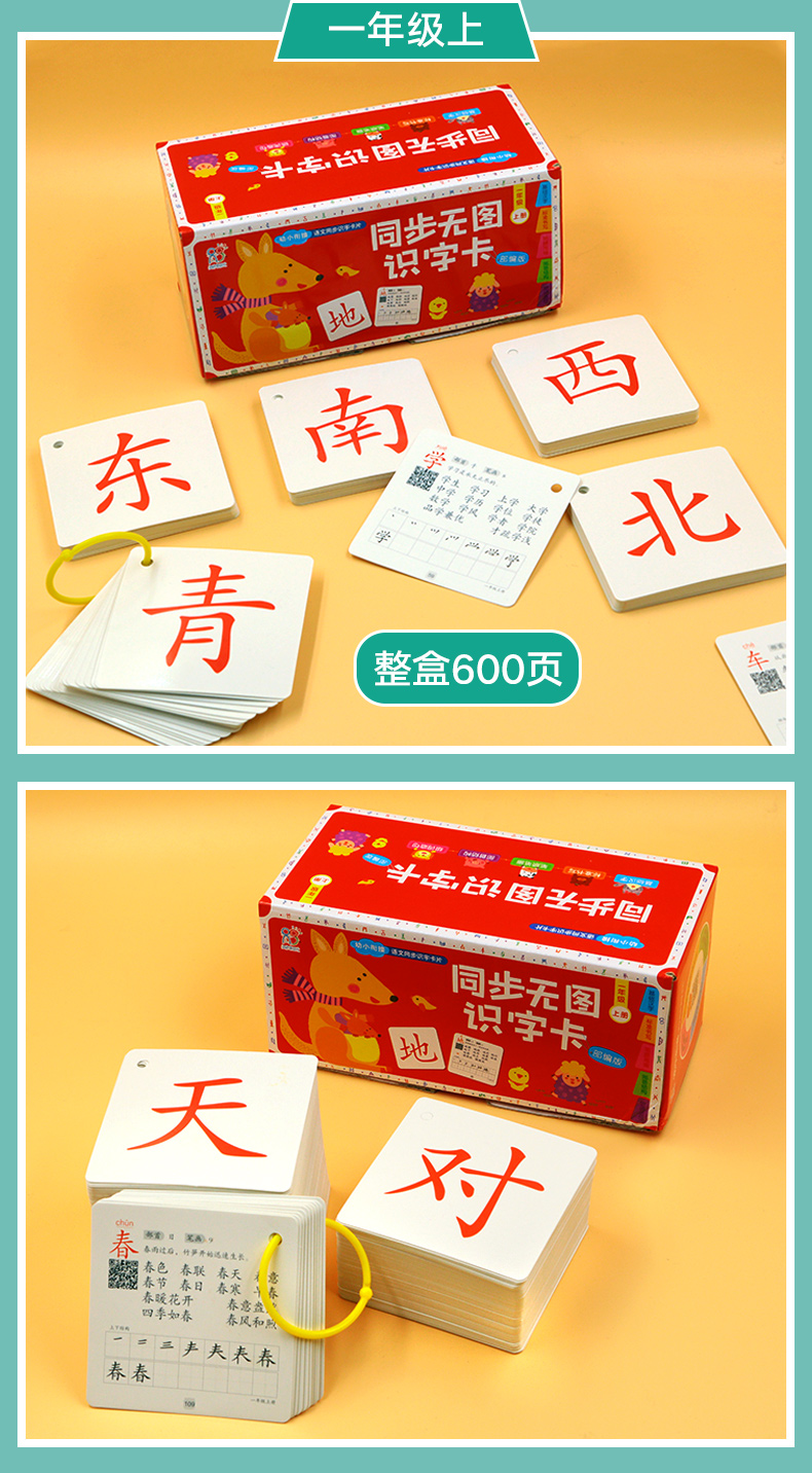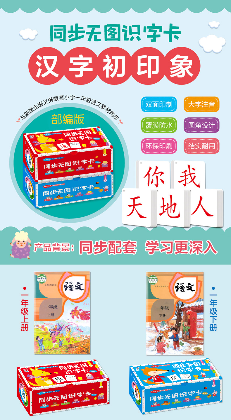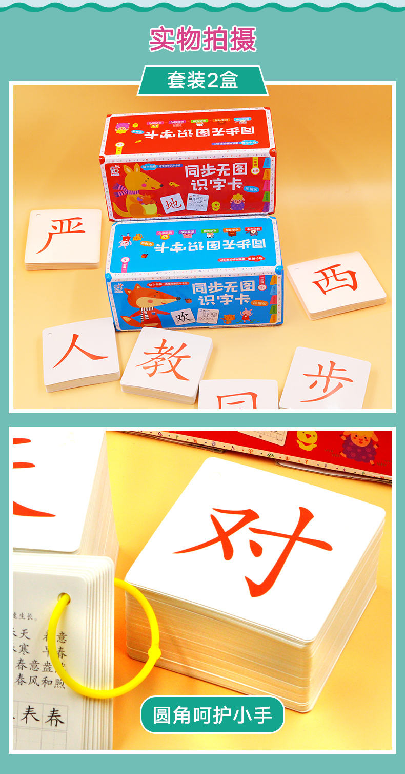 儿童早教启蒙无图生字,语文认字卡,2018年新版,人教同步,一年级上下册无图识字。双面印制,大字注音,覆膜防